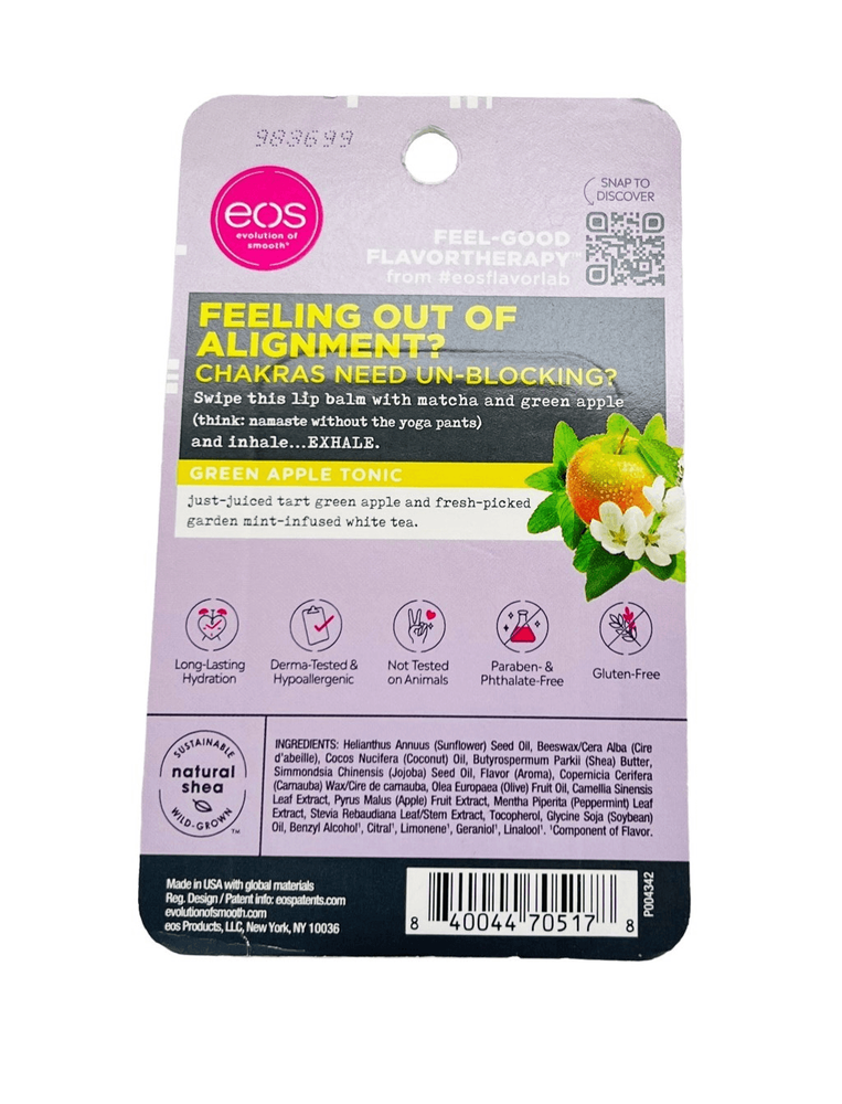 EOS Lip Balm Exhale Green Apple Tonic Mint Tea Matcha Flavor Therapy Brand New Thank you for looking *packaging may vary as there are multiples available available. Super soft Shea lip balm, two pack sticks Green apple and mint tea with Matcha- just juiced tart green apple and fresh picked garden mint infused white tea. Long lasting hydration Dermatologist tested Hypoallergenic Not tested on animals Gluten-free Paraben free Phthalate free