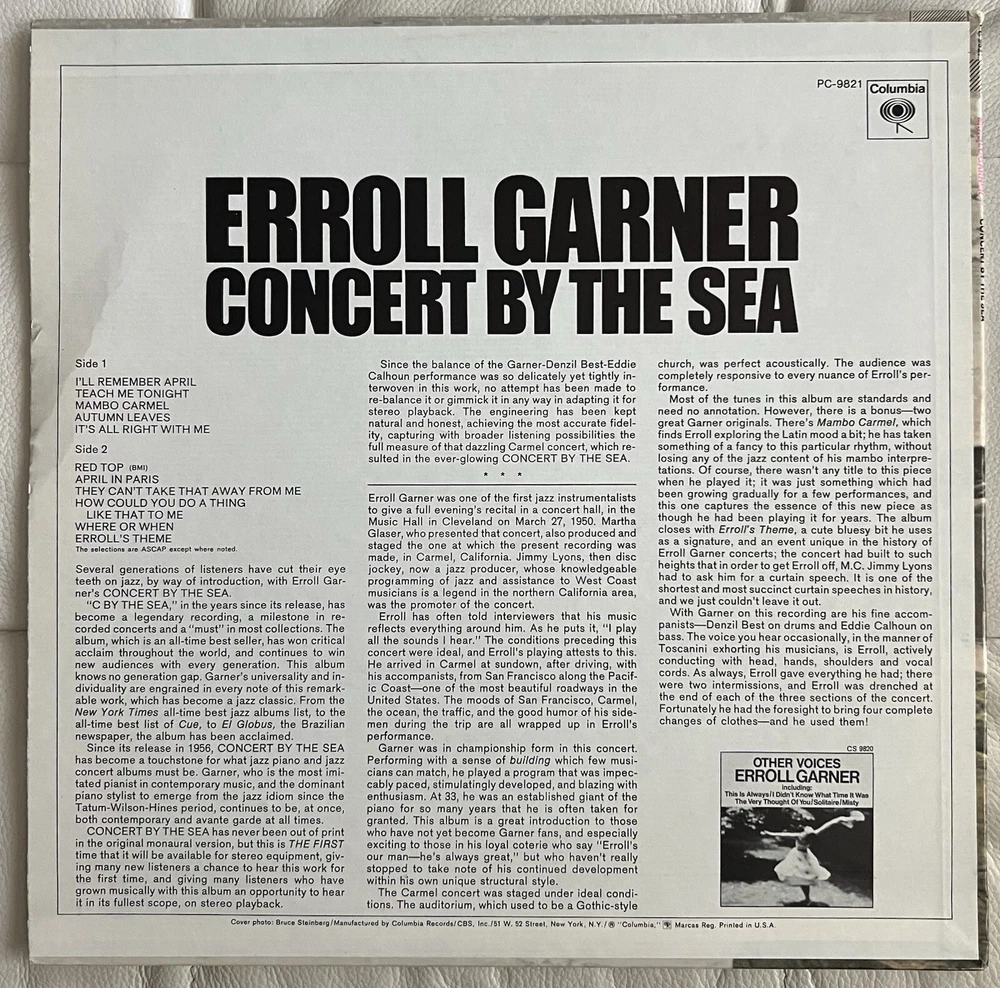 The album was recorded on September 19, 1955, in the gothic-revivalist styled assembly hall of Sunset School (now Sunset Center) in Carmel-by-the-Sea, California, a welcoming space being used as part of local promoter Jimmy Lyons' "Sunset Series", this series in turn laying the groundwork for the beginnings of the Monterey Jazz Festival. From nearby Fort Ord military base servicemen were bused to join the enthusiastic and receptive audience at this Erroll Garner Trio gig.Accompanying Garner were bassist Eddie Calhoun and drummer Denzil Best. According to Columbia Records and its owner, Sony Music Entertainment, the acoustics were poor and the piano somewhat out of tune. The balance of instruments on the recording was also poor; the bass and drums were receded. There was no plan to record the concert officially. The release came about because Garner's personal manager, Martha Glaser, spotted backstage that a tape recorder was running. The recording was being made by a recording engineer for the Armed Forces Radio Network, "a jazz fan and scholar named Will Thornbury, strictly for the enjoyment of himself and his fellow servicemen". Glaser took the tape, put it into album form, and then played it for the head of Columbia Records' jazz division, George Avakian, who decided to release it. The original LP was released by Columbia as catalog number CL 883; an "electronically rechanneled to simulate stereo" version, with catalog number CS 9821, was issued in 1969. Unplayed and stored. GORGEOUS glossy cover. Minor corner bumps and a crease on the side from shelf storage. Do NOT let this one pass. A perfect gift for any Erroll Garner or Cool Jazz fan! Vinyl grade: NM- Cover grade: VG+ ……………………………………………………………… ALL Unsealed Records were Ultrasonically cleaned using my Kirmuss Audio KA-RC-1 Ultrasonic Record Cleaner. PLEASE SEE THE BELOW explanation for my grading scale to understand how I assess the quality of my vinyl LP collection. I use a combination of the industry standard Goldmine Grading Scale as well as a 1-10 scale to ensure a clear and accurate account of each album’s condition. Cover/Sleeve Grading applies to OUTER SLEEVE ONLY. If the original Inner sleeve is included it will be shown in the photos. Please ask any additional questions regarding inner sleeve or album condition BEFORE purchase! I am not a professional grader and strive to evaluate the item according to my 60 years as an audiophile collector. THE SCALE IS AS FOLLOWS: VINYL: 9) NEAR MINT (NM OR M-) A good description of a NM record is “it looks like it just came from a retail store and it was opened for the first time.” In other words, it’s nearly perfect. Many dealers won’t use a grade higher than this, implying (perhaps correctly) that no record or sleeve is ever truly perfect. NM records are shiny, with no visible defects. Writing, stickers or other markings cannot appear on the label, nor can any “spindle marks” from someone trying to blindly put the record on the turntable. Major factory defects also must be absent; a record and label obviously pressed off center is not Near Mint. If played, it will do so with no surface noise. (NM records don’t have to be “never played”; COVERS: 9) NEAR MINT (NM), Looks as if it just came from a store and was opened for the first time, maybe played a few times if ever, no evidence of play or wear whatsoever. Very minor corner “bumps” due to shelf or box storage. 8) VERY GOOD PLUS (VG+) VG+ covers should have only minor wear. A VG+ cover might have some very minor seam wear or a split (less than one inch long) at the bottom, the most vulnerable location. Also, a VG+ cover may have some defacing, such as a cut-out marking. Covers with cut-out markings can never be considered Near Mint. All LP’s have been stored in Acid-Free, Anti-Dust, Vinyl Record Jacket/LP Outer Sleeves. All vinyl have been protected with Archival, Static-Free, Audiophile Quality Inner Sleeves. I do NOT collect or sell anything that is less than these grades! My collection is audiophile quality. It is all premium quality and does not compare to the garage sale beaters that are plentiful on Marketplace. All vinyl were handled with cotton gloves to avoid fingerprint oil and most played once or twice and transferred to Studer A800 reel to reel recording deck since in 1978 or WAV recording on a Windows computer via a Audio-Technica AT-ML180 PC-OCC with Gold-Plated Boron Pipe Cantilever and MicroLine style mounted on a The Linn Sondek LP12 turntable. See my other listings for my large family estate sale of collectibles, sports memorabilia, audiophile vinyl LPs & CDs, signed books from major celebrities & world figures and vintage toys. All proceeds go to charity. This has been in storage for 40+ years, time to pass it on so it can be enjoyed by somebody else. See pics for all condition or details. All of my items come from a smoke and pet free environment. They are stored in a dry clean location. Most items are vintage and I will do my best to note any flaws in the description. No returns, ask questions re: condition here, on EBay. Thanks!