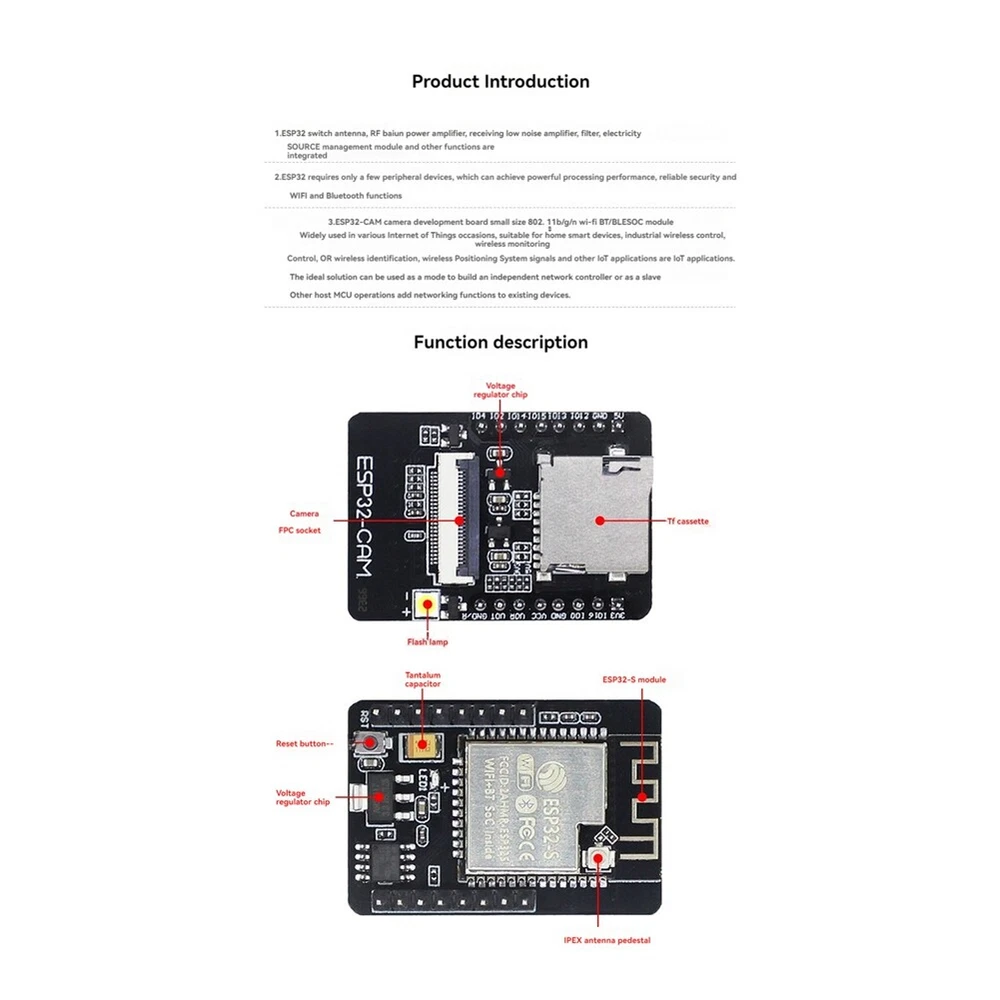 ESP32-CAM-Entwicklungsboard WiFi-Modul ESP32 WIFI Bluetooth IoT Motherboard2654 1. 32-Bit Dual-Core-CPU mit geringem Stromverbrauch, kann als Anwendungsprozessor verwendet werden 2. Hauptfrequenz bis zu 240 MHz, Rechenleistung bis zu 600 MIPS 3. Eingebautes 520 KB , externes 4M PSRAM 4. Unterstützt UART/SP/I2C/PWM/ADC/ und andere Schnittstellen 5. Unterstützt OV2640- und OV7670-Kameras, eingebauter 6. Unterstützt das Hochladen von Bildern über WLAN 7. Unterstützt TF-Karte 8. Unterstützt mehrere Schlafmodi 9. Embedded wip und FreeRTOS 10. Unterstützt den STA/AP/STA+AP-Arbeitsmodus 11. Unterstützt SMart Confing/Airkiss Netzwerkkonfiguration mit nur einer Taste 12. Sekundärentwicklung unterstützen Aufgrund unterschiedlicher Chargen kann es zu Unterschieden im Aussehen, der Farbe und dem aufgedruckten Text des Produkts kommen, die jedoch keinen Einfluss auf die Verwendung haben. Farbe: Schwarz Material: PCB Paketinhalt: 1x Entwicklungsboard