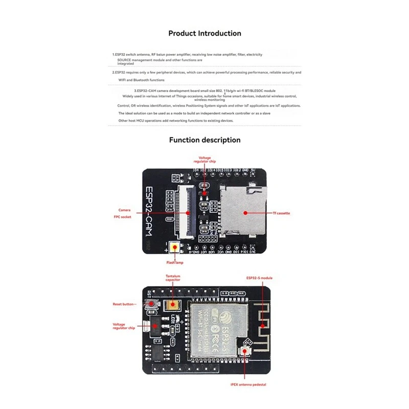 ESP32-CAM-Entwicklungsboard WiFi-Modul ESP32 WIFI Bluetooth IoT Motherboard3295 {LIS_PIC} 1. 32-Bit Dual-Core-CPU mit geringem Stromverbrauch, kann als Anwendungsprozessor verwendet werden 2. Hauptfrequenz bis zu 240 MHz, Rechenleistung bis zu 600 MIPS 3. Eingebautes 520 KB , externes 4M PSRAM 4. Unterstützt UART/SP/I2C/PWM/ADC/ und andere Schnittstellen 5. Unterstützt OV2640- und OV7670-Kameras, eingebauter 6. Unterstützt das Hochladen von Bildern über WLAN 7. Unterstützt TF-Karte 8. Unterstützt mehrere Schlafmodi 9. Embedded wip und FreeRTOS 10. Unterstützt den STA/AP/STA+AP-Arbeitsmodus 11. Unterstützt SMart Confing/Airkiss Netzwerkkonfiguration mit nur einer Taste 12. Sekundärentwicklung unterstützen Aufgrund unterschiedlicher Chargen kann es zu Unterschieden im Aussehen, der Farbe und dem aufgedruckten Text des Produkts kommen, die jedoch keinen Einfluss auf die Verwendung haben. Farbe: Schwarz Material: PCB Paketinhalt: 1x Entwicklungsboard