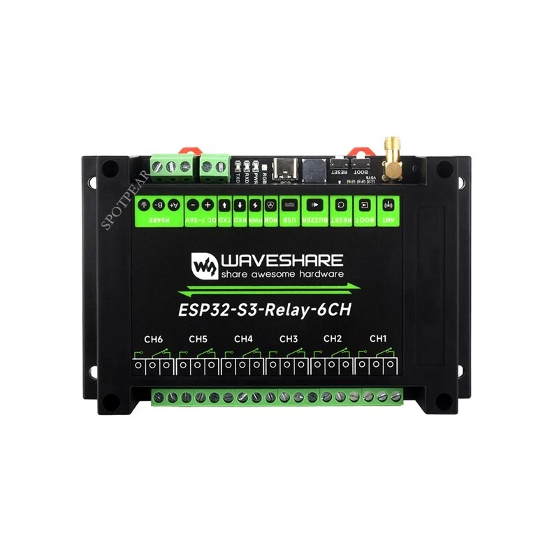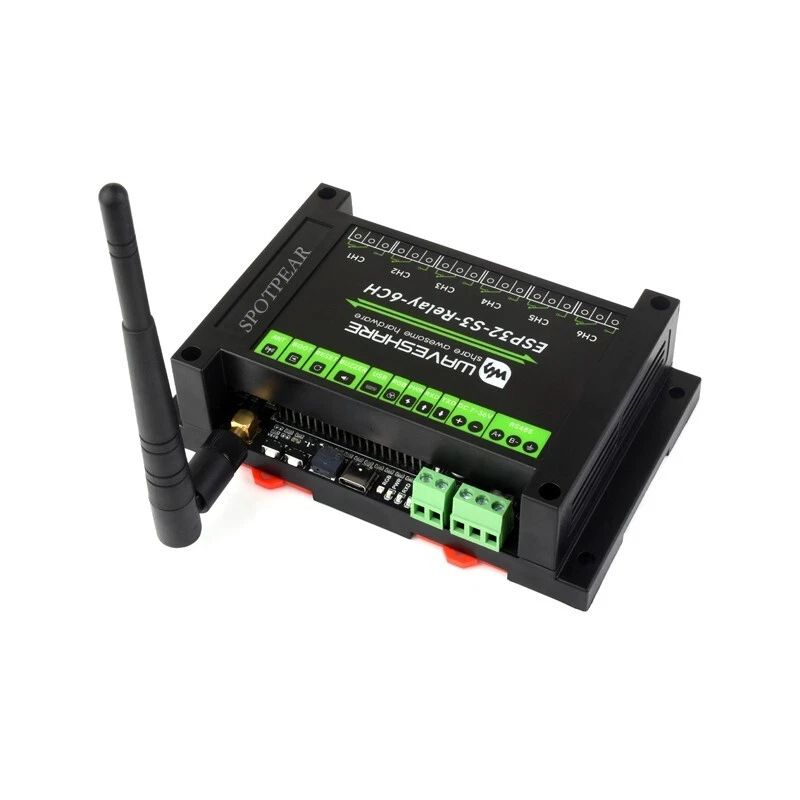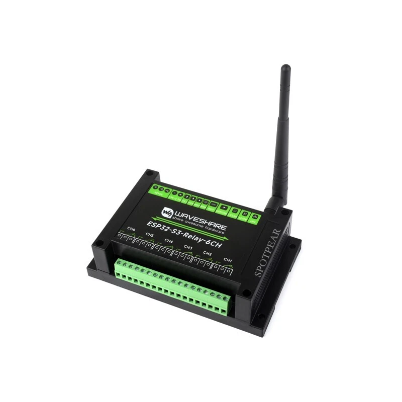 】Product Describion Industrial 6-Ch ESP32-S3 WiFi Relay Module Based on ESP32-S3, Supports WiFi / Bluetooth, Onboard RS485 / Pico HAT interfaces Built-In Protection Circuits Such As Power Isolation And Optocoupler Isolation, Safe & Stable & Reliable 】Features At A Glance [] Based on ESP32-S3 microcontroller with Xtensa 32-bit LX7 dual-core processor, capable of running at 240 MHz [] Integrated 2.4GHz Wi-Fi and Bluetooth LE dual-mode wireless communication, with superior RF performance [] High quality relay, contact rating: ≤10A 250VAC/30VDC [] Onboard isolated RS485 interface, for connecting to various RS485 Modbus industrial modules or sensors [] Onboard 40PIN header compatible with some Raspberry Pi Pico HAT, for expanding more functions such as RTC / CAN / RS232 / LoRa / sensor, etc. [] Onboard USB Type-C port for power supply, firmware downloading and debugging [] Onboard power supply screw terminal, supports 7~36V wide voltage input, suitable for industrial applications [] Onboard optocoupler isolation to prevent interference from external high-voltage circuit connected to the relay [] Onboard digital isolation to prevent interference from external signal [] Onboard unibody power supply isolation, providing stable isolated voltage, no extra power supply required for the isolated terminal [] Built in buzzer, RGB colorful LED, power supply and RS485 TX/RX indicators for monitoring the operating status of the module [] Rail-mounted ABS case, easy to install, safe to use 】Specifications Based On ESP32-S3, Designed For AIoT Market Equipped With Xtensa 32-Bit LX7 Dual-Core Processor, Capable Of Running At 240 MHz, With Powerful AI Computing Performance And Security Encryption Mechanism; Integrated 2.4GHz Wi-Fi And Bluetooth LE Dual-Mode Wireless Communication Onboard Multiple Isolation Protection Circuit Multiple Protections, More Safe And Reliable High Quality 6-Ch Relays, Supports RS485 And Bluetooth / WIFi Remote Control Contact Rating Of The Onboard Relay Up To 10A 250VAC/30VDC Directly Controlling 220VAC Home Appliances, Or Devices Below 30VDC Onboard Pico HAT Compatible Interface And RS485 Interface For Easy Expansion Onboard Isolated RS485 Interface, For Connecting To Various RS485 Modbus Industrial Modules Or Sensors. Onboard 40PIN Header Compatible With Some Raspberry Pi Pico HAT, For Expanding More Functions Such As RTC / CAN / RS232 / LoRa / Sensor, Etc. Supports Arduino, Micropython Development Comprehensive SDK, Dev Resources, And Tutorials To Help You Easily Get Started 】Application Examples Provides Multiple Networking Demos With Waveshare.Cloud, Using The Lightweight MQTT Protocol To Achieve Data Visualization Service 】What's On Board 1.ESP32-S3 up to 240MHz operating frequency, with 2.4GHz WiFi and BLE 2.6-channel quality relays contact rating per channel: ≤10A 250V AC or ≤10A 30V DC 3.Optocoupler isolation prevents interference from external high-voltage circuit connected to the relay 4.Digital isolation prevents interference from external signal 5.Power supply isolation provides stable isolated voltage, needs no extra power supply for the isolated terminal 6.TVS diode effectively suppresses surge voltage and transient spike voltage in the circuit 7.Ceramic gas discharge tube 8.Relay screw terminals for connecting with user devices 9.40PIN Raspberry Pi Pico HAT header 10.RS485 bus interface for connecting to external RS485 devices 11.Power supply screw terminal Supports DC 7~36V wide voltage input 12.LED indicators PWR: power indicator RXD: RS485 RX indicator TXD: RS485 TX indicator 13.WS2812 RGB LED controllable via GPIO38 14.USB Type-C connector for module power supply, firmware downloading and USB communication 15.Passive buzzer sound frequency is controllable via GPIO21 16.ESP32 RESET button 17.ESP32 BOOT button 18.External antenna connector SMA female connector, for WiFi and Bluetooth wireless communication 19.RS485 matching resistor jumper Onboard reserved 120R matching resistor, enabled via jumper 20.Relays default control pin setting 】Enclosure Design ABS Protection Enclosure With Rail-Mount Support, Easy To Install, Safe To Use 】Outline Dimensions Support Batch Customization Support Software And Hardware Customization Including Hardware Interface, LOGO, Label, Case And Web Page, Etc. Package Contains 1. ESP32-S3-Relay-6CH x1 2. 2.4G 4DB SMA antenna x1 3. Screwdriver x1