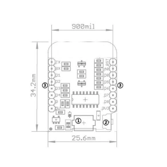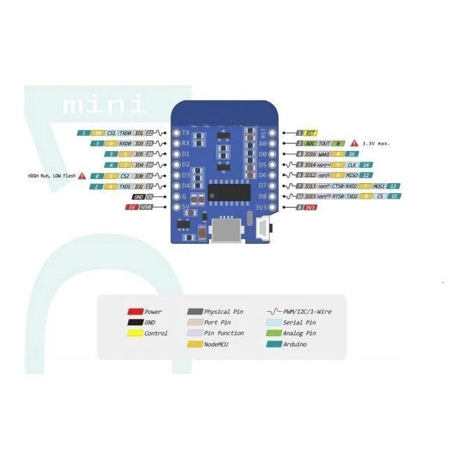ESP8266 ESP-12 ESP12 WeMos D1 Mini Module Wemos D1 Mini WiFi Development Board Micro USB 3.3V Based On ESP-8266EX 11 Dig The D1 mini is a mini wifi board based on ESP-8266EX. ESP-12F # 11 digital input/output pins, all pins have interrupt/pwm/I2C/one-wire supported(except D0) # 1 analog input(3.3V max input) # a Micro USB connection # Compatible withArduino # Compatible with nodemcu Technical specs Microcontroller = ESP-8266EX Operating Voltage = 3.3V Digital I/O Pins = 11 Analog Input Pins = 1 Clock Speed = 80MHz/160MHz FLash = 4M bytes Length = 34.2mm Width = 25.6mm Weight = 10g Pin Function ESP-8266 Pin TX TXD TXD RX RXD RXD A0 Analog in(max 3.3V) A0 D0 IO GPIO16 D1 IO, SCL GPIO5 D2 IO, SDA GPIO4 D3 IO,Pull-up GPIO0 D4 IO,pull-up,LED GPIO2 D5 IO, SCK GPIO14 D6 IO, MISO GPIO12 D7 IO, MOSI GPIO13 D8 IO,pull-down, SS GPIO15 G Gound GND 5V 5V - 3V3 3.3V 3.3V RST Reset RST Programming The D1 mini has a micro USB for auto programming. Also you can programming it using OTA Warnings All IO is work at 3.3V.