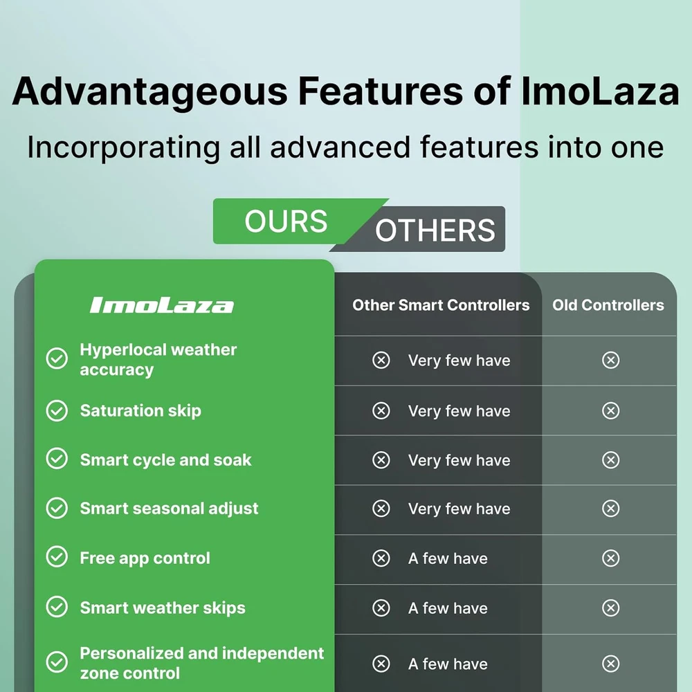 UPGRADED IMOLAZA ET MASTER 4: Building upon the ET Master 3's features and sleek design, the upgraded Gen 4 includes compatibility with flow meters, fault detection capabilities, real-time fault alerts, and terminal enhancements. This ensures an optimized irrigation process, saving water while maintaining the health of your lawn SCIENTIFICALLY PRECISE WATERING: ImoLaza considers factors like plant type, soil type, sprinkler type, slope, and sunlight to generate precise watering durations for each zone. It then adjusts the frequency based on advanced REAL-TIME ET algorithms, eliminating guesswork and water waste ULTRA-PRECISE WEATHER NETWORK: Thanks to exclusive hyperlocal weather forecasts and real-time data from 375,000 personal weather stations, ImoLaza automatically skips unnecessary watering with features like rain skip, wind skip, freeze skip, and more REMOTE CONTROL ANYWHERE: Take control of your sprinkler system from anywhere using the highly user-friendly ImoLaza app. Easily access watering schedules and monitor in REAL-TIME, eliminating the need to constantly run back and forth to the garage SUPER FLEXIBLE SCHEDULING: Effortlessly customize watering schedules via the app to meet your lawn's unique needs, weather conditions, and seasonal variations. ImoLaza's innovative New Grass Schedule stands out, offering up to 24 start times for high-frequency watering. Break free from the constraints of conventional controllers typically restricted to 4 fixed schedules or a single start time QUICK DIY INSTALLATION: Upgrade any standard sprinkler system to a SMART one with ImoLaza. Installation is a breeze, taking just 15-30 minutes without the need for special tools. ImoLaza offers straightforward plug-and-play functionality for beginners and advanced settings for experienced users. Experience efficient watering, save time, and conserve water effortlessly with this upgrade Product Description The upgraded ET Master 4th Gen is ImoLaza's latest smart sprinkler controller for demanding high-end residential applications. Loaded with innovative capabilities like state-of-the-art offline, valve, flow monitoring and smart alerts, it‘s a top choice for high-end irrigation projects. A big reason the ImoLaza ET Master Series is so unique is its Real-Time Evapotranspiration (ET) algorithm. With other add-on smart options like hyper-accurate local weather systems and superior Hardware, the ET Master 4th Gen's possibilities are all but limitless. Overwatering or underwatering negatively affects plant health, soil quality, and water conservation. However, determining how much water is lost to evapotranspiration and deciding when and how much to water is a challenge for any homeowner, even seasoned gardeners. Traditional methods relied on guesswork, while other sprinkler controllers depended on sensors or historical ET data. Fortunately, ImoLaza's Real-Time ET algorithm automates precise irrigation, providing a smarter and easier watering solution. ImoLaza’s Real-Time Evapotranspiration (ET) Technology represents the most advanced and precise irrigation method available today. With ImoLaza, there's no need for additional tools like soil moisture meters, personal weather stations, or rain sensors. The system seamlessly handles complex calculations, making smart watering decisions based on the actual conditions of your lawn and hyper-accurate local weather data. This intelligent system considers multiple variables, including plant types, sprinkler types, soil types, sunlight exposure, slope, and real-time weather factors like air temperature, humidity, wind speed, sunlight intensity, and precipitation. By calculating how much water is depleting from the lawn each hour and determining how much water to apply to maintain the plant-soil-water balance, ImoLaza provides a key factor that professionals use in determining an effective irrigation schedule. This approach sustains plant health and avoids water waste due to overwatering. ImoLaza ET Master reacts to unexpected weather events with a level of detail and precision unmatched by traditional methods, automating the entire process. It automatically generates preacise watering durations and scientifically adjusts the watering frequency daily, ensuring your lawn receives exactly what it needs. Enjoy peace of mind as your irrigation system intelligently adapts to real-time weather and season changes, keeping your plants healthy while conserving water and contributing to sustainable water management. Effortless Smart Irrigation : Transform your lawn care with minimal effort. ImoLaza does the hard work for you. Water Savings : Optimize water use and reduce your bills by up to 60%. Healthier Lawns : Ensure your lawn receives the perfect amount of water, promoting robust growth. Ease of Use : Simple setup, intuitive programming, remote control from anywhere, and reliable performance. Real-time Fault Detection and Alerts: Gain insight into potential issues in advance to prevent lawn discoloration or other irreversible damage. Every ImoLaza product is rigorously tested to meet our high standards. We are committed to quality and stand behind our products with unmatched customer support. Experience the future of smart irrigation with ImoLaza. Your lawn, water resources, and time are too valuable to waste. Only ImoLaza Uses Real-Time ET for Ultimate Water Efficiency and Plant Health ImoLaza ET Master: The Real Smart Watering Solution. Data shows that compared to traditional controllers, the Real-Time ET controller can save up to 60% of water. Even compared to controllers using historical ET data, the Real-Time ET controller significantly saves 30%-40% more water. Water with Precision Working with local weather and your sprinkler system, ImoLaza automatically adjusts the watering frequency based on a real-time evapotranspiration (ET) algorithm to water your lawn efficiently. Real-time Update Rather than using historical monthly averages of ET, ImoLaza continuously mon