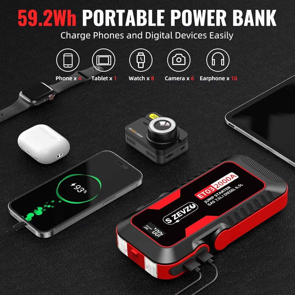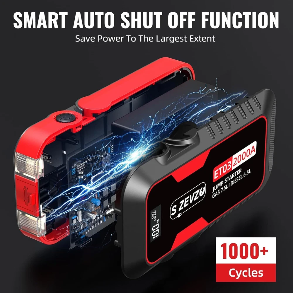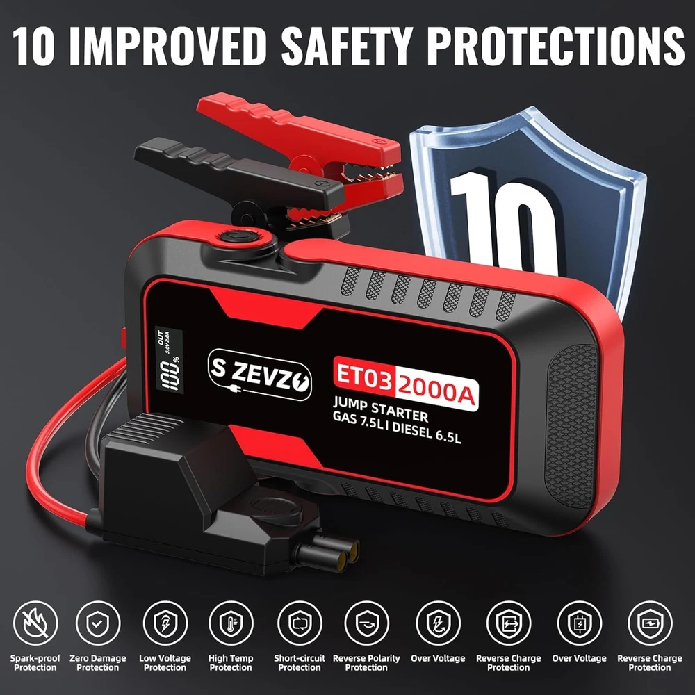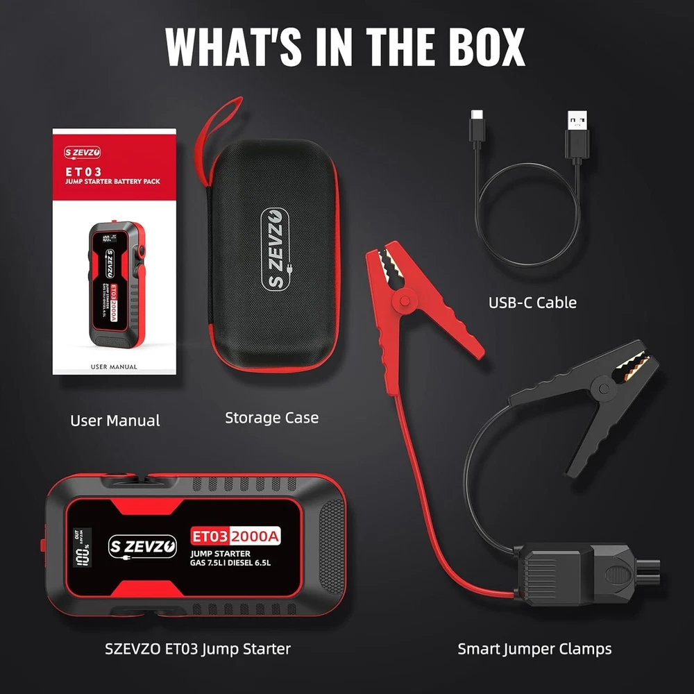 ET03 Car Jump Starter 2000A Jump Starter Battery Pack for Up to 7.5L Gas and 6.5L Diesel Engines, 59.2Wh Portable 12V Jump Box with USB Ports, LCD Display, Storage Case, and LED Light Product Details Brand: S ZEVZO Product Dimensions: 1.5"D x 3.4"W x 7.5"H Item Weight: 1.1 Pounds Amperage: 2000 Amps Peak Output Current: 2000 Amps Manufacturer: DONGGUAN CHUANGYI NEW ENERGY TECHNOLOGY CO., LTD Model: jump starter Item Weight: 1.1 pounds Item model number: ET03 Batteries: 1 Lithium Ion batteries required. (included) Manufacturer Part Number: ET03 Brand: S ZEVZO Product Dimensions: 1.5"D x 3.4"W x 7.5"H Item Weight: 1.1 Pounds Amperage: 2000 Amps Peak Output Current: 2000 Amps Battery Cell CompositionVoltage: Lithium Ion12 Volts Vehicle Service TypeBattery Capacity: Passenger Car, Motorcycle, RV, UTV, Truck, Tractor, Lawn MowerPassenger Car, Motorcycle, RV, UTV, Truck, Tractor, Lawn MowerPassenger Car, Motorcycle, RV, UTV, Truck, Tractor, Lawn Mower See more 16000 Milliamp Hours POWERFUL CAR BATTERY JUMP STARTER: The ET03 car battery jump starter can easily jump-start all 12V common vehicles with up to 7.5L gas and 6.5L diesel engines in seconds with its peak current reaching 2500 amps. Supports 40 jump starts at most on a single charge and suitable for lawnmowers, motorcycles, passenger cars, trucks, and even boats, etc. BACKUP PORTABLE POWER BANK: This jump starter battery pack can also work as a 59.2Wh large battery capacity portable power bank to charge your smartphones, tablets, or other USB electric devices. Two 5V/2A USB output ports are packed on this jump starter that can be applied at the same time for charging, 50% faster than a standard charger. PACKED WITH LED EMERGENCY LIGHT AND BONUS FEATURES : the ET03 car jump starter is packed with a 400-lumens LED flashlight to provide help in darkness or for emergency situations that support three variable light modes (stable, strobe, and SOS). There are more features included such as an LCD screen to check the battery status, a wide working temperature from -4℉ to 140℉, and 24 months long standby time. 10 INTELLIGENT SAFTY PROTECTIONS: This jump starter battery pack is super safe to use with 10 intelligent safety protections against overcharge, short circuits, reverse polarity, power surging and sparking, and so forth. You can detect the errors by simply checking the lights and the beep sound from the smart jumper clamps. WHAT YOU GET & SERVICE: the package you get includes 1 * SZEVZO ET03 Jump Starter, 1 * Smart Jump Cables, 1 * USB Type-C Charging Cable, 1 * Storage Case, 1 * User Manual. This jump starter is covered by our 2 years service, so please contact us if you have any questions or if you are facing any issues with this jump box.