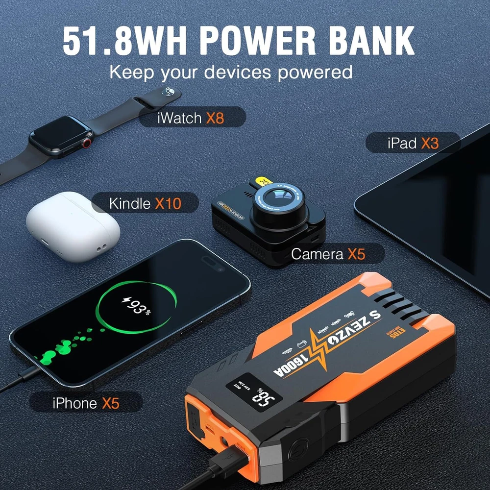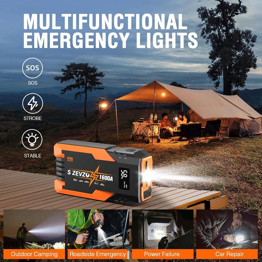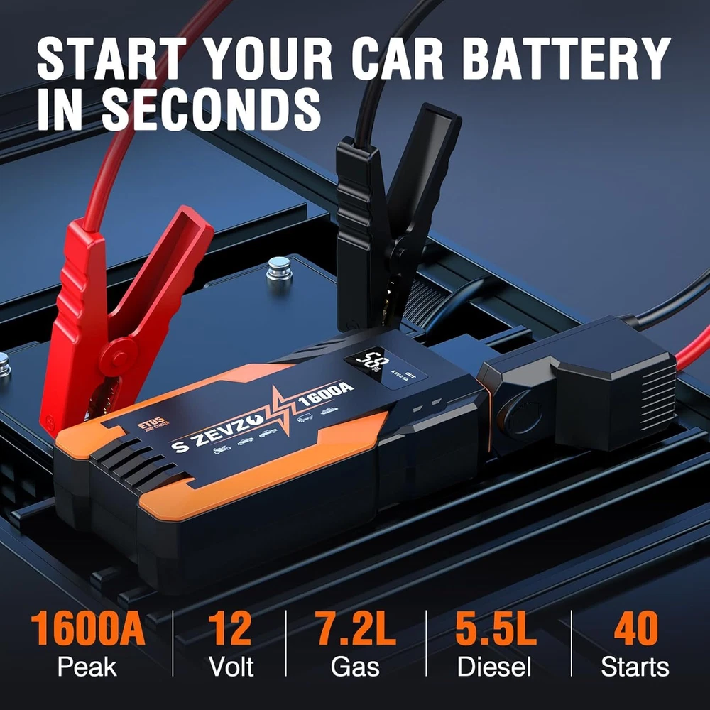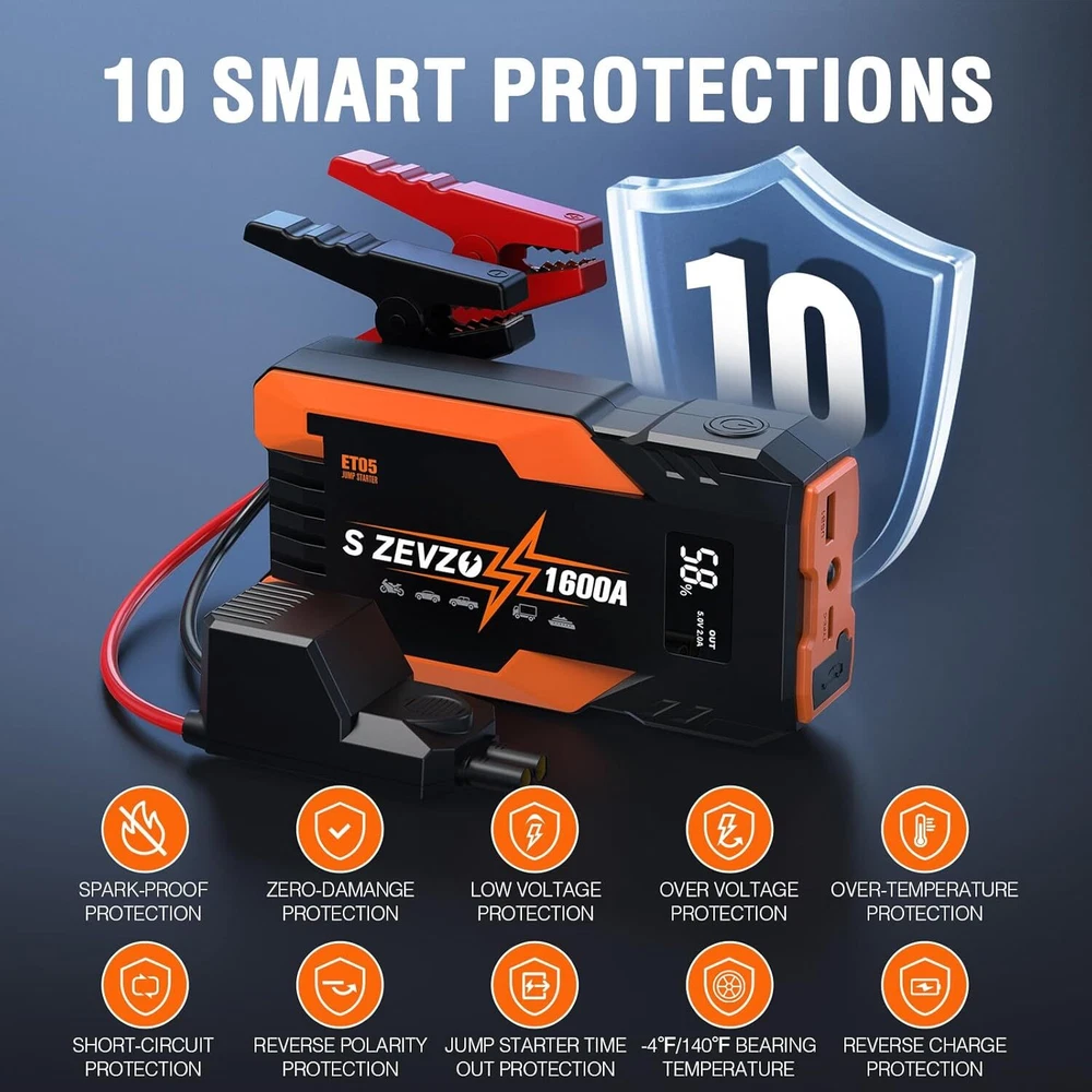 ET05 Jump Starter 1600A Portable Car Jump Starter Battery Pack for Up to 7.2L Gas and 5.5L Diesel Engines 51.8Wh 12V Jump Box with USB Ports, LCD Display and LED Light Product Details Brand: S ZEVZO Product Dimensions: 1.6"D x 3.1"W x 1.6"H Item Weight: 0.86 Pounds Amperage: 1600 Amps Peak Output Current: 1.6E+3 Amps Manufacturer: Dongguan Chuangyi New Energy Technology Co., Ltd Item Weight: 13.8 ounces Item model number: ET05 Batteries: 1 Lithium Ion batteries required. (included) Manufacturer Part Number: Chuangyi ET05 Brand: S ZEVZO Product Dimensions: 1.6"D x 3.1"W x 1.6"H Item Weight: 0.86 Pounds Amperage: 1600 Amps Peak Output Current: 1.6E+3 Amps Battery Cell CompositionVoltage: Lithium Ion12 Volts Vehicle Service TypeBattery Capacity: Passenger Car, Motorcycle, RV, UTV, Truck, Tractor, Lawn MowerPassenger Car, Motorcycle, RV, UTV, Truck, Tractor, Lawn MowerPassenger Car, Motorcycle, RV, UTV, Truck, Tractor, Lawn Mower See more 12000 Milliamp Hours 【 POWERFUL CAR JUMP STARTER 】 S ZEVZO ET05 car battery booster with 1600A peak current, which can easily jump-start all 12V common vehicles with up to 7.2L gas and 5.5L diesel engines in seconds. This car battery jump starter supports up to 40 jump starts at most on a single charge and suitable for lawnmowers, motorcycles, passenger cars, trucks, and even boats, etc. In an emergency, you no longer have to wait helplessly at the roadside for help. You can easily and quickly solve problems by yourself! 【 10 PROTECTIONS SAFTY BATTERY STARTER 】 This portable lithium jump starter is super safe to use with 10 intelligent safety protections against overcharge, short circuits, reverse polarity, power surging and sparking, and so forth. The motorcycle booster pack also has heavy-duty clamps and cables to provide versatile protection systems, no need to worry about incorrect connections or sparks. You can detect the errors by simply checking the lights and the beep sound from the smart jumper clamps. Our jumper cable have excellent conductivity and durability, and can reduce wear caused by long-term use within temperatures -4 °F~140 °F. 【 BACKUP PORTABLE CAR BATTERY PACK 】 You can also use this portable jump starter battery pack as a 51.8Wh battery capacity portable power bank to charge your smartphones, tablets, or other USB electric devices. This battery booster jump starter pack equiped with USB OUTPUT (5V/2A) and Type-C INPUT (5V/2A 9V/2A), 50% faster than a standard charger. It also comes with a super bright LED light, which is used as an emergency flashlight with strobe and SOS signal, is great for camping, outdoors, indoors, emergencies, travel, etc. 【 DURABLE & LCD Display 】 Our portable car jump starter made of top quality EVA material, which can against unexpected bumps, dents, and scratches. The sturdy shell and waterproof design make the car starters better waterproof, dustproof and shockproof. There are more features included such as an LCD screen to check the usage status and remaining power clearly, the size of this jump starter is 6.3 inch*3.1 inch*1.6 inch, the weight is 0.86lbs, it is just a similar size to a 6.1inch phone, which makes it portable in your car emergency kit, glove box, or even bag. 【 WHAT YOU GET 】 S ZEVZO provides reliable product, 24 months of hassle-free service and lifetime technical support. The package include 1*Jump Starter, 1*Intelligent Jumper Clamps, 1* USB Line, 1*User Manual. Please feel free to contact us if you have any questions or if you are facing any issues with this jump box. 【TIPS❗❗❗ 】Before starting the car, please make sure the battery power of the jump starter is above 50%. After the car starts, please unplug the plug from the product, and then remove the clip on the battery. In addition, if you don't use it for a long time, it is recommended to charge the battery jumper starter every 2-3 months to keep the car start battery pack in a healthy state.