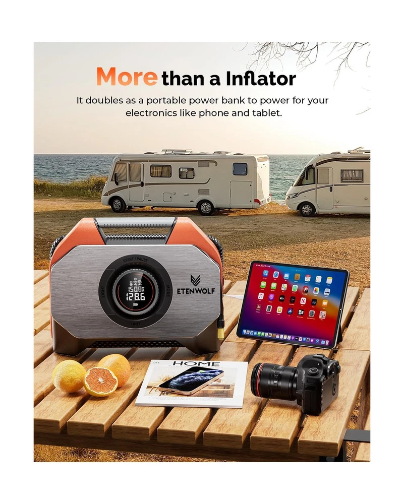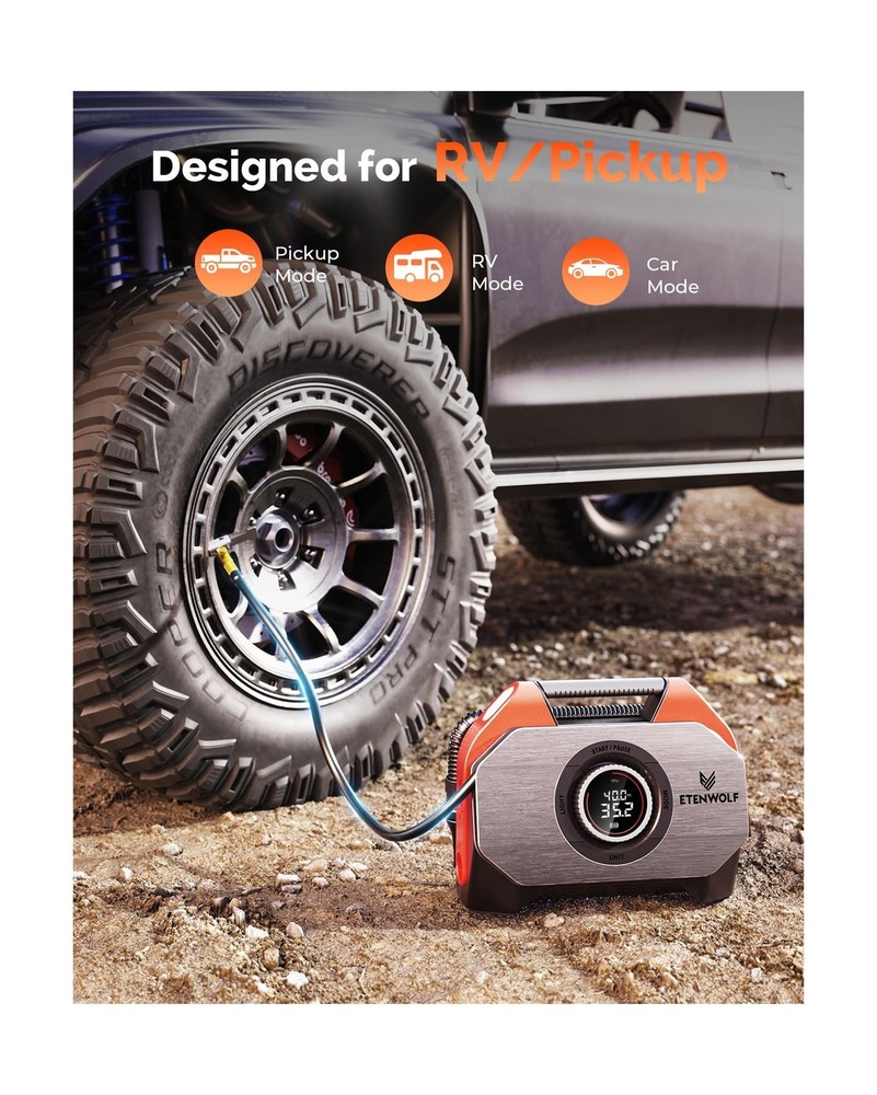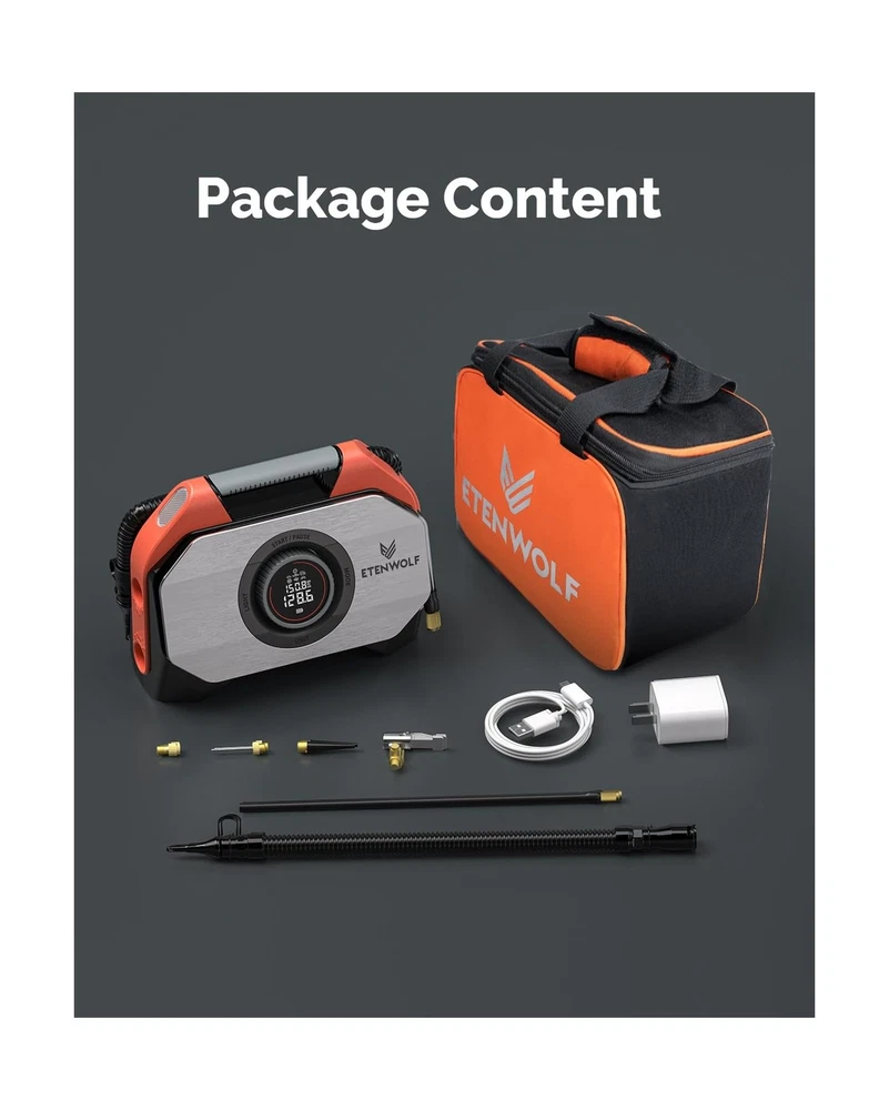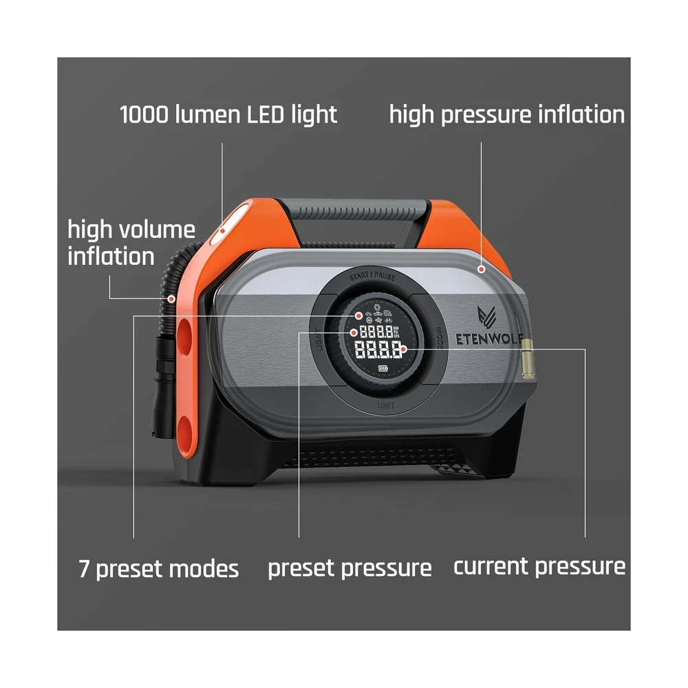 ETENWOLF VORTEX S6 Tire Inflator Portable Air Compressor for Heavy-duty Vehicle, Cordless Air Pump for Car & Inflatables with 19200 mAh Battery, 100% Duty Cycle & Dual Cylinder Bike Pump, Vivid Orange Description Features: ETENWOLF Vortex S6 cordless air compressor excels at inflating heavy-duty vehicles quickly, such as pickups, trucks, off-road vehicles, not to mention regular cars, bicycles, balls, pool floats, and air mattresses(Not for SUPs) ULTRA-FAST INFLATION: 1.5 CFM@0 PSI or 42 L/Min@0 PSI, Vortex S6 air pump fills a 31 tire in 1 minute (30-35 PSI), gauge accuracy +/-1 PSI, 160 PSI Max BUILT-IN 19200 mAh LITHIUM BATTERY: Vortex S6 can inflate 18 F150 tires (245 70/R17 31) from 30 to 35 PSI on full charge. Along with USB-C 45W dual-direction fast charging port, capable of both rapid charging and powering electronic devices 100% DUTY CYCLE: Highly durable dual-cylinder coupled with the dedicated cooling system, you can continuously inflate all four tires of F150 (245 70/R17 31") from 0 to 35 PSI, without the need for breaks in between AUTO STOP: The portable tire inflator for car stops automatically when the target pressure is reached, it also has seven preset modes and preset pressure memory. 1000 lumens LED light provides ample illumination in the darkness, you can even use it as a camping lantern Product Details: Brand: ETENWOLF Voltage: 12 Volts Recommended Uses For Product: Tire Inflation Power Source: Battery Powered Noise Level: 78 Decibels Brand: ETENWOLF Voltage: 12 Volts Recommended Uses For Product: Tire Inflation Power Source: Battery Powered Noise Level: 78 Decibels Special Feature: Automatic Stop, Cordless, Double Cylinder, Quick Inflation, inflate heavy-duty vehicles Included Components: S6 air compressor x1, air chuck x1, 45 W charger x1, nozzle x 2, ball needle x1, presta valve adapter x1 Item Weight: 6 Pounds Maximum Power: 0.75 Horsepower Capacity: 42 LPM Color: Vivid Orange Product Dimensions: 11.8"L x 5.5"W x 9.45"H Style: Portable Air Flow Capacity: 1.5 Cubic Feet Per Minute Motor Horsepower: 0.75 Horsepower Model Name: S6VO Hose Length: 45 Centimeters Maximum Operating Pressure: 160 Pound per Square Inch Manufacturer: ETENWOLF Part Number: S6VO Item Weight: 6 pounds Item model number: S6VO Batteries: 1 Lithium Ion batteries required. (included) Size: 19200 mAh Item Package Quantity: 1 Type of Bulb: LED Special Features: Automatic Stop, Cordless, Double Cylinder, Quick Inflation, inflate heavy-duty vehicles Batteries Included?: Yes Batteries Required?: Yes Battery Cell Type: Lithium Ion Warranty Description: 2 years Date First Available: August 25, 2023 Delivery We Do Not Ship Outside of the Continental US. Return Policy All items qualify for returns within 30 days of receipt. Buyer is responsible for return shipping on any item that is not damaged. Feedback We take our reputation seriously, we buy and sell online, so we understand the value of trust. If you are unsatisfied with your order, please contact us and we will work with you to resolve it to your satisfaction.
