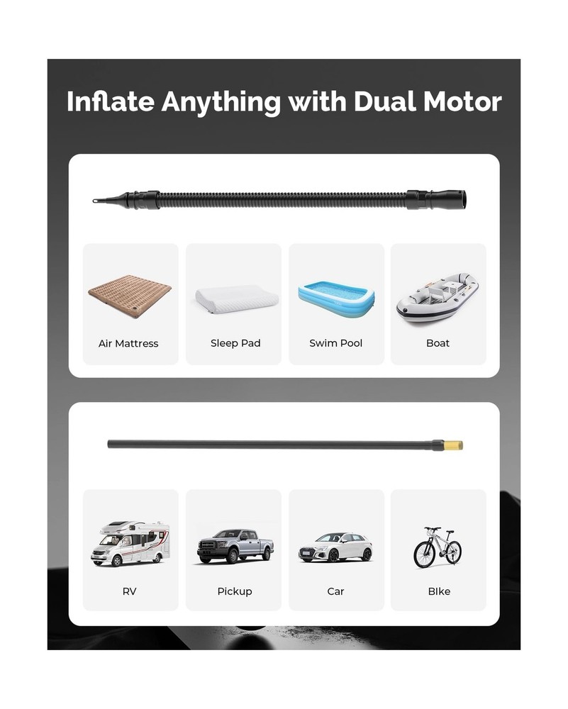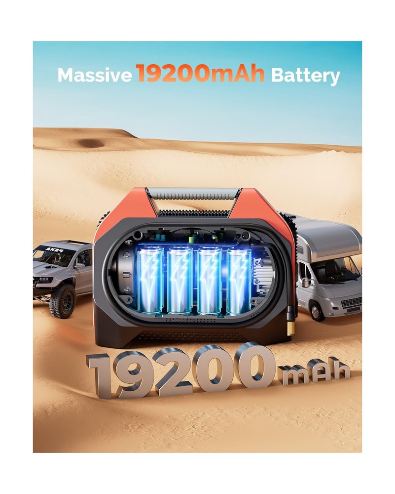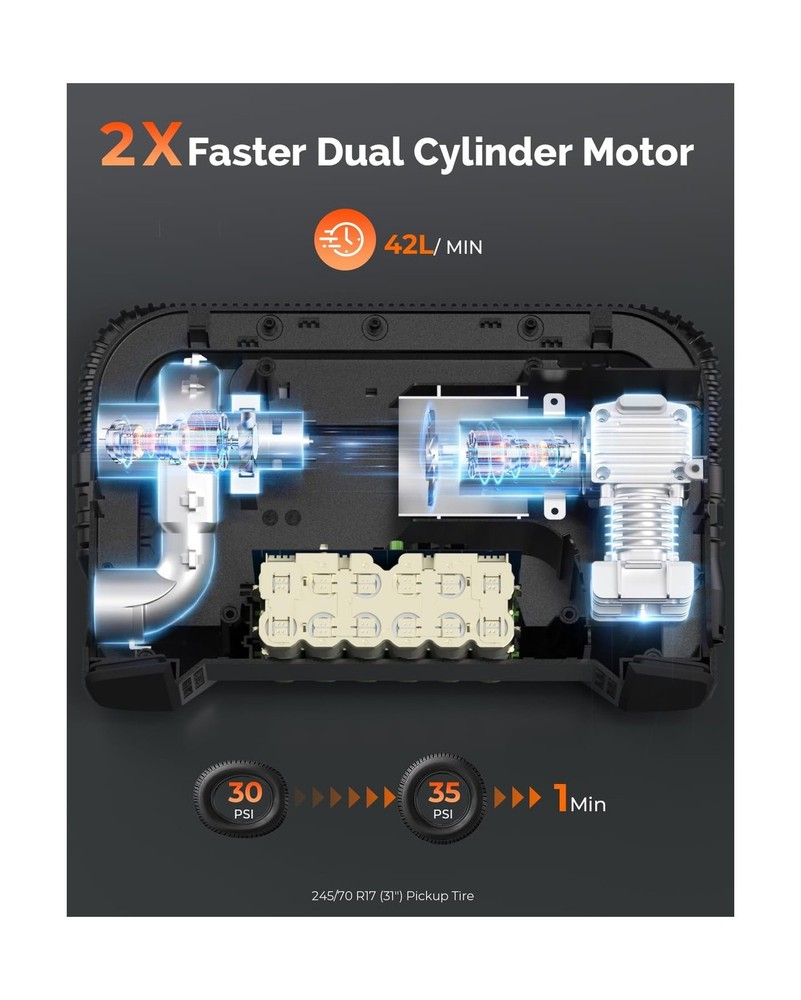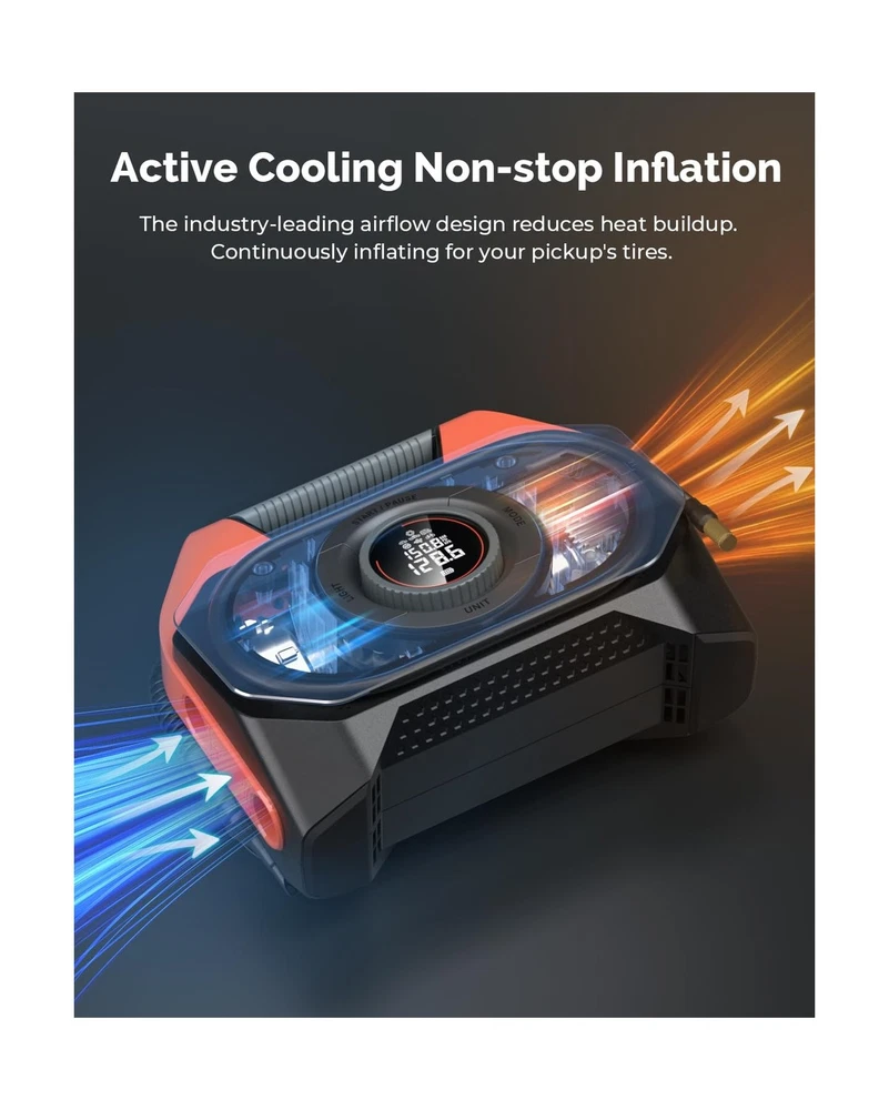 ETENWOLF VORTEX S6 Tire Inflator Portable Air Compressor for Heavy-duty Vehicle, Cordless Air Pump for Car & Inflatables with 19200 mAh Battery, 100% Duty Cycle & Dual Cylinder Bike Pump, Vivid Orange Description Features: ETENWOLF Vortex S6 cordless air compressor excels at inflating heavy-duty vehicles quickly, such as pickups, trucks, off-road vehicles, not to mention regular cars, bicycles, balls, pool floats, and air mattresses(Not for SUPs) ULTRA-FAST INFLATION: 1.5 CFM@0 PSI or 42 L/Min@0 PSI, Vortex S6 air pump fills a 31 tire in 1 minute (30-35 PSI), gauge accuracy +/-1 PSI, 160 PSI Max BUILT-IN 19200 mAh LITHIUM BATTERY: Vortex S6 can inflate 18 F150 tires (245 70/R17 31) from 30 to 35 PSI on full charge. Along with USB-C 45W dual-direction fast charging port, capable of both rapid charging and powering electronic devices 100% DUTY CYCLE: Highly durable dual-cylinder coupled with the dedicated cooling system, you can continuously inflate all four tires of F150 (245 70/R17 31") from 0 to 35 PSI, without the need for breaks in between AUTO STOP: The portable tire inflator for car stops automatically when the target pressure is reached, it also has seven preset modes and preset pressure memory. 1000 lumens LED light provides ample illumination in the darkness, you can even use it as a camping lantern Product Details: Brand: ETENWOLF Voltage: 12 Volts Recommended Uses For Product: Tire Inflation Power Source: Battery Powered Noise Level: 78 Decibels Brand: ETENWOLF Voltage: 12 Volts Recommended Uses For Product: Tire Inflation Power Source: Battery Powered Noise Level: 78 Decibels Special Feature: Automatic Stop, Cordless, Double Cylinder, Quick Inflation, inflate heavy-duty vehicles Included Components: S6 air compressor x1, air chuck x1, 45 W charger x1, nozzle x 2, ball needle x1, presta valve adapter x1 Item Weight: 6 Pounds Maximum Power: 0.75 Horsepower Capacity: 42 LPM Color: Vivid Orange Product Dimensions: 11.8"L x 5.5"W x 9.45"H Style: Portable Air Flow Capacity: 1.5 Cubic Feet Per Minute Motor Horsepower: 0.75 Horsepower Model Name: S6VO Hose Length: 45 Centimeters Maximum Operating Pressure: 160 Pound per Square Inch Manufacturer: ETENWOLF Part Number: S6VO Item Weight: 6 pounds Item model number: S6VO Batteries: 1 Lithium Ion batteries required. (included) Size: 19200 mAh Item Package Quantity: 1 Type of Bulb: LED Special Features: Automatic Stop, Cordless, Double Cylinder, Quick Inflation, inflate heavy-duty vehicles Batteries Included?: Yes Batteries Required?: Yes Battery Cell Type: Lithium Ion Warranty Description: 2 years Date First Available: August 25, 2023 Delivery We Do Not Ship Outside of the Continental US. Return Policy All items qualify for returns within 30 days of receipt. Buyer is responsible for return shipping on any item that is not damaged. Feedback We take our reputation seriously, we buy and sell online, so we understand the value of trust. If you are unsatisfied with your order, please contact us and we will work with you to resolve it to your satisfaction.