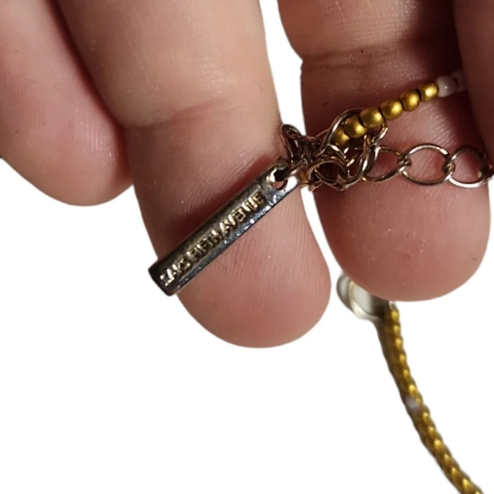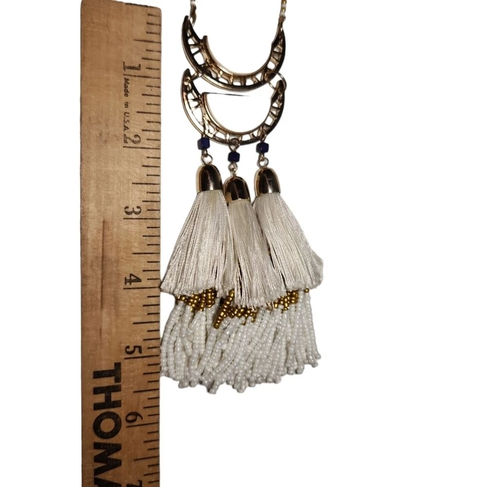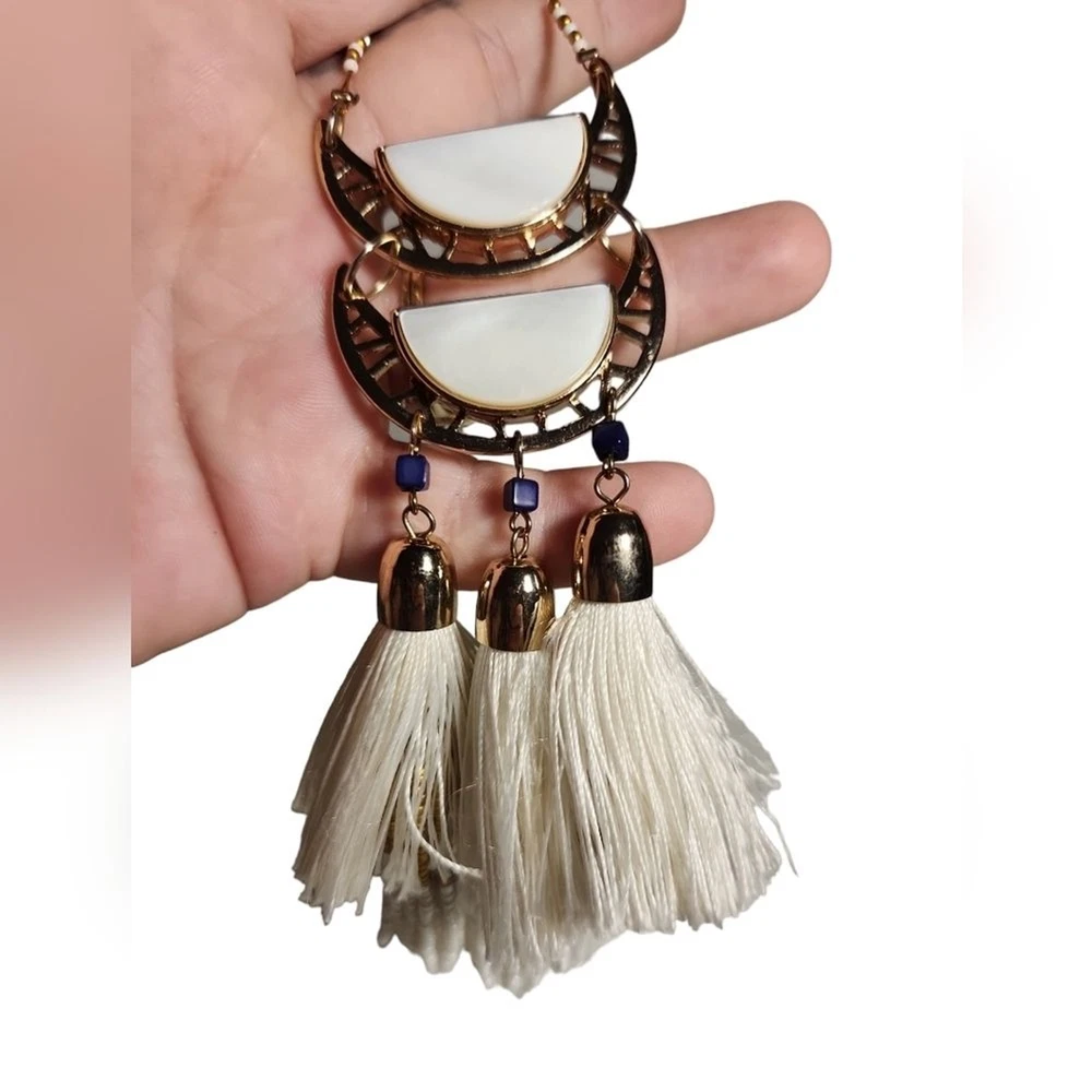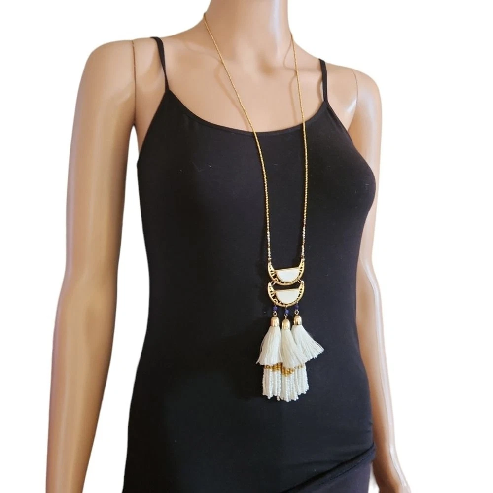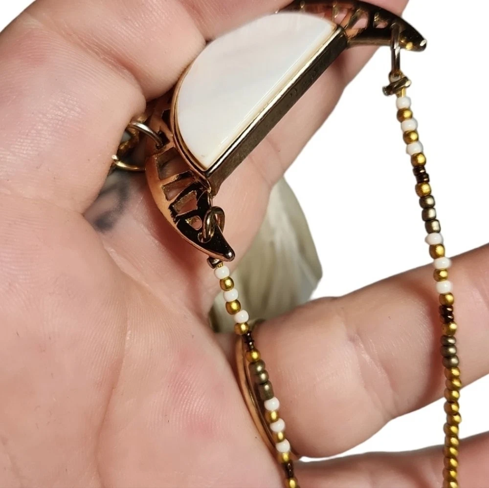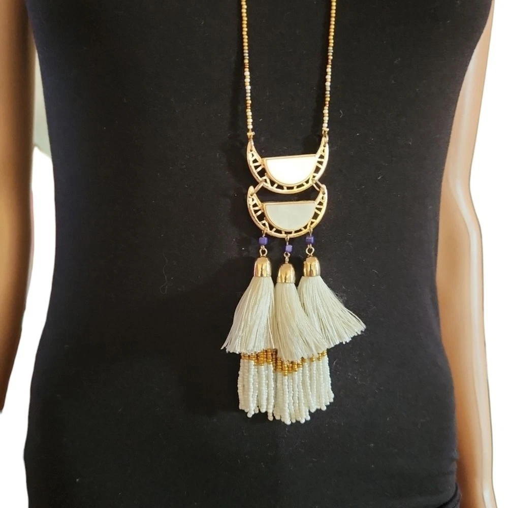 This is a pretty summer necklace in gold & white colors. It has a large, fringe tassel with some faux pearlized inlay and gold tone hardware. There are small gold and white seed beads strung on the 32" cord.