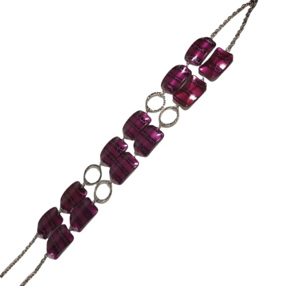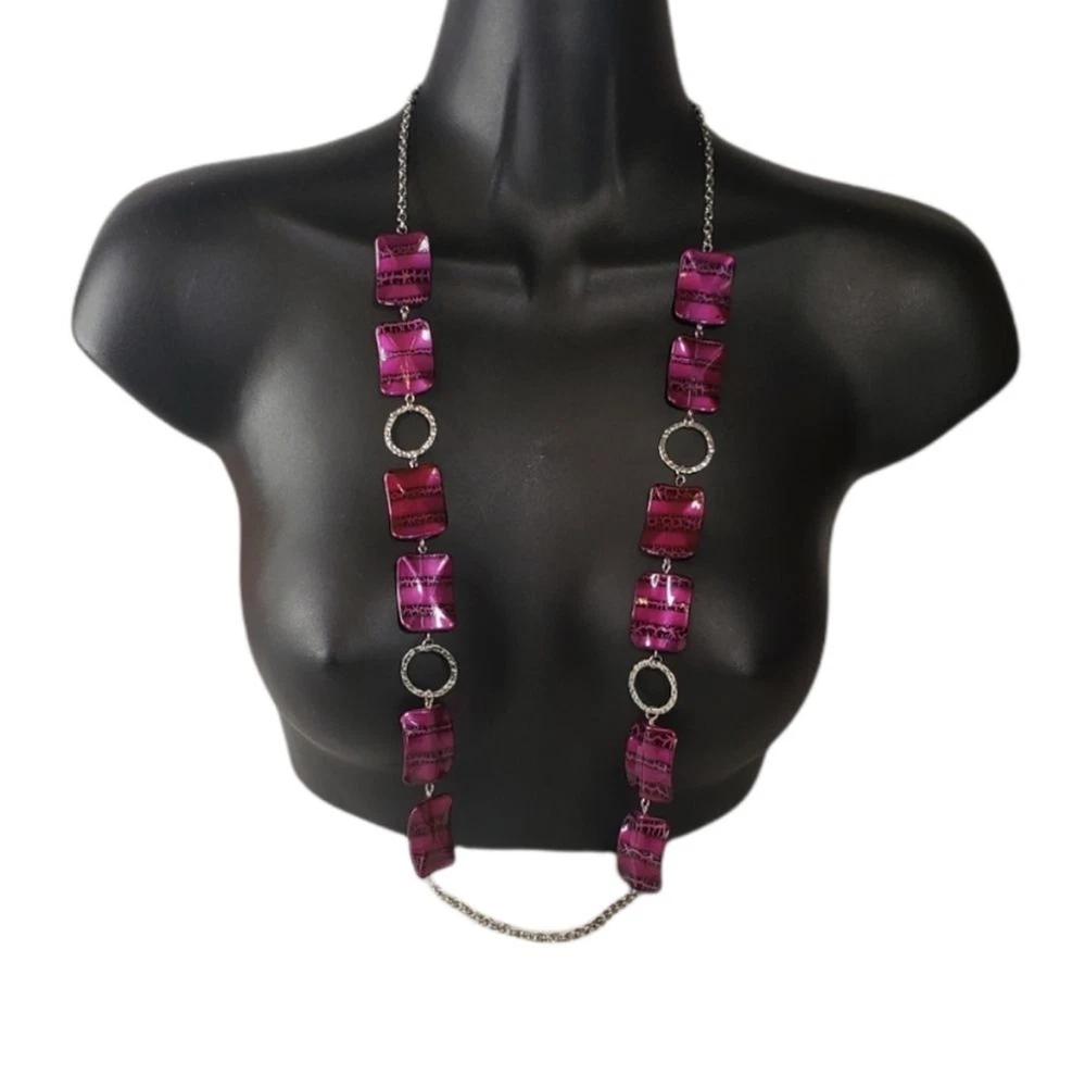 A cute royal purple necklace with silver tone hardware. Reminds me of Y2K business casual wear 😂 No issues and it measures approximately 36".