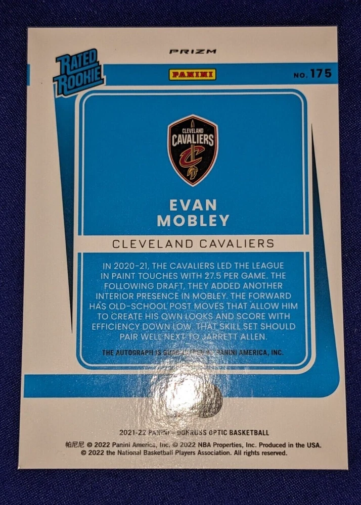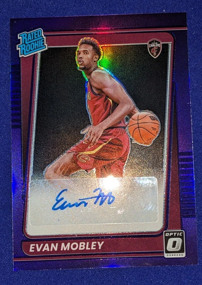 This Evan Mobley 2021-22 Panini Donruss Optic Rated Rookie Purple Autograph trading card is a must-have for any Cleveland Cavaliers fan or basketball card collector. The card features a beautiful Purple Holo Prizm design and is part of the 2021-22 Donruss set. This autographed card is a great investment for both short-term and long-term collectors. It is a rare parallel/variety that is sure to be a valuable addition to any collection. Don't miss out on the opportunity to own this amazing card.