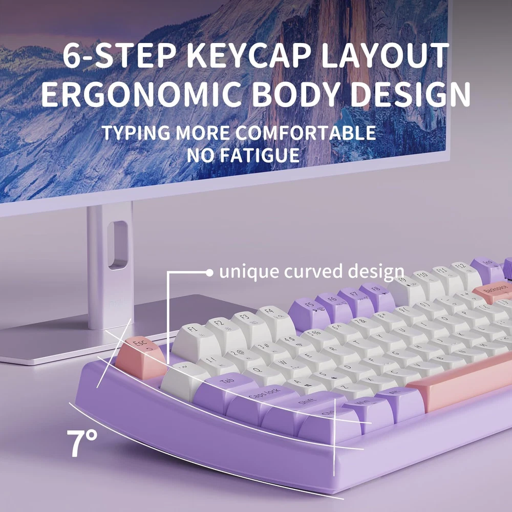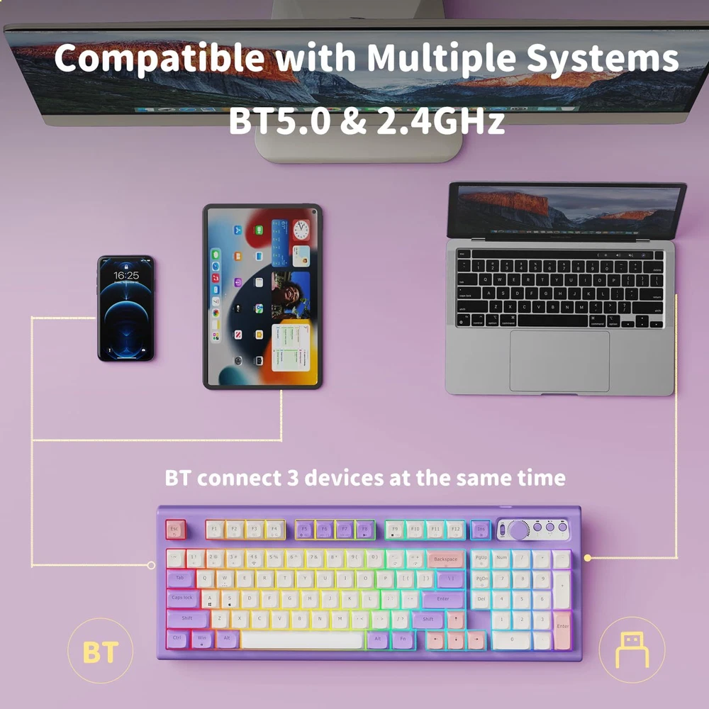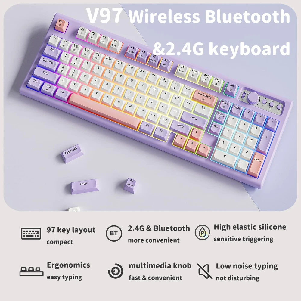 【Modes & Rechargeable】: EWEADN V97 cute keyboard wireless provides connection methods, Bluetooth 5.0 and 2.4GHz. Meet your work, game and study needs. Bluetooth can connect to three devices at the same time. "FN+1/2/3/4” can switch BT1/BT2/BT3/2.4G mode at any time. Built-in 2000mah energy-saving battery and equipped with Type-C cable. You can use this cable to charge the purple keyboard gaming any time. 【RGB Backlit Keyboard & 11 Effects】: V97 ligh up keyboard features RGB lighting color. With 11 pre-set lighting effects to add a great atmosphere to the game. 9 levels brightness for your choice, brightness and speed can be adjusted by the knob. You can select the single or rainbow color as wish. And if you can turn the backlight off if you do not need it. 【Unique Curved Body & Durable PBT keycaps】: RGB keyboard has unique design, and the body presents smooth arc. Tilt angle is about 7°, and the ergonomic stepped keycap layout can perfectly fit the arc of your fingers and wrists, easier to type and no longer feel tired at work or games. In addition, the wireless bluetooth keyboard uses smooth and delicate PBT keycaps, with rounded and smooth edges and great tactile feel. 【Volume & Light 2 in 1 knob and Power Display 】: No more fumbling for volume/light buttons or browsing menus to adjust volume/light. 2.4GHz/Bluetooth wireless gaming keyboard equipped with functional knob, easily adjust volume & light(11 types). Rotate the knob to adjust the brightness of the lights & volume. Press the knob for about 5s to switch modes. With power display light, clearly grasp the power of the cute keyboard white. Low battery indicator light flashes, the charging status indicator light is always on, and the full charge indicator light goes off. 【90% Compact Layout and Mac/Win Compatibility】: This 97-key layout EWEADN keyboard is compact and more practical, saving more desktop space while retaining the main function keys needed for office or gaming. More importantly, this bluetooth gaming keyboard wireless is fully with Mac, Windows and other systems, whether you are a MAC or WIN user, you can use the pc keyboard! Press and hold "Fn" & "A" to enter the Win system, and "Fn" & "S" to enter the Mac system. 【Doing Responsibly and Sustainably】: As a responsible company, EWEADN operates sustainably, to high environmental and social standards. We continue to embed sustainability ever deeper in the way we do business – in our own operations and beyond, together with our suppliers. The usb keyboard cute also comes with 24-month brand support. Our expert team always stands by your side.