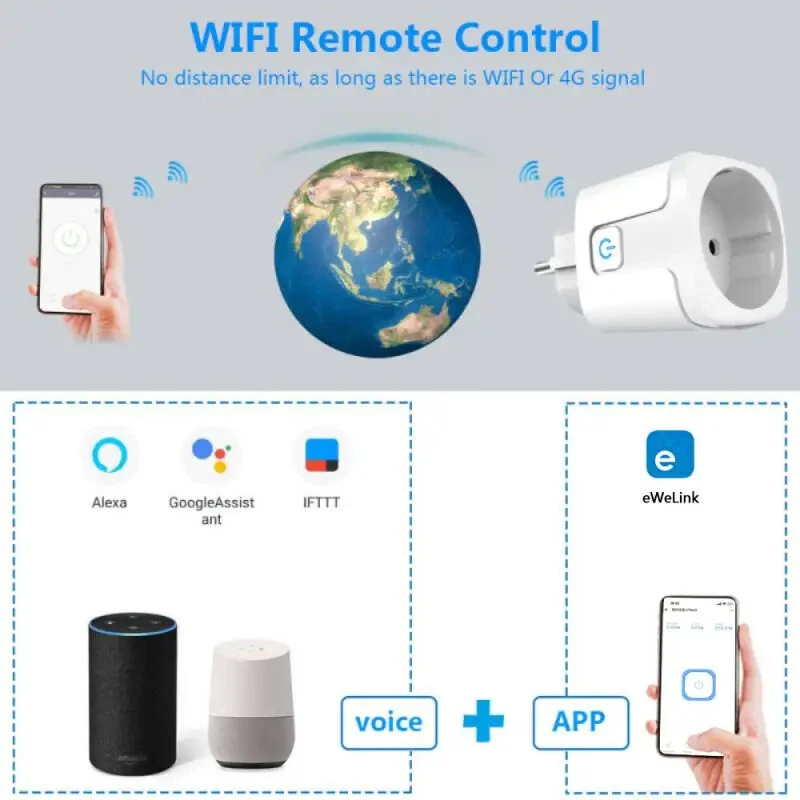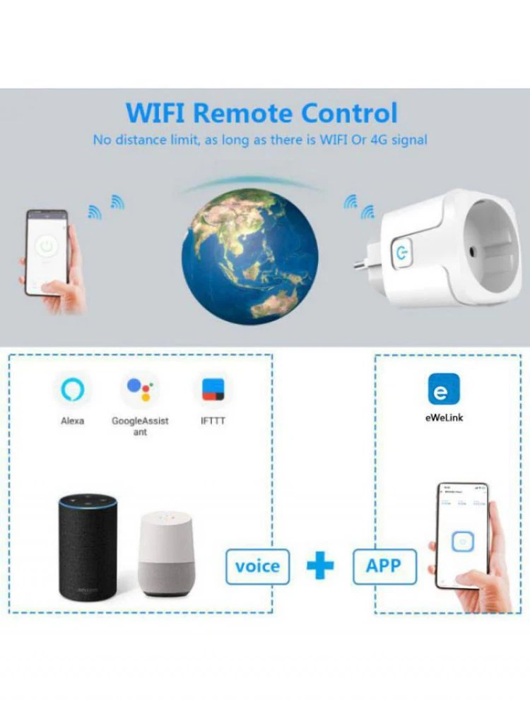 EWelink/Tuya WiFi Smart Socket 16/20A EU Smart Plug Power Monitoring Timing Outlet Alexa Google Home Alice Voice Control AUBESS EWelink/Tuya WiFi Smart Socket 16/20A EU Smart Plug Power Monitoring Timing Outlet Alexa Google Home Alice Voice Control Description: 1. 16A/20A high power 16A/20A, 3500W/4400W maximum power; 16A/20A support water heaters, air conditioners. 2. Wifi bluetooth dual mode Connect to the network faster. The connection network speed is 2 times faster than only Wifi single mode. 3. Energy Monitoring The amount of electric power can be monitored in real-time, which is conducive to control the usage of electricity. 4. Voice control Works perfectly with Amazon Alexa,Google Home,Yandex Alice. 5. APP remote control Remote control the plug at anytime, anywhere by your smart phone. 6. Timing/Countdown/Schedule Three modes of time setting to meet your request. 7. Group Control Set all of your smart plug in a group on app. Then one-click to turn/off all of your appliances by smartphone. 8. Family Sharing Control Fun Main account has the exclusive permissions,one click to share the permissions with the whole family.let the family enjoy the fun of smart life! 9. Power Failure Memory The device can be configured in the application to continue performing the state it was in before the power failure. 10. Safety/Certification CE/ROHS/FCC certification. Fireproof shell material/overcharge protection. Operation method: APP:eWelink /Tuya/Smart Life Download the APP (eWelink / Tuya/Smart Life) through the App Store 1. Connect the power socket. 2. Press and hold the switch button on the socket for 5-10 seconds, and wait until the indicator light on the switch is in a flashing state. 3. Open the APP, select the gateway interface click add socket connection. 4. Follow the instructions on the APP to complete the operation step by step. Package Included: 1*Smart Socket 1*manual