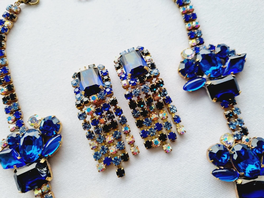welcome on my auction here is nice multicolor rhinestone Necklace and Earring made in Czech Republic vintage the Necklace set are perfectly fine no missing stones Necklace size in centimeters 40 length Earring size in centimeters 8 lenght I send the goods the next day after payment. combine postage charge avaible thank you for your time!