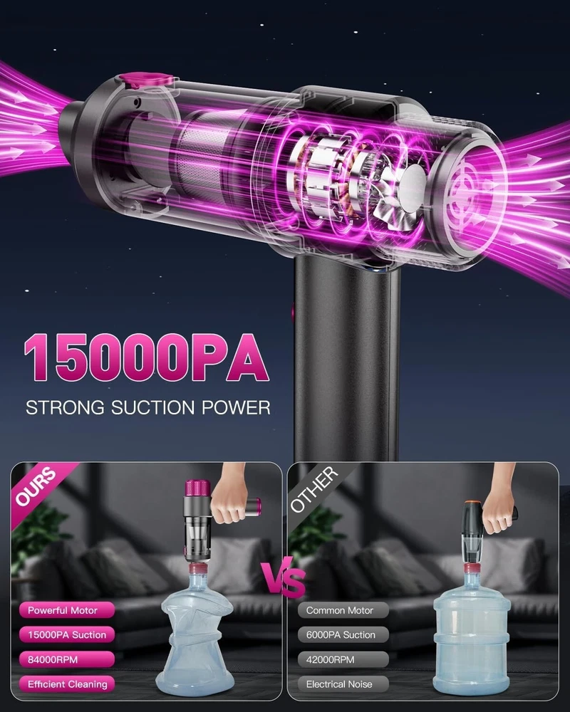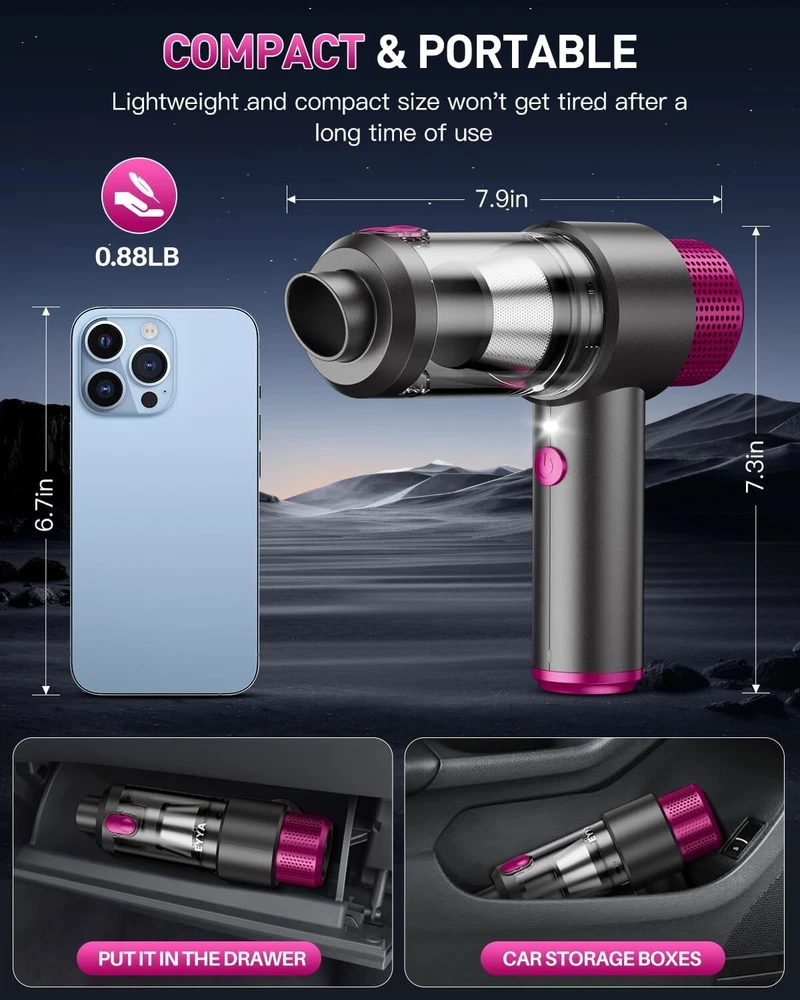 EYYA Handheld Car Vacuum Cleaner Cordless, 15000PA High Power Car Vacuum Cleaner & Air Duster, 4-in-1 Portable Mini Car Vacuum Cleaner with LED Light, Hand Held Vacuum Cleaner for Car Home Office About this item đ ă4-IN-1 Car Vacuum CleanerăHandheld Vacuum cleaner used with 7 accessories can be used to get 4 modes of suction, blowing, inflation and vacuum compression to meet your different use scenarios. Floor brush and nozzle brush can easily suck up all kinds of debris. Blowing nozzle can be used to blow away dust from keyboards and narrow crevices. Two sizes of universal nozzles can quickly inflate or expel air from objects such as swimming rings, mattresses, etc đăPowerful 15000PA SuctionăPowerful motor of the hand held vacuum cleaner has 86,000RPM and provides up to 15000PA of suction power. Whether it's a sofa or carpet in your home, or the interior of your car, it's easy to clean. The rapid heat dissipation function can expel heat in a short period, making the motor more durable and long-lasting. The operating sound is as low as 40dB, so you can clean quietly without disturbing others đď¸ăDual Filtration SystemăCar vacuum portable cordless cleaner comes with an upgraded dual filtration system that prevents suction loss and clogging. It has two reusable filters, the steel filter can effectively filter large particles of debris, and the washable HEPA filter can effectively filter tiny particles and dust to prevent damage to the motor. The one- click dusting design makes cleaning easier. With just one click, the dust cup can be easily emptied âĄăType-C Fast & Safe ChargingăPortable car vacuum cleaner has a built-in 4000mAh battery that can be recharged and used repeatedly, which is more environmentally and energy efficient. Quickly charge mini car vacuum cleaner using the USB port of your computer, mobile power, car charger, etc. You can also use the 5V/2A adapter to fully charge it in 2.5 hours (red light for charging, green light for fully charged) with 25min of run time đĄăPortable & LED LightăThis handheld vacuum cordless cleaner is only 0.88LB in weight, easily fits into an organizer or storage cabinet without taking up too much space. With the cordless design, you can clean high or inaccessible areas without the risk of electrocution or slipping. Equipped with an LED light, the vacuum cleaner can illuminate hard-to-reach nooks and crannies, and can also be used as an emergency torch