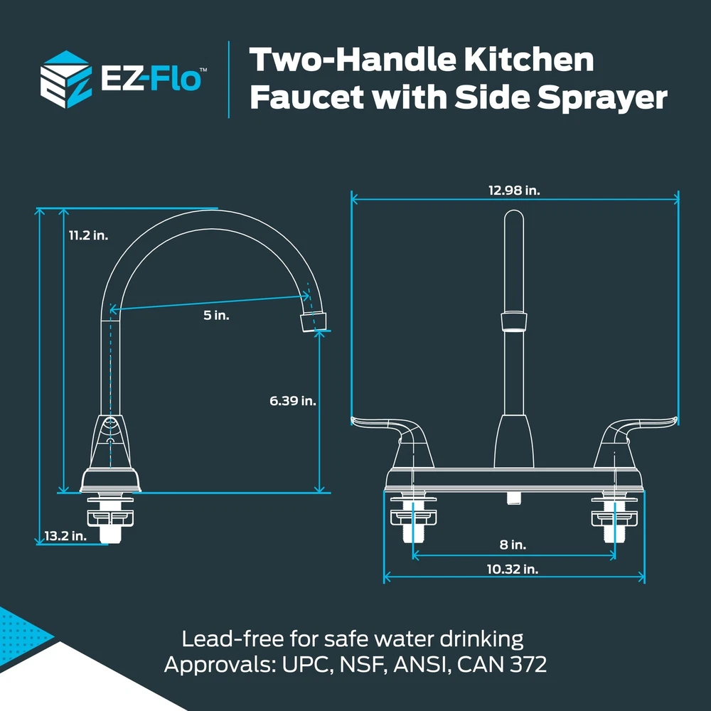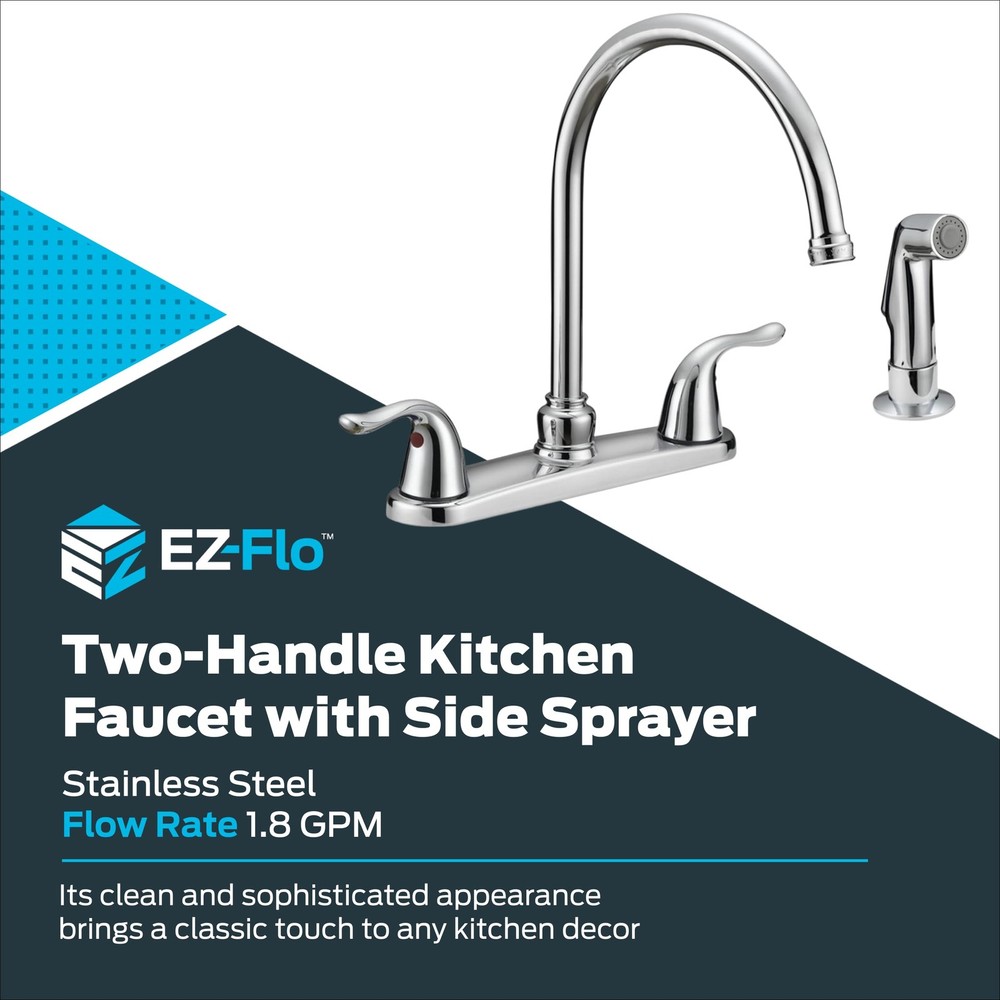 EZ-FLO KITCHEN FAUCET: This EZ-FLO high-arc kitchen faucet is providing a sleek and contemporary look to your kitchen sink; delivers up to 1.8 Gallons Per Minute (GPM) of water for a steady flow and is equipped with a lifetime ceramic disc cartridge, ensuring drip-free performance DESIGN: This kitchen faucet is designed to fit a four-hole sink installation; features a clean and streamlined look with a swivel spout that provides a 180-degree rotation, and a 2-metal-handle mount design that brings a classic touch to any kitchen decor EASY TO USE: This easy-to-use sink faucet with matching side sprayer from EZ-FLO Impressions Collection features aerators that provide continuous refreshing stream while reducing water consumption; Water supply lines are not included DURABLE: This sink faucet is constructed with durable material and stainless steel finish that can withstand corrosion CERTIFIED: These two-handle kitchen faucets are UPC, NSF, ANSI, and CAN 372-approved for product safety and comply with lead-free law