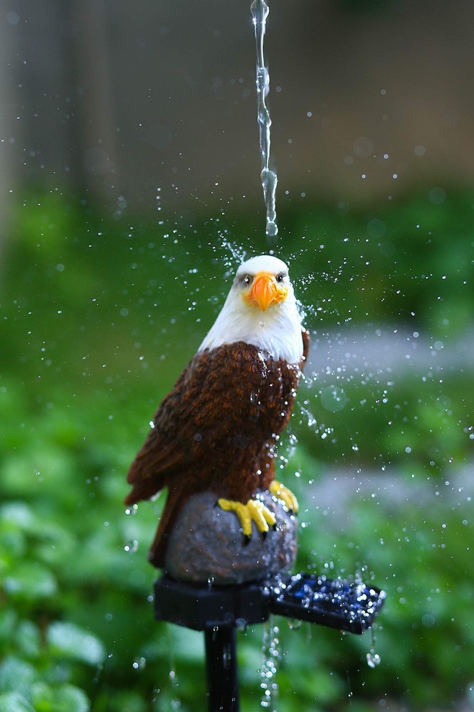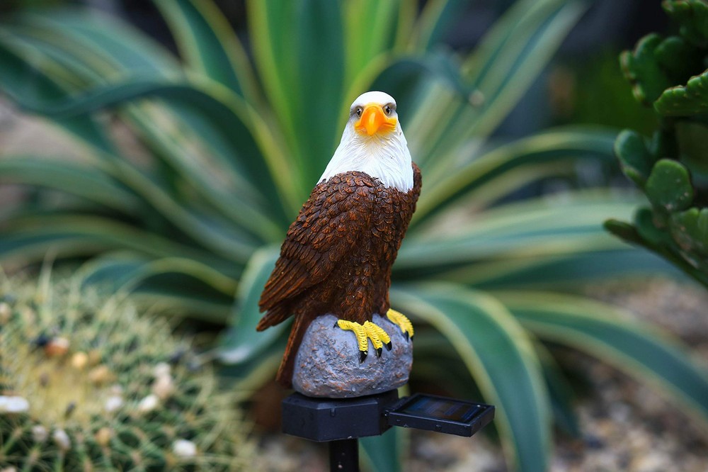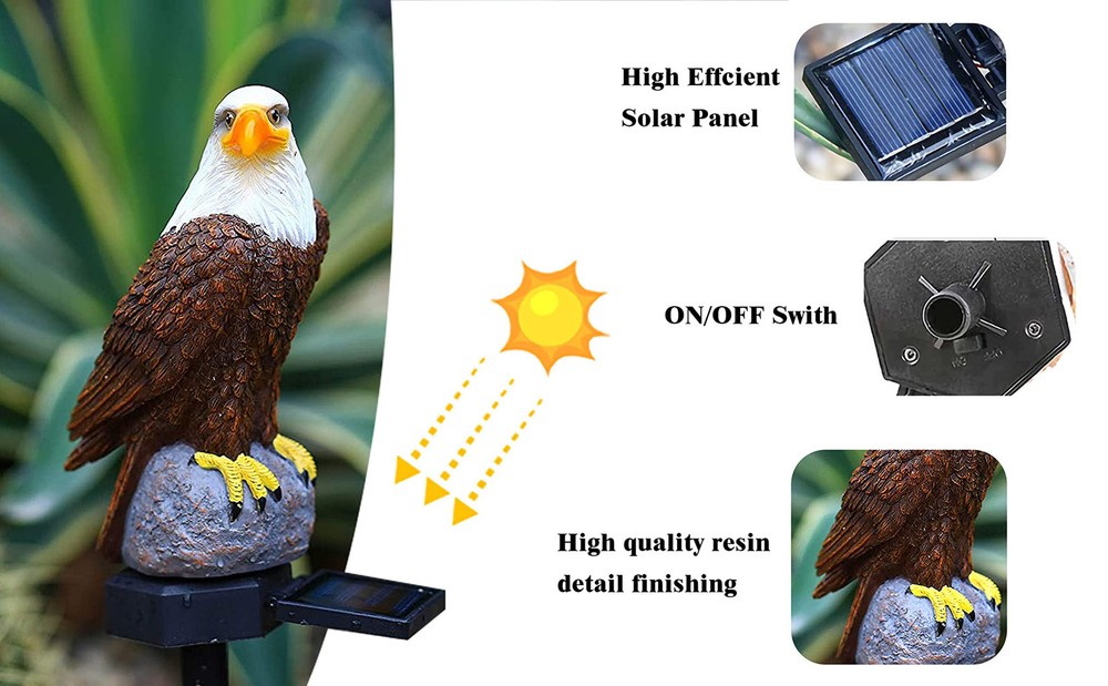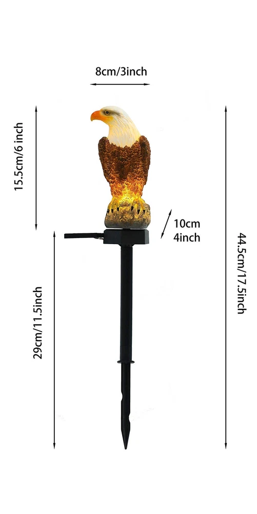 Very beautiful hand-carved eagle sculpture,eagle statue made of high quality resin, lighting looks bright at night and also good for decoration during the day; decorate your patio, lawn & garden as well as garden ornaments gift Eagle decor solar light decoration: solar panel collects sunlight during the day to charge the battery (included). Automatically turns on at dusk and illuminates for up to 6 hours at night Solar eagle light decoration size: eagle height 6 inches; eagle and solar post total height 17.5 inches Weather resistance:The solar light is made of high quality thick plastic. IP44 waterproof solar panel is suitable for outdoor use, no need to worry about rain, snow, frost or rain traps. Available all year round Make sure the button is in the "ON" position before changing the button in sunlight. If the button is in the "ON" position and the solar panel is left in the dark, the light will come on. If you have any other questions, please feel free to us.