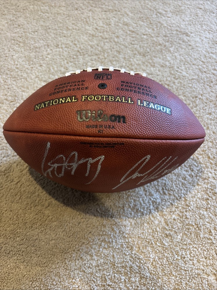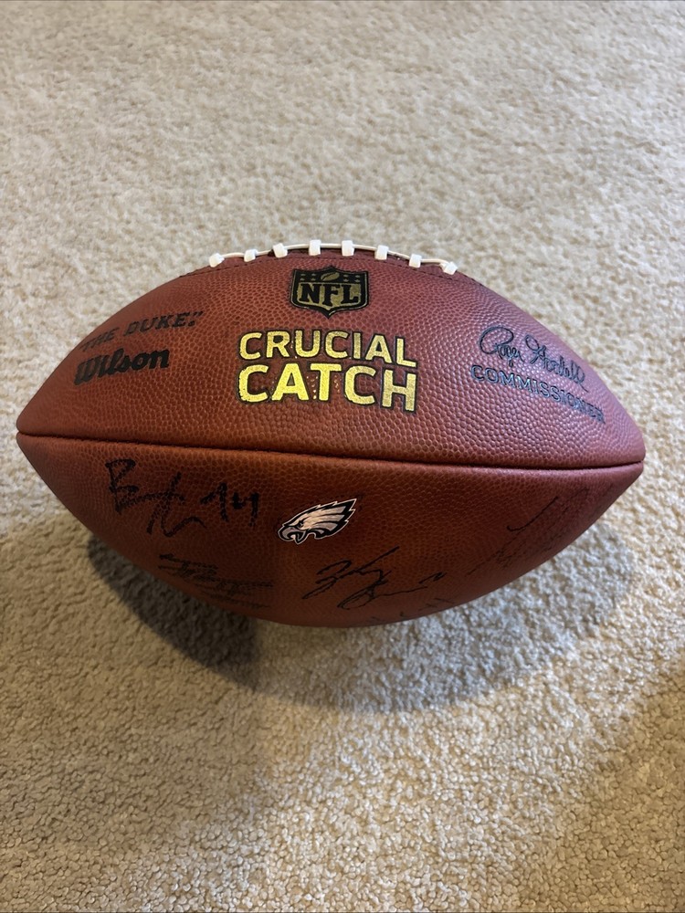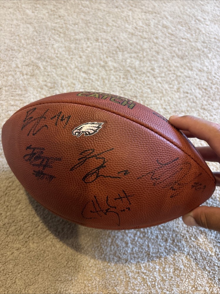- Autographed eagles football - Game used Signatures: - Jason Kelce - Cooper DeJean - Sydney Brown - Landon Dickerson - Thomas Booker - Beau Allen - Charley Hughlett (long snapper)