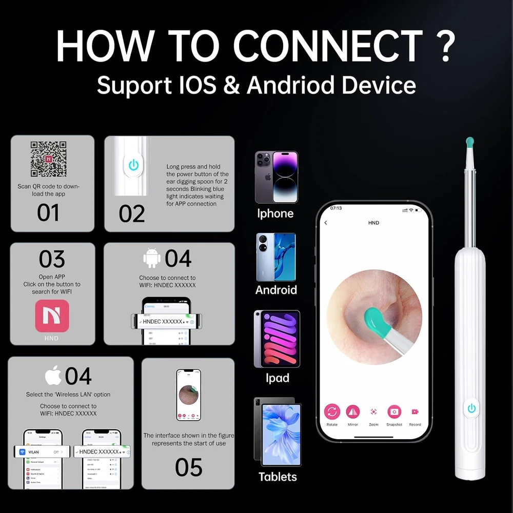 Store New Arrivals Add to Favorite View Feedback Contact Ear Wax Removal - Ear Cleaner - Ear Wax Removal Tool Camera, Ear Cleaner with Camera, Ear Wax Removal Kit with 1296P Camera, Ear Cleaning Kit, Ear Camera Otoscope with Light(White) Description Color White Batteries 1 Lithium Polymer batteries required. (included) Country of Origin China Package Dimensions 7.01 x 2.72 x 0.75 inches; 2.08 ounces Manufacturer NWDEY Upgrade your ear care routine with the 2024 Upgraded Black Ear Camera Otoscope, a high-tech tool for easy and effective earwax removal. Experience the convenience of a built-in camera with the Earify Earwax Remover, allowing you to see deep into your ear canal for precise cleaning. Say goodbye to traditional ear cleaning methods and embrace the advanced technology of the Earwax Removal Camera, providing a safe and gentle solution. Enhance your ear hygiene with the Ear Cleaning Camera, a versatile and portable device that helps you maintain healthy and clean ears on the go. Discover the ultimate ear care kit with the Ear Wax Removal Tool Camera, combining the benefits of a camera, ear cleaner, and earwax remover in one comprehensive package. Product Description NOTES: 1. The ear pick head must be installed in place to prevent falling. 2. Do not break the ear pick with your hands. 3. Children should be supervised by an adult when using the Visual Ear Endoscope. 4. It is not recommended for children under 6 years old and pets on the move. 5. Keep it out of the reach of children as much as possible. 6. For first-time users, please approach the ear canal gently and slowly. 7. Please follow the user manual for your first use. 8. Please do not use metal ear picks directly to cleaner earwax. 9. Please use a regular 5V1A charging plug to charge the product. 10. Do not use the product while charging. 11. Please do not put the product near the fire source under any circumstances. 12. The temperature of the product will rise slightly when using(under 35°C). Please feel relieved to use. ABOUT US We offer the best prices around on high quality products. Our E-store includes media such as books, movies, music and games while offering electronics, toys, sporting apparel, clothing, tools, general home, garden items and more. SHIPPING We are always working hard to ensure your package arrives as soon as possible. Please understand that some factors like weather, high postal traffic, and the performance of shipping companies are outside of our control. We offer free shipping to the lower 48 states and ship within 2 business days of payment, usually sooner. We do not accept P.O. Boxes. Please provide a physical address. RETURNS We offer a 30-Day Return Policy on items which you are not completely satisfied with. You have the option for a full-refund or an exchange of the item. No returns are available on items shipped outside of the USA. PAYMENT We accept PayPal. CONTACT US This page content is yet to come Please ad us to your favorite seller and visit again later Thank You CUSTOMER SATISFACTION We try our very best to make sure every customer is completely satisfied. If there's a problem, message us! We're happy to help.