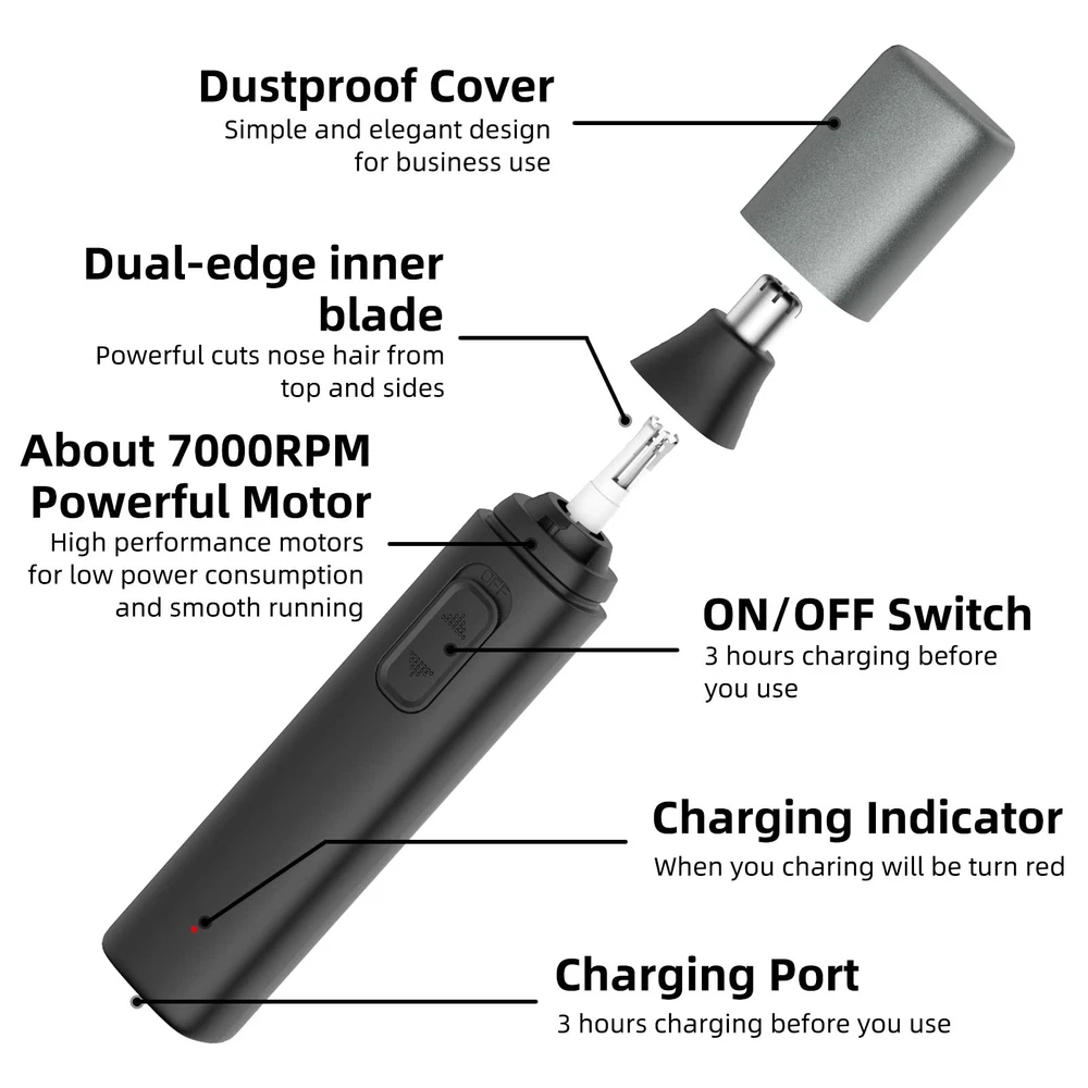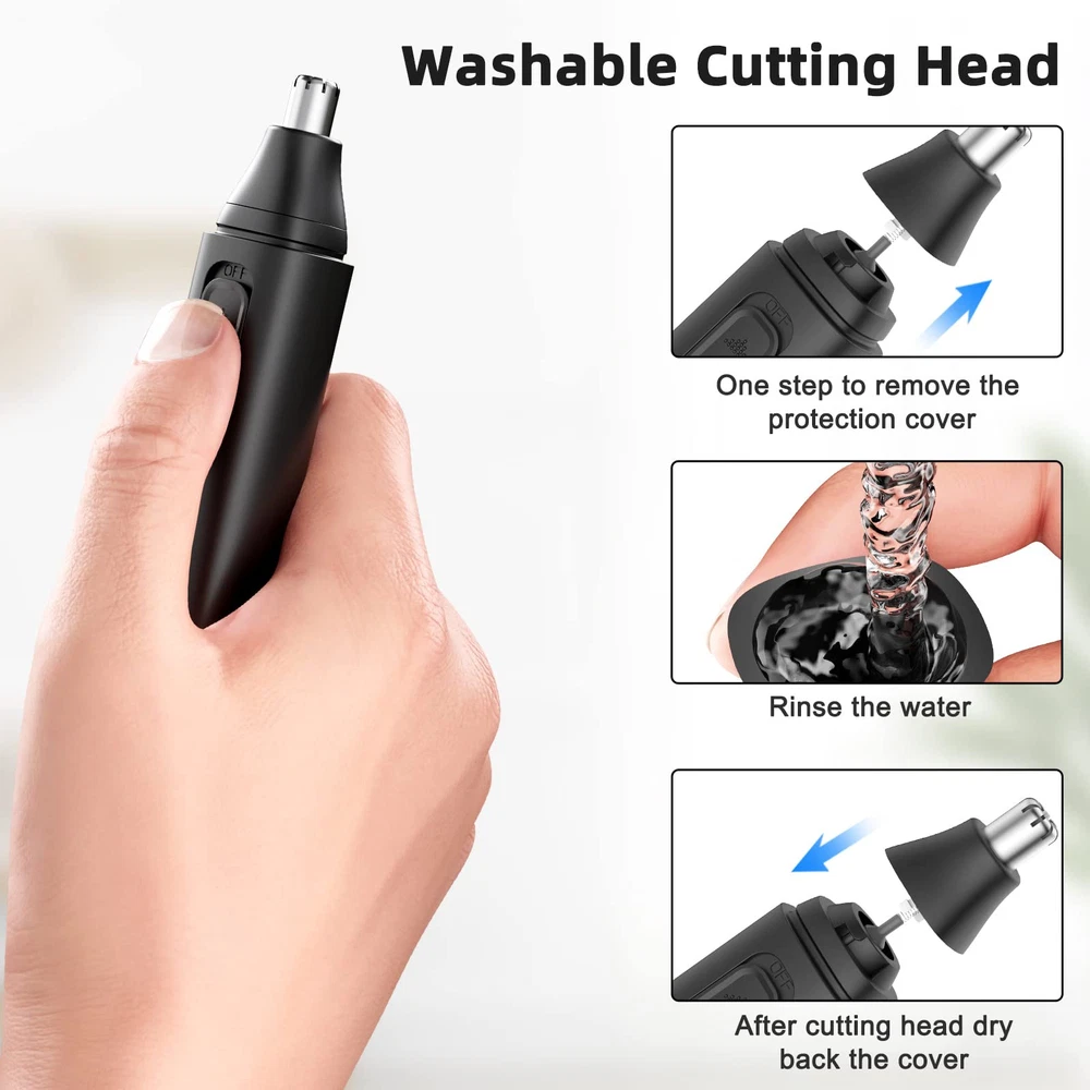 Electric Nose/Ear Hair Trimmer:Our nose hair trimmer with dual edge blades, dual-edge spinning blades system with a protective cover,removes excess hair from nose and ears, giving you a neat and stylish beard look. Safety to Use and Low Noise Operation:The cutting head is stainless steel and hypoallergenic, so you don't have to worry about sensitive skin and it's safe to use. Specially designed noise control so you can use it smoothly. Extremely Light Design and Powerful: It weighs only 53 grams and can be used for 50 minutes on a full charge, making it suitable for travel and business trips. 10000 PRM's powerful motor avoids snagging hairs. Easy to clean:The ear and nose trimmer has a washable head to ensure that the trimmer is clean after each use (the body is not waterproof). Hassle-free after-sales service. We offer a 30-day full money back guarantee and a 12-month warranty. If you have any questions about the product, please feel free to contact us and we will give you an answer within 24 hours.