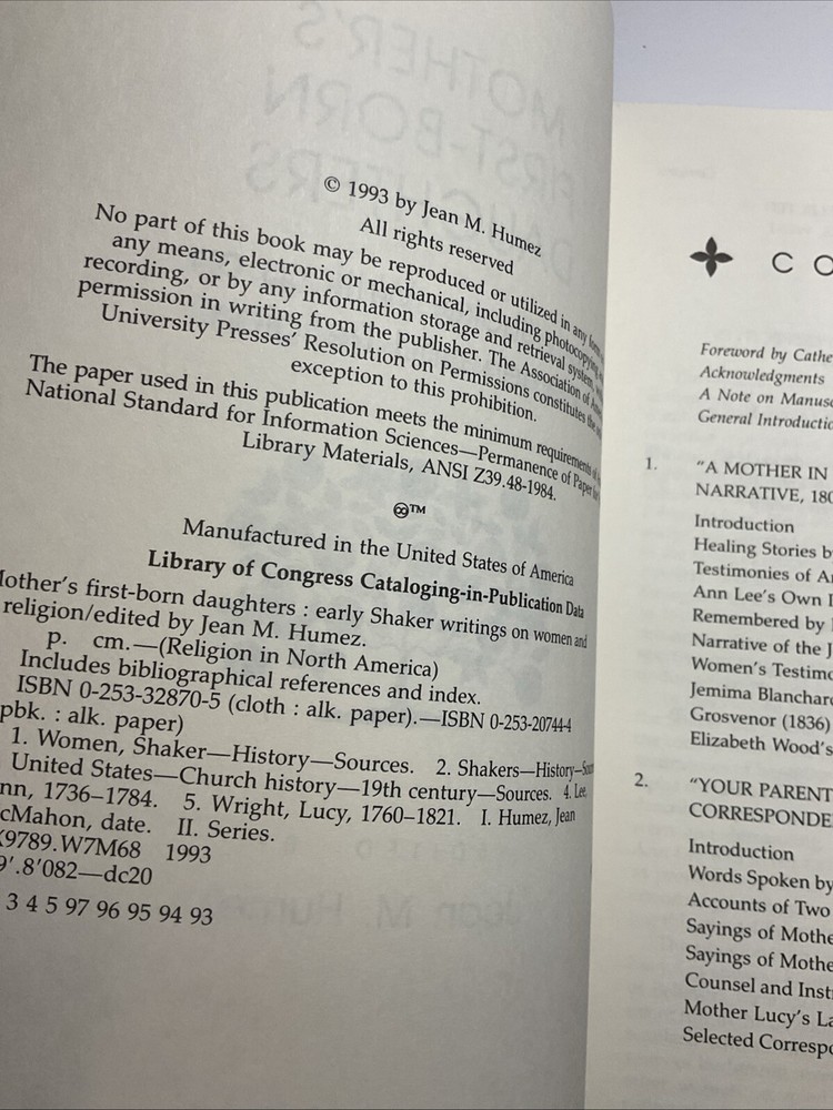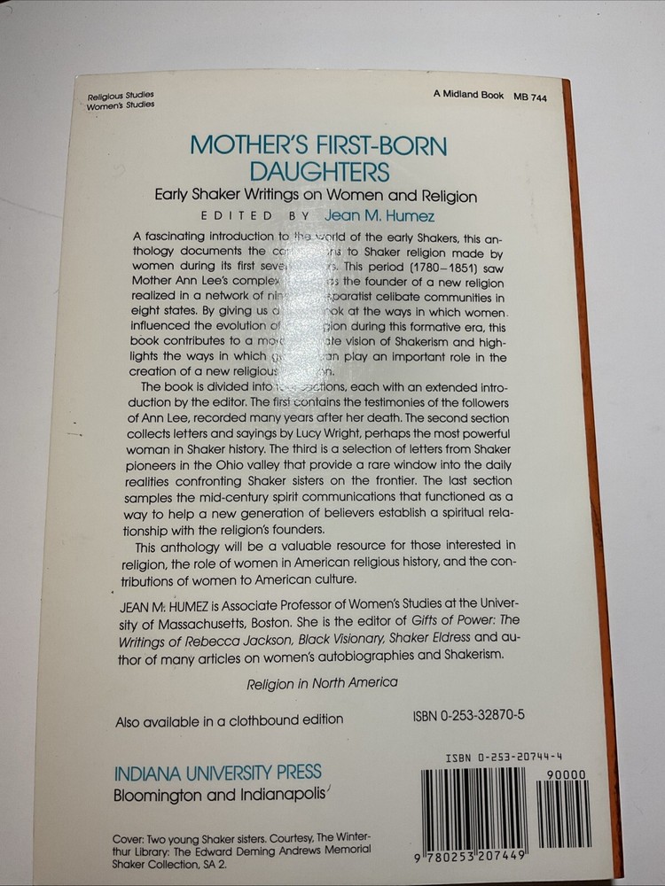 The product is a book titled "Mother's First-Born Daughters: Early Shaker Writings on Women and Religion" by Jean M. Humez. Published by Indiana University Press in 1993 as part of the "Religion in North America Ser." series. It is a textbook in trade paperback format, with 336 pages exploring topics such as Biography & Autobiography, Religion, History, and Social Science related to Christian Church, Shaker Christianity, and Women's Studies in the United States. Minor wear