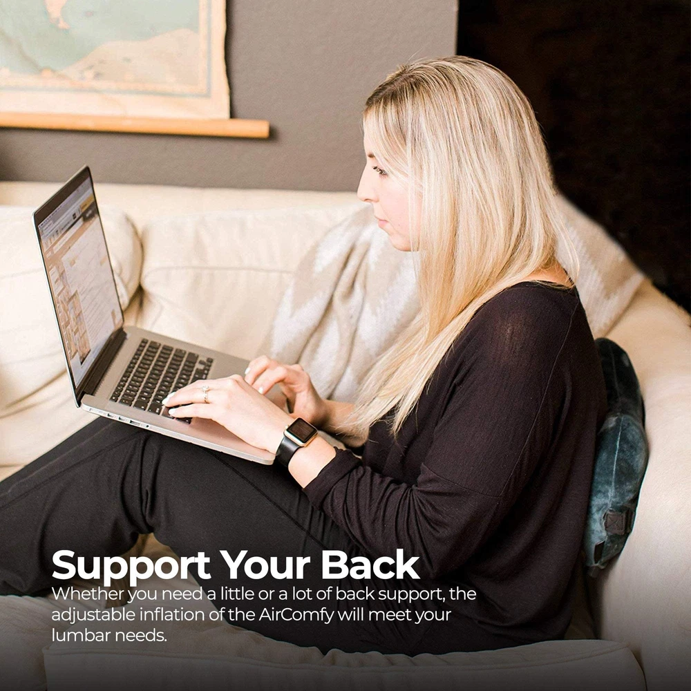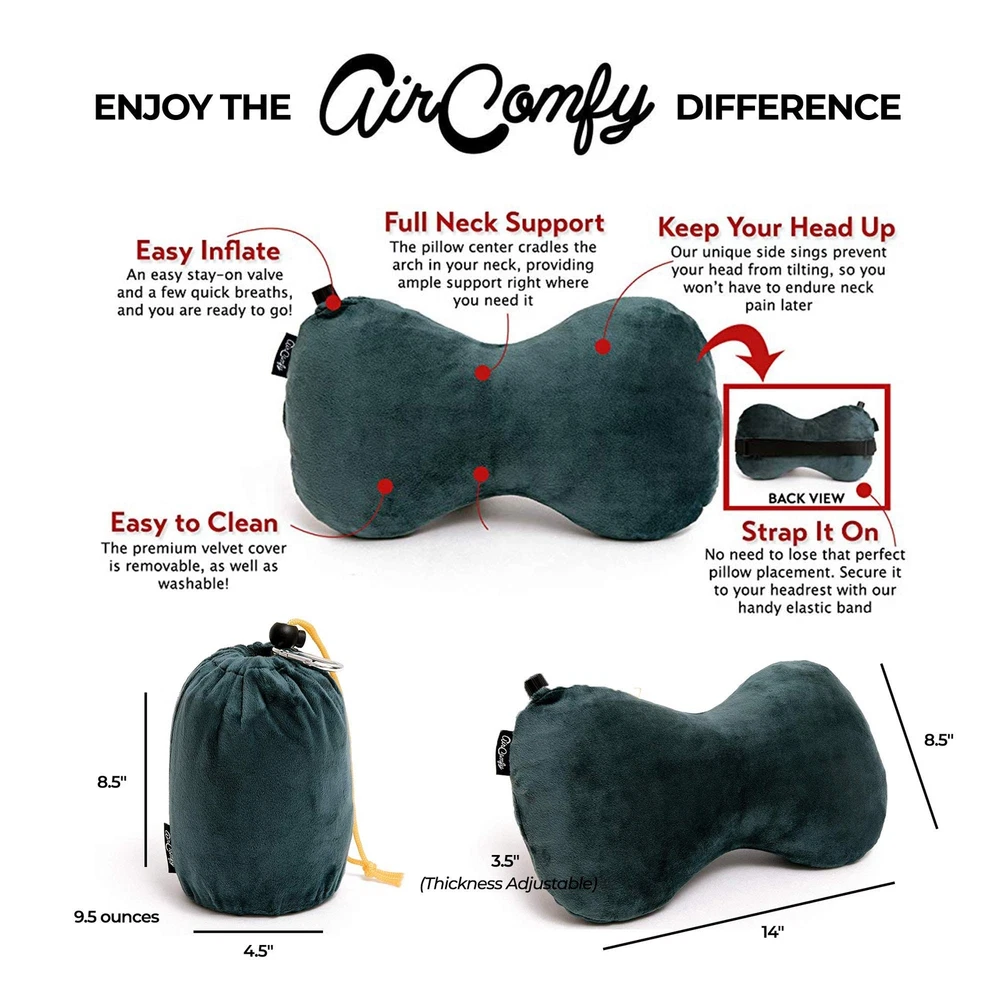 Ease Inflatable Travel Pillow with Luxuriously Soft Washable Cover - Ergonomic Neck and Lumbar Support for Prevention of Cervical and Lower Back Pain (Grey) Product Details Color: Grey Ease Brand: AirComfy MPN: 8541802789 UPC: 867364000257 EAN: 0867364000257 Brand: AirComfy Special Feature: Inflatable, Portable, Adjustable Color: Grey Ease Size: Ease Fill Material: Foam Brand: AirComfy Special Feature: Inflatable, Portable, Adjustable Color: Grey Ease Size: Ease Fill Material: Foam Shape: Semicircular Age Range (Description): Adult Recommended Uses For Product: Sleeping, Sitting Use for: Head, Back, Neck Material: Memory Foam, Elastic, Velvet Fabric Item Firmness Description: Soft Product Care Instructions: Machine Wash Pillowcase, and spot-clean inner tube Number of Pieces: 1 Pattern: Solid Item Weight: 6.2 Ounces Fabric Type: Velour UPC: 867364000257 Manufacturer: AirComfy Product Dimensions: 14"L x 3.2"W Unit Count: 1 Count Global Trade Identification Number: 57 Item Weight: 6.2 ounces Country of Origin: China Item model number: 8541802789 Is Discontinued By Manufacturer: No Date First Available: September 14, 2017 RELAX UPRIGHT COMFORTABLY - Our superior design keeps your head upright, preventing unpleasant kinks and strains caused by tilting your neck to the side. This low-profile support makes it ideal for use as a neck pillow for sleeping on the go ADJUST THE SIZE - Everyone's different, so we've made our pillow adjustable to your personal preference-inflate it to be firmer or release air to make it softer. Our luxurious interior foam gives you support without the bouncy, hollow feeling you get from some inflatable pillows. ATTACH IT TO HEADREST - Our elastic band holds the neck pillow in place, so you can move around without losing that comfortable placement. It is ideal for airplanes or as an everyday car pillow-providing you more support than a standard headrest. PACKS FOR TRAVEL - Weighing less than half a pound, you won't have to worry about a heavy pillow that takes up too much space. This inflatable pillow compresses into an enclosed packsack, and can clip onto your carryon using the attached carabiner. (NOW FEATURING LARGER PACKSACK - JUNE 2015) LUMBAR BACK PILLOW - Have you ever been on a plane or long road trip, and your back starts to ache from lack of support from the lower seat back? You can also use your AirComfy as a lumbar pillow and simply adjust it to provide the lower back support you need!
