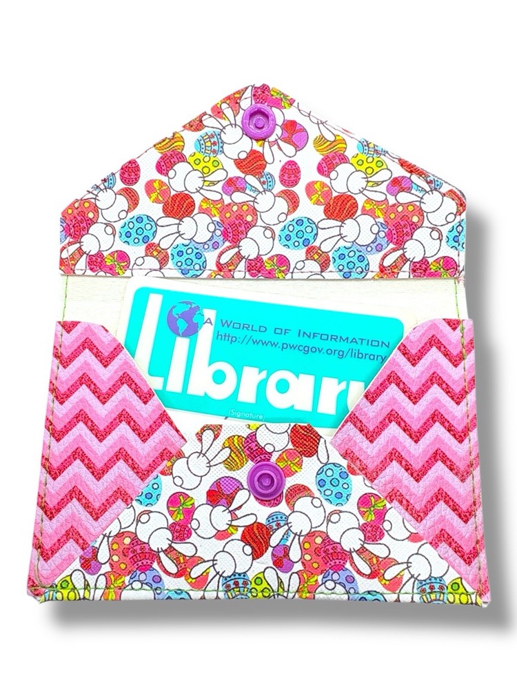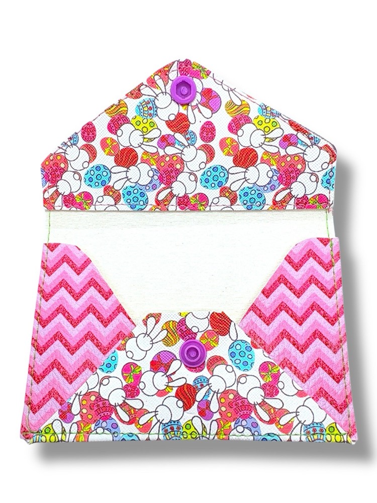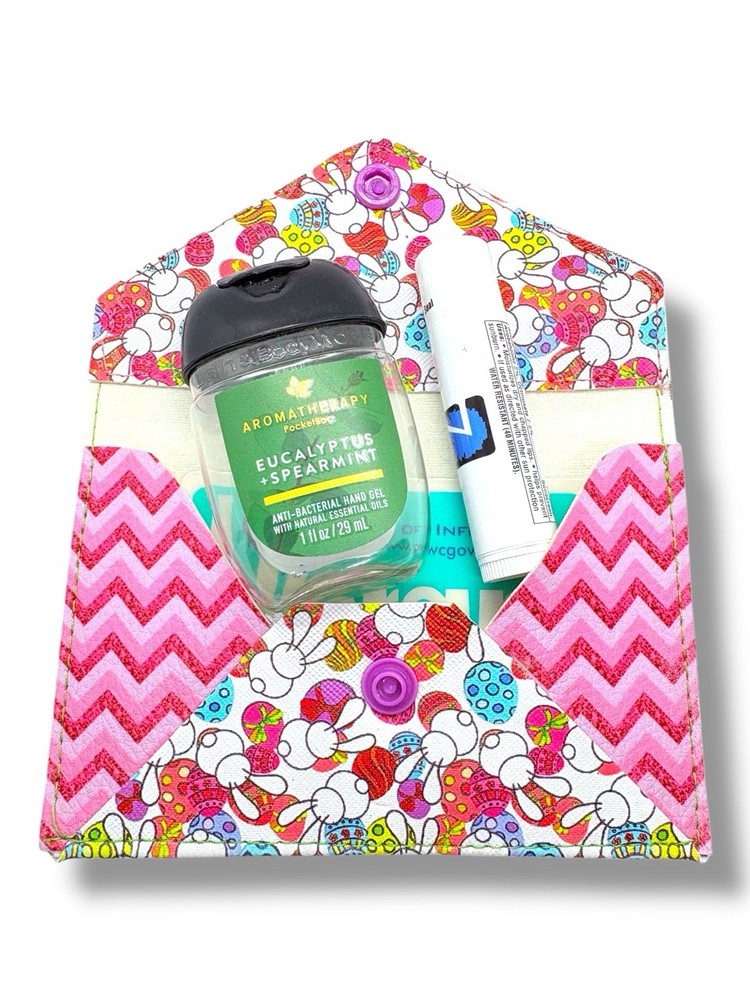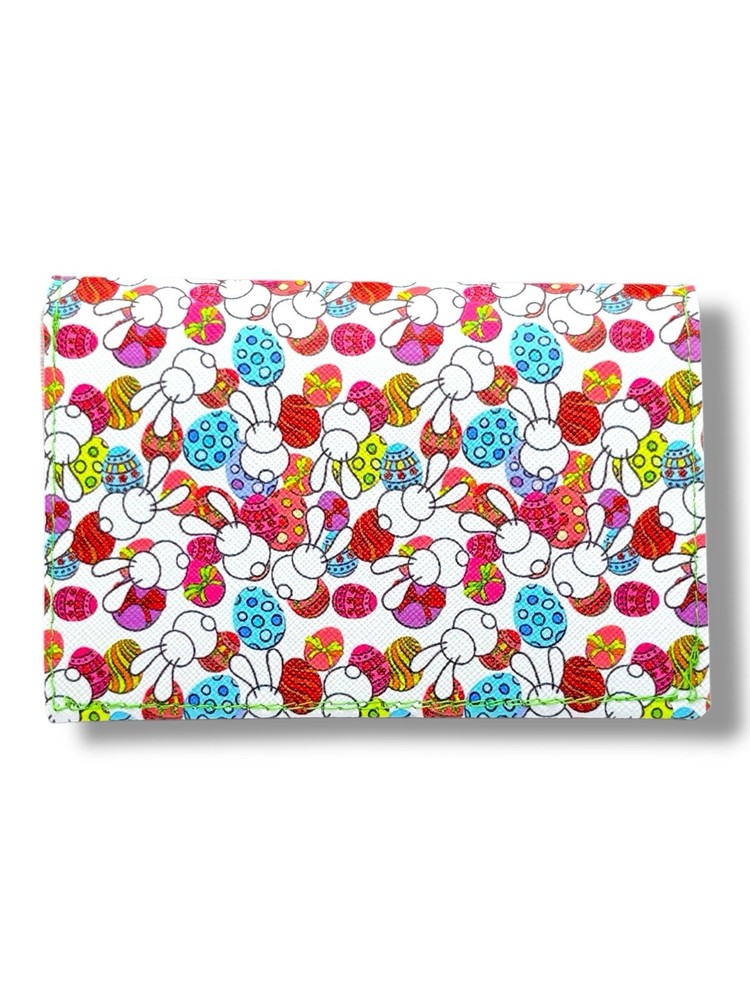 The Easter Bunny and Egg Faux Leather Pouch is a handmade small wallet perfect for women who love a spring-themed accessory. The wallet features a printed Easter/Spring pattern in a multicolor chevron design, making it a cute and stylish choice for those looking to add a touch of seasonal charm to their handbag or purse. Made of faux leather, this unique wallet is a perfect blend of quality and handcrafted detail, showcasing the artisan's craftsmanship and attention to detail. Details: • Handmade from durable faux leather • Design features Easter bunnies, colorful eggs, and bright chevron pattern • Size: Approximately 5” wide x 3.5” tall (closed) • Purple snap closure • Great for holding lip balm, mini hand sanitizer or cash cards. Add some Easter cheer to your daily essentials or surprise someone with a cute spring gift!