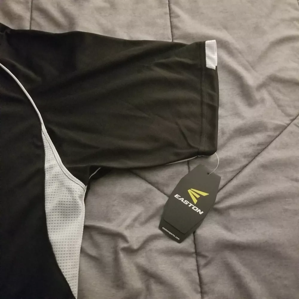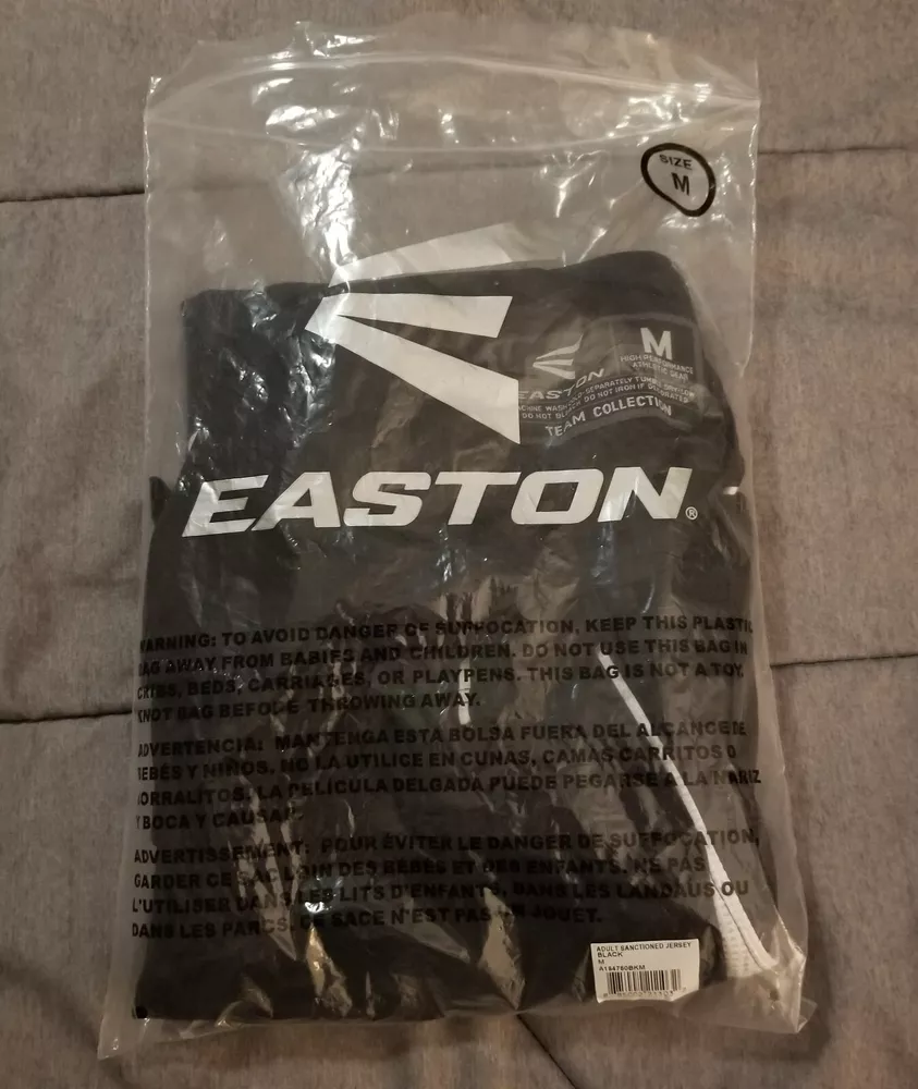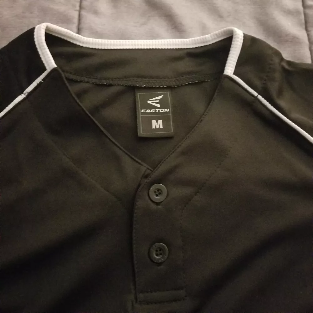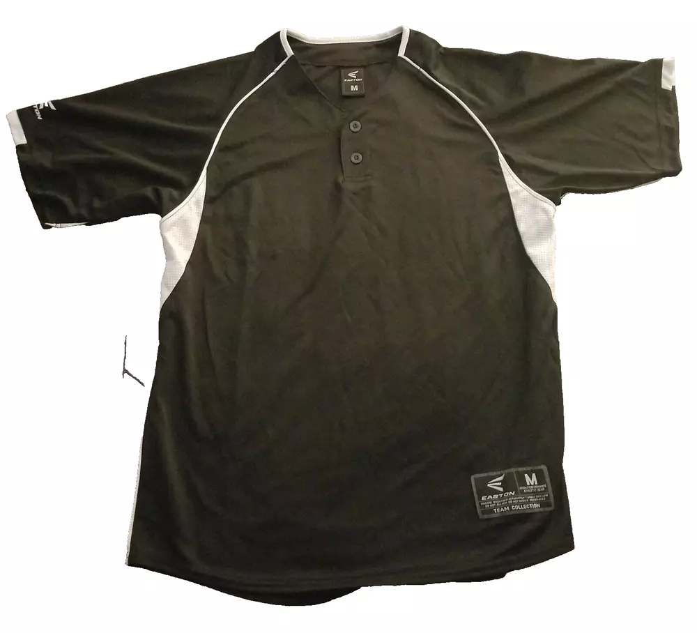 This Easton jersey is the perfect addition to any high-performance athletic gear collection. Made of 100% polyester jersey fabric, it is lightweight, breathable, and easy to care for with its medium wash. The classic/fitted short sleeves and button-down collar make it suitable for both casual and competitive activities, such as baseball and soccer. Featuring a solid black & white color with an Easton logo accent, this men's medium jersey has a button closure and measures 28 inches in length. Whether you're playing in the summer, fall, or spring seasons, this Easton Team Collection jersey is sure to provide comfort and style.