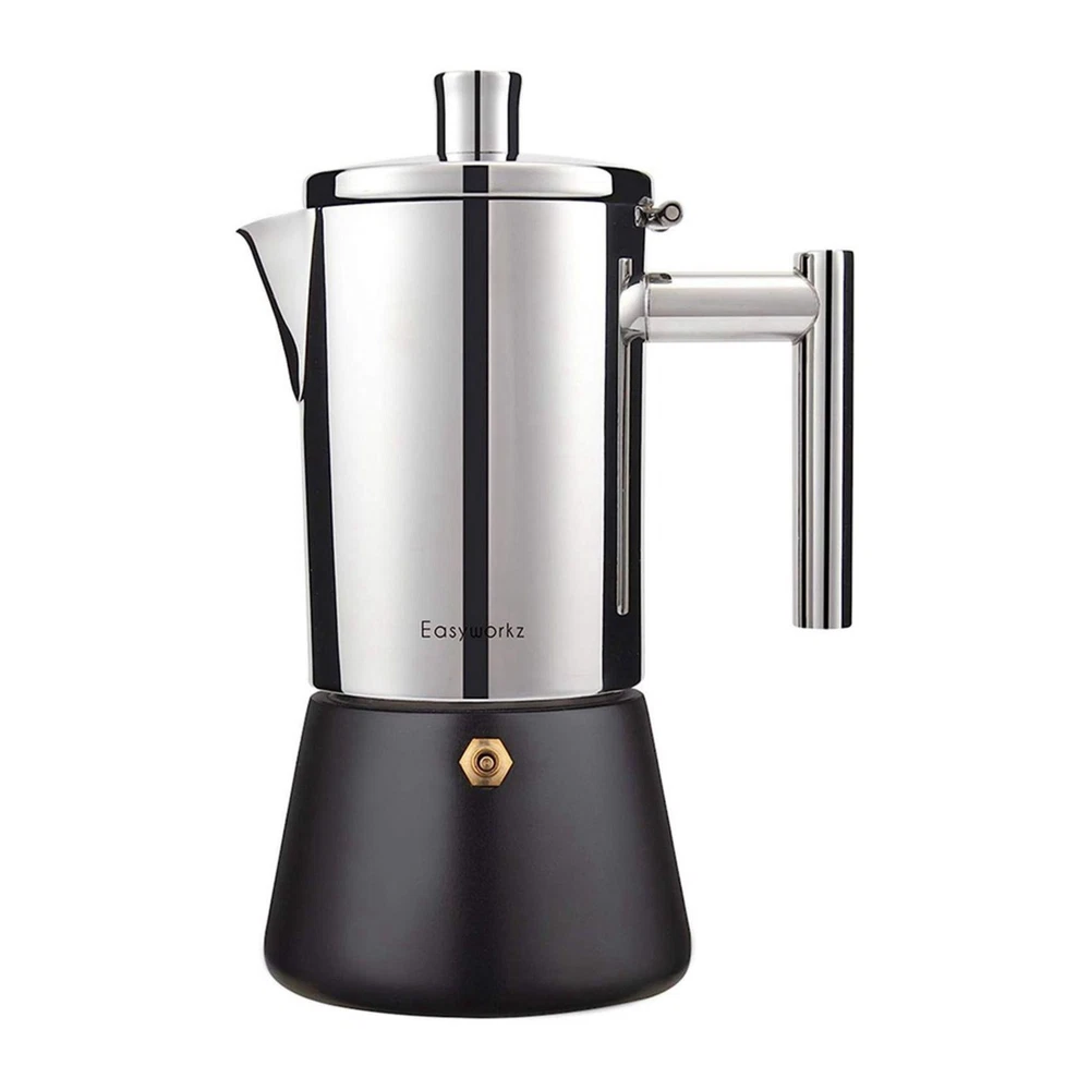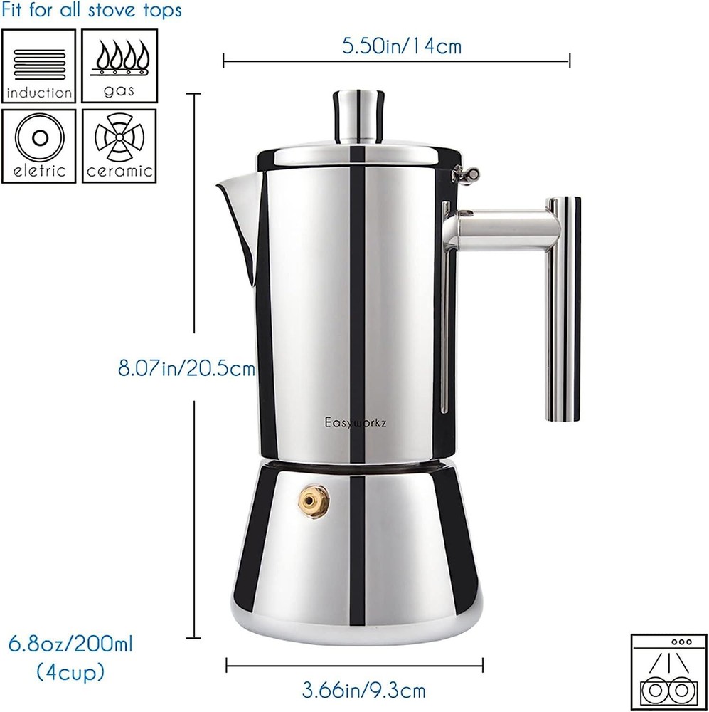Easyworkz Diego Stovetop Espresso Maker Stainless Steel Italian Coffee Machine M Easyworkz has created this high grade stovetop espresso maker with modern manufacturing technology and crafted to meet the top standards in this industry. Featuring a heavy gauge 18/8 stainless steel construction with high mirror polishing,induction base and fit for all stove tops. It is our Diego Coffeemaker! Fresh espresso,classically brewed in a nice and elegant espresso maker. Our Diego espresso maker has an elegant classy design and will be your lifetime moka pot. Enjoy your coffee and have fun everyday with Our Diego coffeemaker. Dishwasher safe - Easy to brew and clean stovetop espresso moka coffee pot Tip 1 **For safety, there will be residual water in the boiler to prevent over burning.** If you wish to make less espresso, fit the boiler half way to the safety valve with water and insert the reducer into the funnel. Add your ground coffee on the top of the reducer. Allow the moka pot to cool down before open it to wash. For the best results, always wash your espresso maker by hand. For the best tasting, brew with Fine grinding coffee and filtered water. Tip 2 Shipping Fast Shipping Worldwide Returns We accept returns 30 days from the package received. Payments All payments are accepted via PayPal. Thank you for shopping