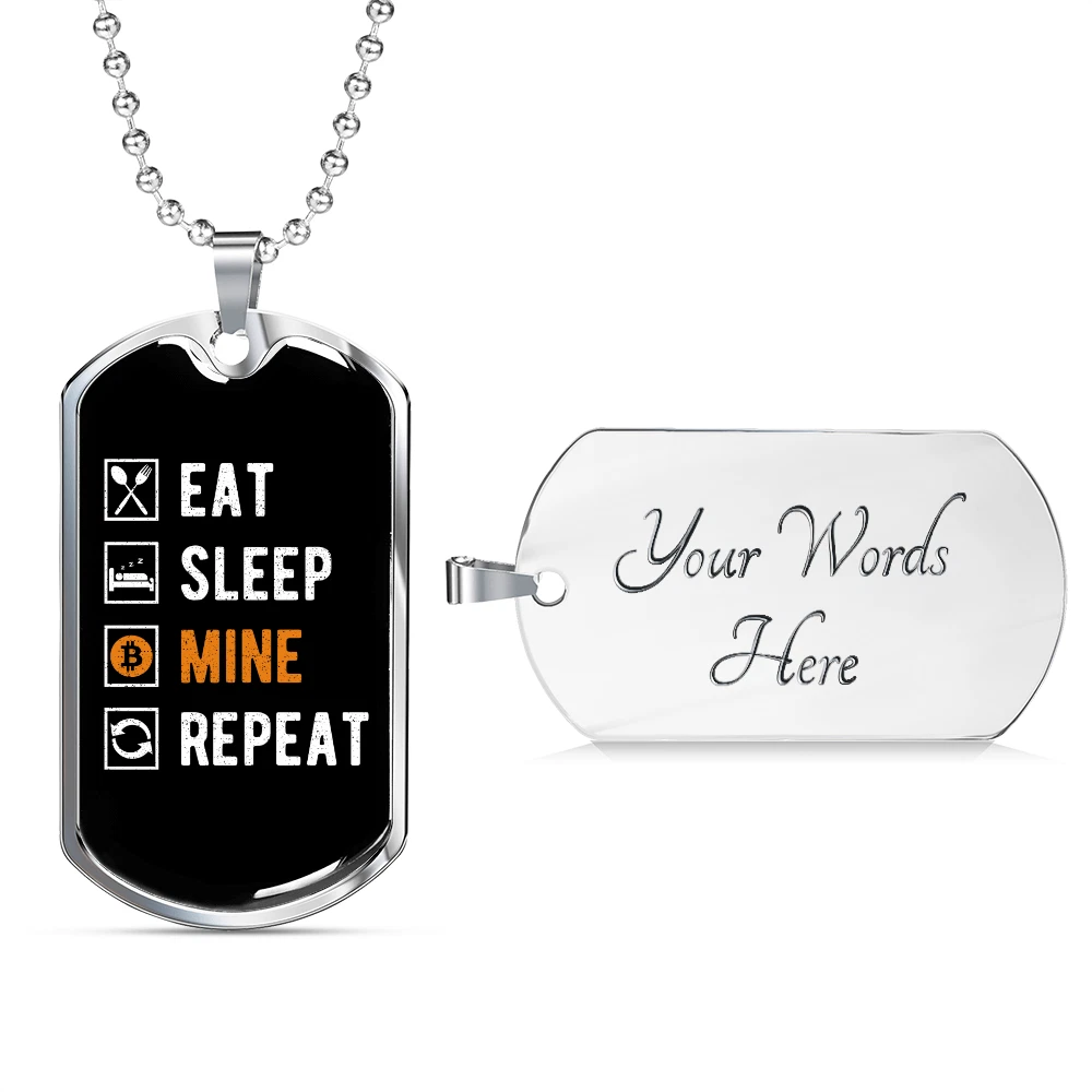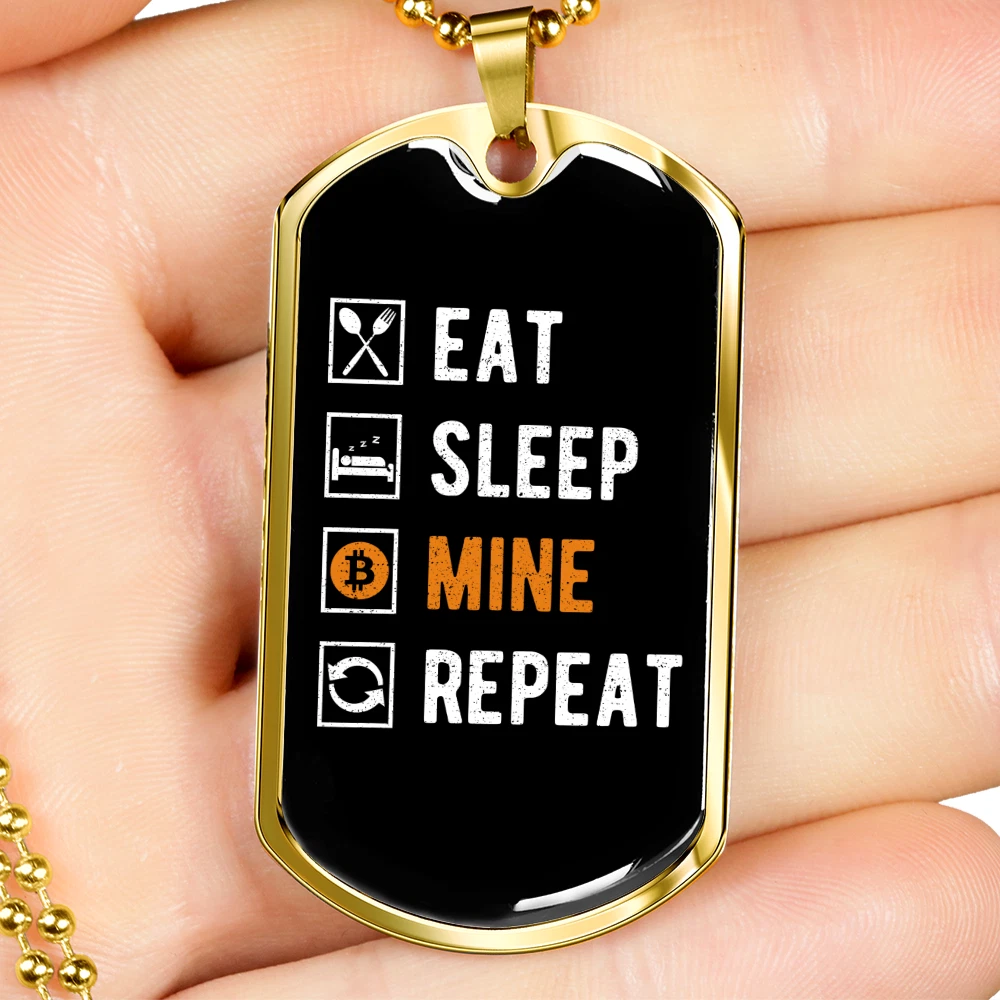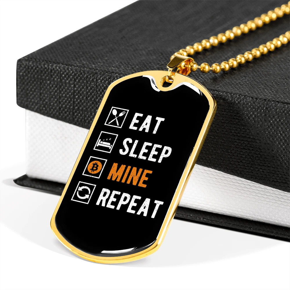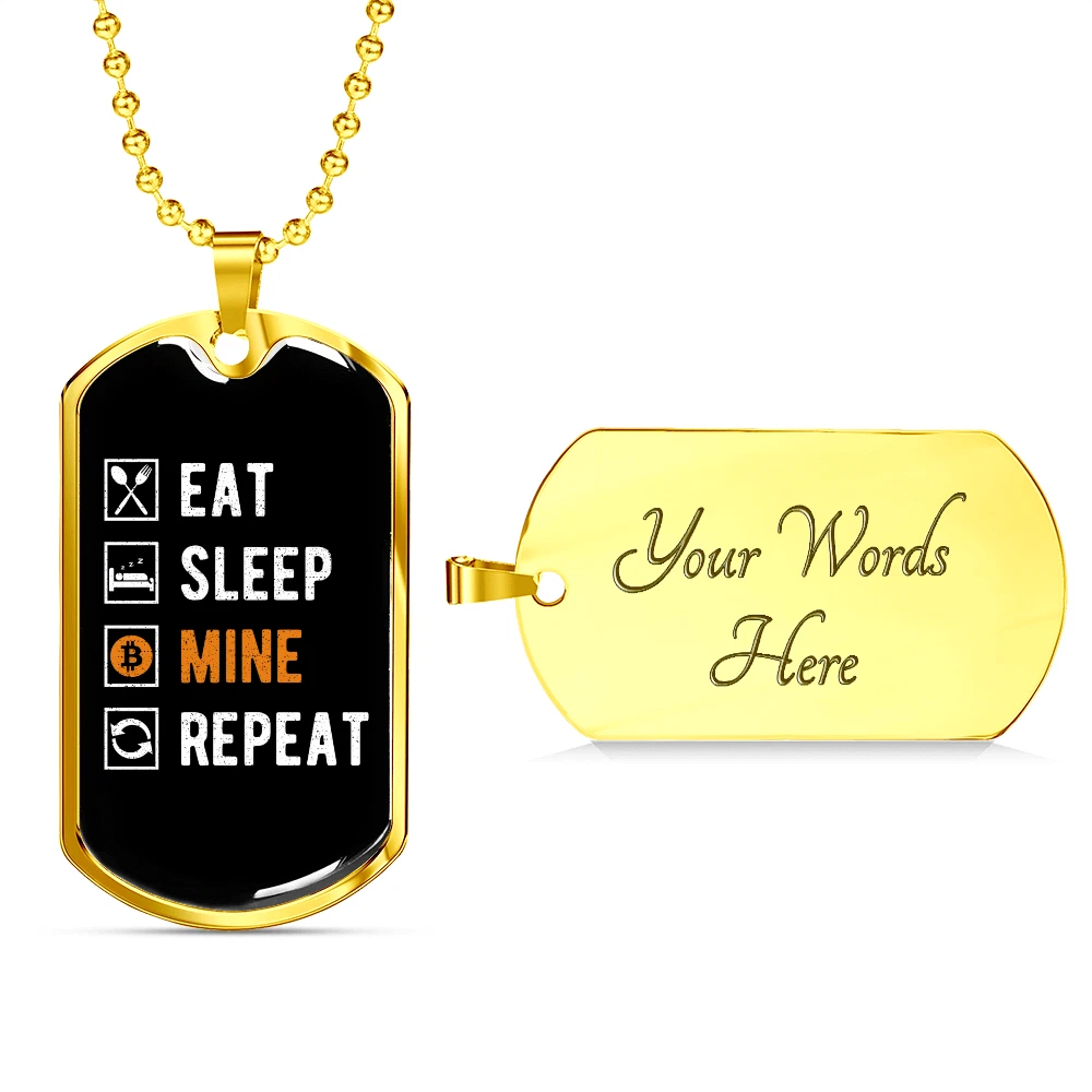 Eat Sleep Mine Repeat Crypto Necklace Stainless Steel or 18k Gold Dog Tag 24"