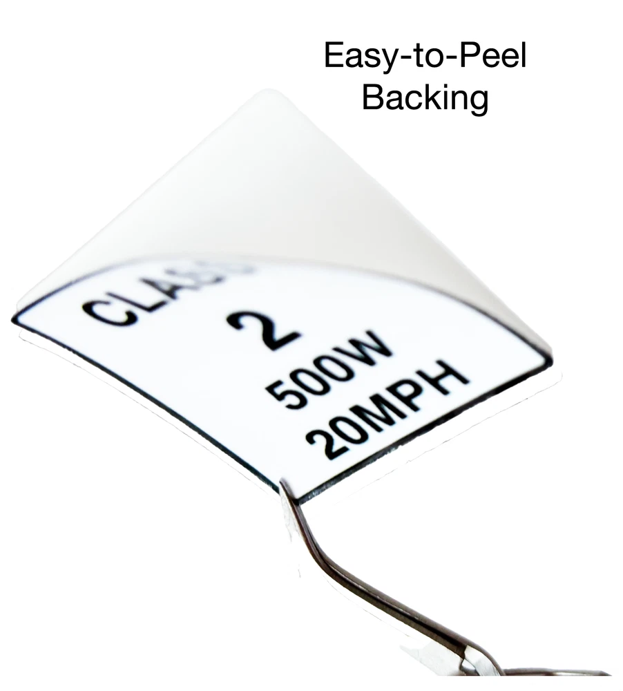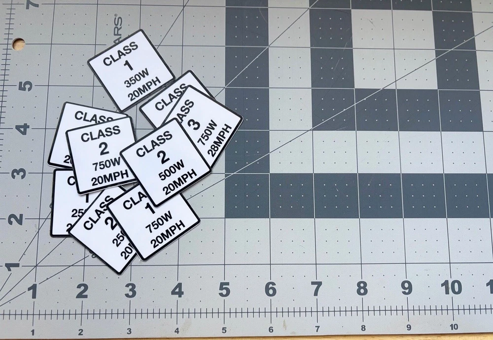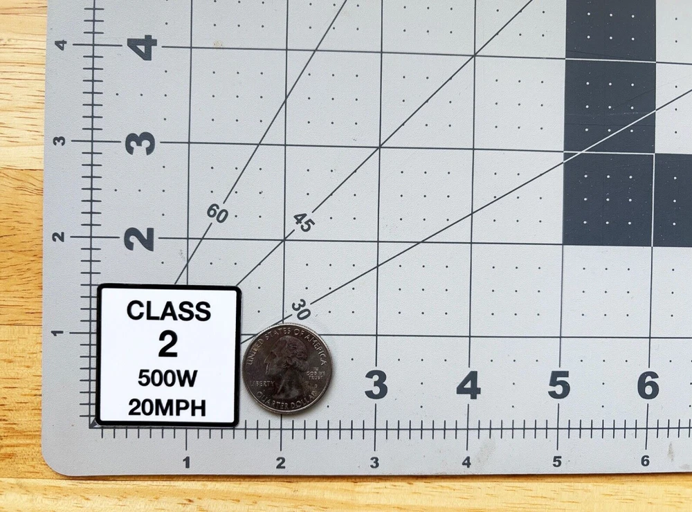 PLEASE READ BEFORE PURCHASE WHAT IS A CLASS 1, 2 and 3 EBIKE? • Class 1 e-bike: Pedal assist only. NO throttle, Max speed 20mph, max power output 750W. • Class 2 e-bike: Pedal assist AND throttle. Max speed 20mph, max power output 750W. • Class 3 e-bike: Pedal assist only. NO throttle, Max speed 28mph, Max power output 750W. This listing includes TWO STICKERS. DIMENSIONS: 1.5 x 1.5 inches Material: Vinyl decal with a waterproof laminate finish. Color: White Vinyl • Black Ink Why You'll Love This Sticker: Tough and Durable: Crafted from durable vinyl with a glossy laminate coating added to protect it, keeping your sticker intact, waterproof, and looking great. The sticker features an easy-to-peel backing for hassle-free application. ***Handmade & Unique*** Each sticker is handmade, so no two are exactly the same. You might notice slight variations or small imperfections in the ink or Die Cut — but they only add to the charm. Visibility This sticker offers excellent visibility. The size is large enough to stand out but compact enough not to overwhelm your ebike’s design. Fits on Key Parts: Recommended location: Easily place on the seat tube or head tube for best visibility. Returns & Replacements: The ebike sticker is non-refundable, but we will replace if damaged or lost during shipping. Please Note: -We are not responsible for any damage the sticker may cause. Always apply and remove with care! -This listing is for 2 stickers only; e-bike photos and other images are for reference. - Classification of ebikes may change over time. Shipping: Shipping and tracking provided by ebay standard envelope via USPS.