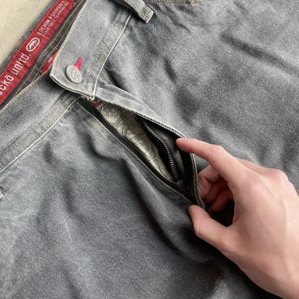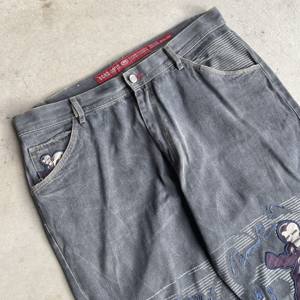 Insane faded black wash/gray baggy ecko jeans with avengers embroidery Tagged a size 36, measured 39x33 with a 44” outseam Good condition, no rips or tears but they do have a busted zip