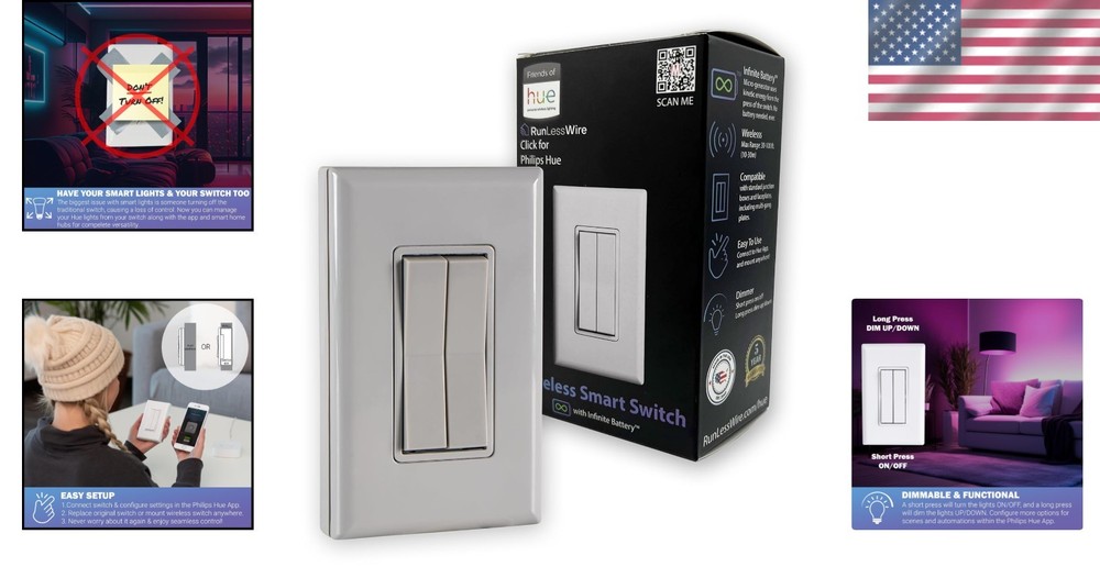 Eco-Friendly Philips Hue Smart Switch - Wireless Dimming Control for Any Room ‹ › ‹ › ‹ › ‹ › ‹ › ‹ › ‹ › ‹ › ‹ › ‹ › Eco-Friendly Philips Hue Smart Switch Transform your lighting experience with our Wireless Dimming Control for Any Room. Stay effortlessly in command of your Philips Hue Light Bulbs with a smart wall switch that lends flexibility and elegance to your home. Features: Smart wall switch that connects seamlessly with Google, Alexa, and Homekit through the Philips Hue Bridge. Self-generated by kinetic energy, eliminating the need for batteries and wires. Exceptional range up to 30 feet, utilizing Zigbee technology for reliable connectivity. Decorator-style design includes both single and double rocker face, compatible with standard or multi-gang faceplates. Available in an exquisite variety of colors: black, brown, gray, ivory, light almond, or white. Simple to connect via the Philips Hue App, allowing you to easily configure scenes and automations. Mount on any flat surface or attach to a junction box, effortlessly replacing traditional wall switches. Hand-assembled in the USA with materials to ensure unmatched quality. Benefits: Eco-friendly design eliminates battery waste while providing reliable performance. Convenient wireless functionality allows for placement anywhere in your home. Seamless integration with smart home systems for an enhanced living experience. Stylish design to elevate the aesthetics of any room. Quality assurance backed by a 5- . Why choose the Eco-Friendly Philips Hue Smart Switch? Elevate your home with a sophisticated lighting solution that marries convenience and sustainability. Our Eco-Friendly Philips Hue Smart Switch offers you complete control at your fingertips—no batteries, no wires—just pure elegance and functionality. With its easy installation, beautiful design, and eco-conscious build, it’s the ideal choice for upgrading your living space to a smart, modern home. Don't miss your chance to enhance your everyday living—click to order your Philips Hue Wireless & Battery-Free Smart Switch today! Shipping Free & Fast Shipping - We offer free shipping to most of the USA with a normal delivery time of 3-7 days. However, due to the current situation, additional delivery time (up to 3 weeks) may be required for some items. Alternative Carriers - We may use alternative carriers (e.g. USPS, FedEx, UPS, etc.) to ensure your package arrives safely and on time. Due to the use of multiple carriers, we are unable to provide a tracking number automatically. Handling Time - Orders are processed and shipped within 1-2 business days of receiving cleared payment. Shipping Restrictions - Shipping to Alaska, Hawaii, Puerto Rico, Guam, and other US territories may incur shipping charges or delivery restrictions. Please contact us before ordering, or your order can be refunded/cancelled. State Restrictions - There may be restrictions based on your state of purchase. For example, certain items may not be shipped to California due to state regulations. Contact for Tracking Updates - If you require tracking updates or have any concerns about the delivery of your order, please feel free to contact us, and we will be happy to assist you. Return 30-Day Hassle-Free Returns - We want you to be completely satisfied with your purchase. If you are not, you can return the item within 30 days of receiving it for a full refund or exchange. Easy Return Process - To start a return, simply contact us and we will provide you with a prepaid return shipping label and detailed instructions. Restocking Fee - There are no restocking fees for returns. However, the buyer is responsible for return shipping costs if the return is not due to a seller's error. Refund Processing Time - Refunds will be processed within 5 business days of receiving the returned item in its condition. Payment We accept all major credit cards, PayPal, and Apple Pay for your convenience. Your payment information is secure and encrypted to ensure a safe and seamless transaction. Please complete your payment within 3 days of purchase to avoid any delays in shipping. Feedback Your feedback is extremely important to us. We strive to provide the best products and customer service possible. If you are satisfied with your purchase, please take a moment to leave us a positive review. If you have any concerns or issues with your order, please contact us before leaving negative feedback. We are committed to resolving any problems and ensuring your satisfaction. Contact Us If you have any questions or concerns, please feel free to out to our customer support team. You can contact us through the eBay messaging system. We are available Monday to Friday, 9:00 am to 5:00 pm EST, and we will do our best to respond to your inquiry within 24 hours. Buy it now and enjoy a pleasant shopping experience! Unit Quantity: 3.2 oz Smart Home Protocol: ZigBee Smart Home Compatibility: Amazon Alexa,Apple HomeKit,Google Assistant,Philips Hue Compatible Product: Light Bulb Connectivity: Wireless Features: Dimmable,Battery-Free,Wireless,Self-Powered,Kinetic Energy,Decorative Design Type: Smart Switch Connection Split/Duplication: 1:1 (None) Unit Type: oz