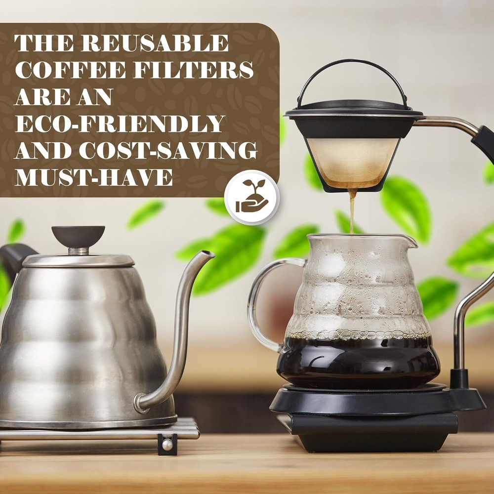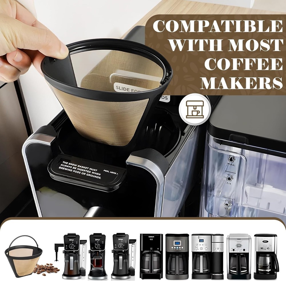 About this item ☕【Elevate Your Coffee Experience】Our coffee filter reusable basket is upgrade to stainless steel, ditching disposable Cuisinart filter replacements and traditional paper. Opt for a luxurious Cuisinart coffee filter basket replacement that transcends the limitations of paper. Indulge in pure coffee flavor every morning with #4 coffee filters, free from any paper taste or waste, you know is what you need for your Cuisinart 14 cup coffee maker or Ninja coffee bar. 🌳【Budget & Eco Friendly 】Embrace sustainability and savings with washable, cuisinart gold tone coffee filter. Make a green choice with cuisinart coffee filter replacement 14 cup that not only reduces waste but also saves you money with just a size 4 coffee filters cone. This gold coffee filter eliminate the need for constant repurchasing – simply wash and reuse for an eco-conscious and cost-effective brewing solution with our cuisinart replacement filter basket. 💧【Effortless Install, Effortless Cleanup】Simplify your coffee routine with easy installation and cleaning for the coffee filters 8-12 cup. Our gold coffee filters are crafted from surgical-grade stainless steel, which makes these cone coffee filter ensure top-notch quality without keeping residue inside your coffee maker, making every brew a satisfying experience. They are dishwasher safe, ensuring a clean and mess-free experience with our cone coffee filters #4 ✔️【Guarantee Compability & Longevity】Our durable, reusable coffee filter basket stand out as the ultimate choice for Cuisinart coffee maker filter replacement, braun coffee filter replacement, Ninja reusable coffee filter, the Cusinart coffee plus 12 cup programmable coffee maker filters and cuisinart 14 cup carafe replacement, perfect for using like such as a ninja coffee filter and others cafe coffee maker. This gold coffee filter basket is the best choice 🤝【Confidence in Every Sip】Rely on our reusable filters backed by our 30-day guarantee. Our steadfast commitment to quality assurance ensures swift resolution of any issues or concerns, supported by seamless communication and comprehensive assistance. 【IMPORTANT】We highly recommend checking the compatibility and size of your coffee maker with our reusable filters before making the purchase.