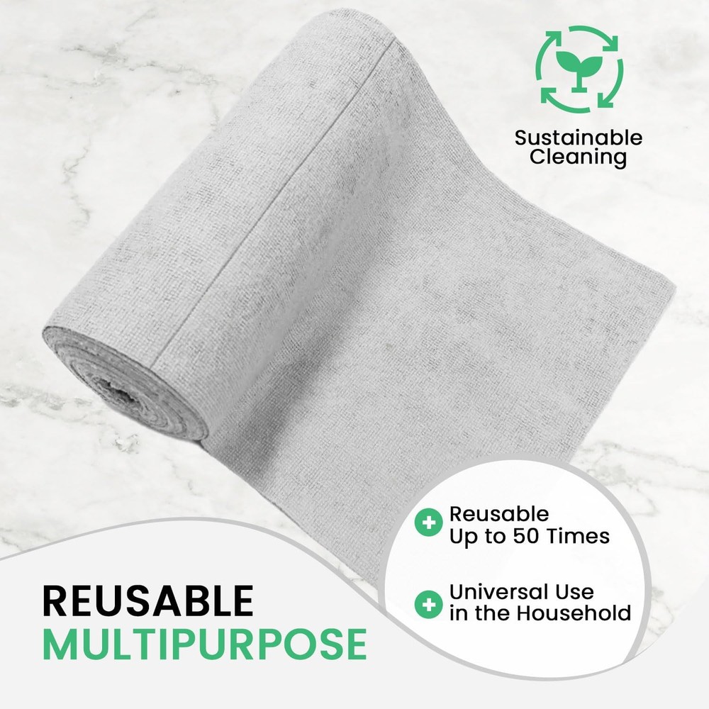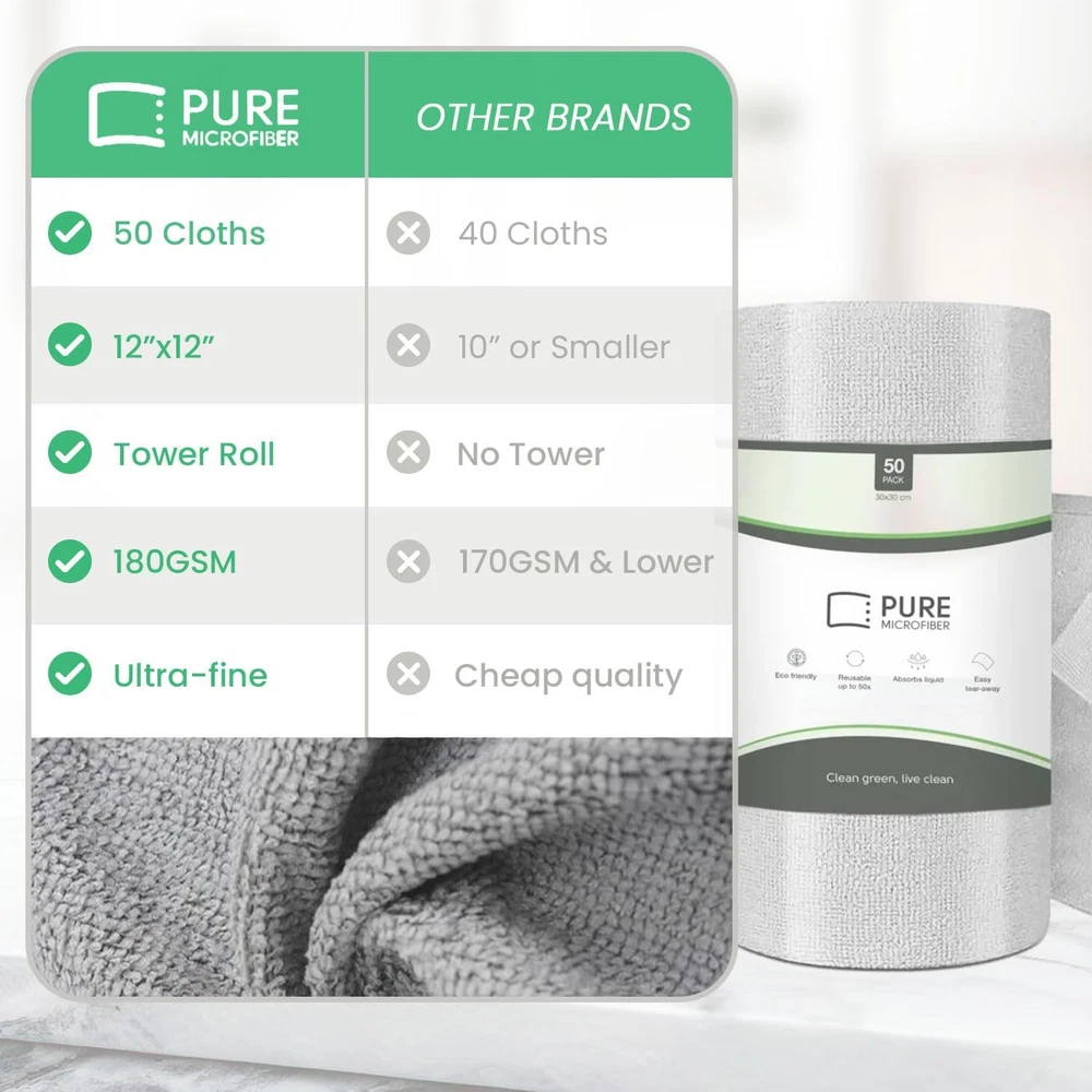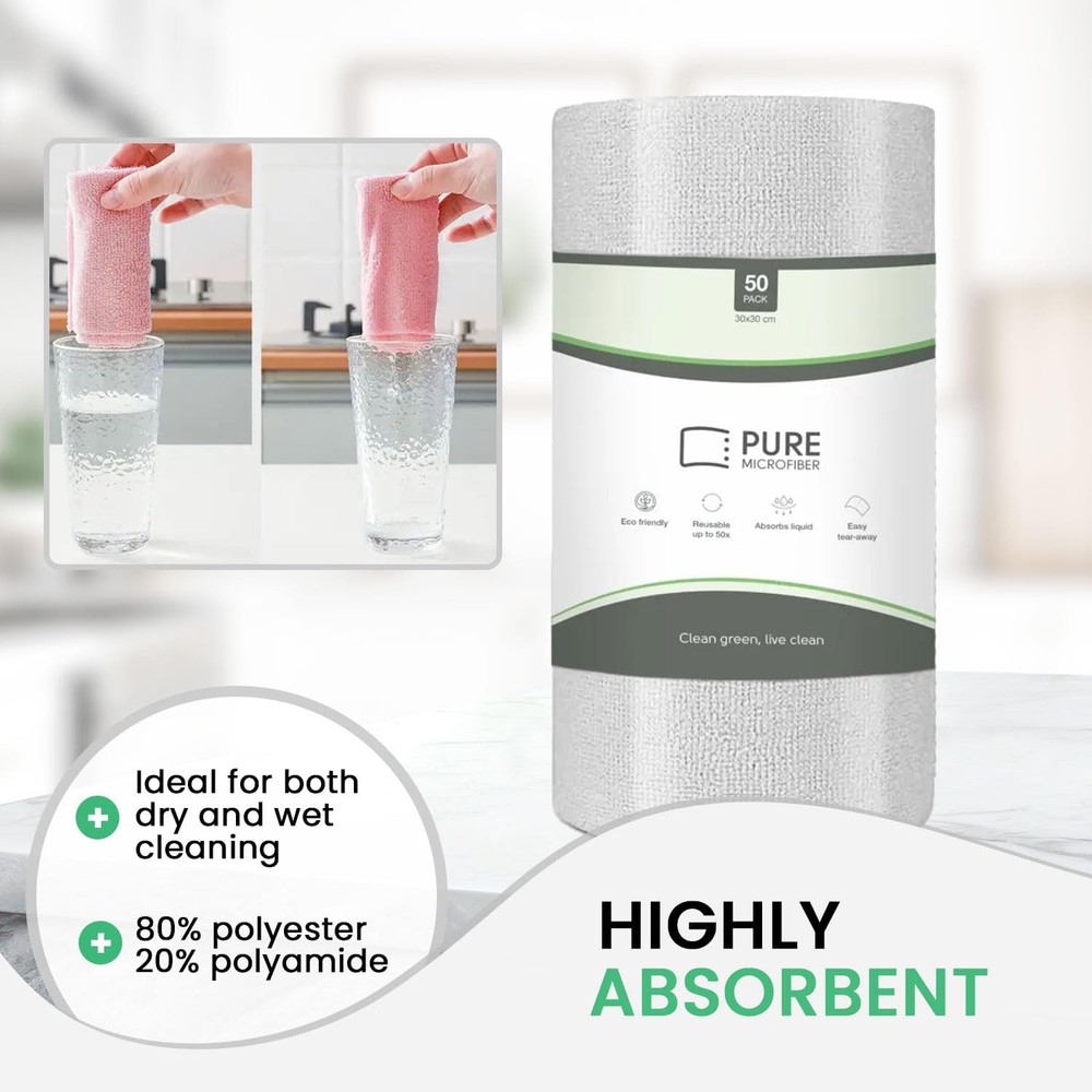 Reusable Paper Towel - Microfiber Cleaning Cloth Roll, Lint-Free, Pink Product Details Package Dimensions : 11.97 x 4.65 x 4.61 inches; 2.01 Pounds Item model number : 50pack Manufacturer : Pure Microfiber Country of Origin : China Brand: Pure Microfiber Unit Count: 50.0 Count Sheet Count: 50 Ply Rating: 180 gsm (grams per square meter) Special Feature: Super Absorbent, Odor Resistant, Lint Free 80% polyester, 20% polyamide [Lint-Free and Non-Abrasive]: Our microfiber cleaning cloth roll is designed to be lint-free and nonabrasive. Say goodbye to scratches and debris with our ultra-fine microfiber material. [Highly Absorbent and Durable]: These are highly absorbent and durable, ensuring they can handle even the toughest cleaning tasks. Ideal for both dry and wet cleaning, it offers exceptional performance. [Professional Quality]: Crafted with high-quality materials at 80% polyester and 20% polyamide. These towels are perfect for opticians, and photographers. Trust our towels to deliver a streak-free and spotless finish. [Eco-Friendly and Reusable]: Switch to our towel roll and reduce waste. These microfiber towels are washable and reusable, making them eco-friendly for households who care about the environment. [Multi-Purpose Cleaning Solution]: These are versatile for various cleaning tasks. Whether you need kitchen cleaning cloths or reusable microfiber towels, our microfibre cleaning cloths have you covered.