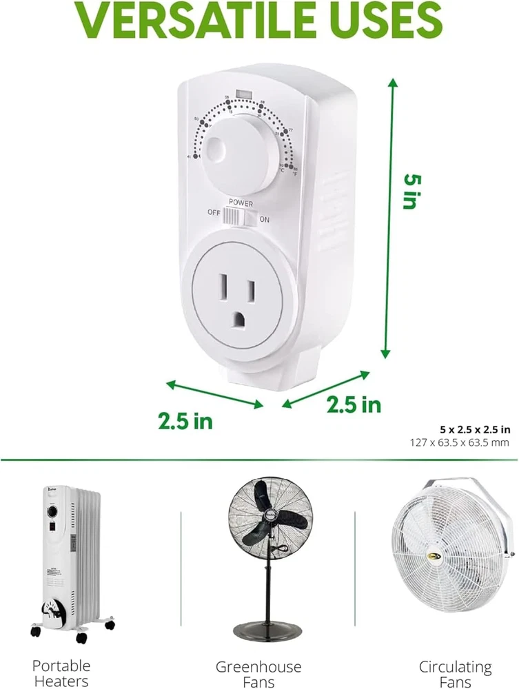 EASY TO OPERATE: Just plug in this adjustable thermostat, select heat / cool mode with the user-friendly switch and it will automatically turn on or off your heating or cooling devices through your preset target temperature. EFFORTLESS TEMPERATURE SETUP: This non-digital plugin thermostat comes with an adjustable temperature dial and the current temperature is displayed on the center for easy reference. Temperature control range is 41-86°F. SAVES YOU ON YOUR HOME ENERGY BILLS: You’re always a winner with this heating & cooling thermostat. It’s energy efficient while maintains a consistent ambient room temperature. VERSATILE USES: Suitable for most portable space heaters, air coolers, and circulating fans. Can also be used for refrigeration, fermentation, greenhouse fan and designed to suit almost any application you can imagine. SAFE & RELIABLE: This 3-Prong thermostat plug into a standard socket is ETL listed and rigorously tested for quality control and safety. Conforms to UL Std No. 60730-1, 60730-2-9. Rated Voltage is 125VAC 60Hz, Max Loading: 15A 1875W and has a recoverable overload short circuit. Dimensions: 5” x 2.5” x 2.5” Product Description
