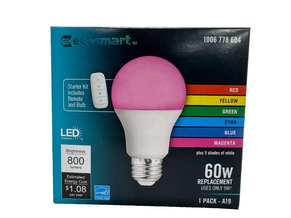 Ecosmart 60W LED Bulb, Color Changing A19 with Remote This energy efficient color changing A19 LED light bulb kit includes a Bluetooth remote that is used to control all the features of the bulb. The A19 LED bulb has several shades of white and a range of colors to choose from. Simply hold down the button on the included remote to change from Soft White (2700K) to Daylight (5000K). Another button on the remote, can be held down to cycle through 6 colors in a variety of shades. The LED A19 bulb is also dimmable via the included remote. Pair up to 15 bulbs to one remote. Light. Your Way. LED lightbulb uses 81% less energy compared to standard incandescent light bulb Energy Used: 9-watts (equivalent to a 60-Watt incandescent light bulb) Dimmable via included remote (not suitable for use with wall switch dimmers) Tunable White from 2700K to 5000K and Color changing 90 CRI ensures color accuracy and clarity for the highest quality of light available LED light bulb does not contain mercury Suitable for use in enclosed fixtures Estimated yearly energy cost: $1.08 (based on 3-hour/day, $0.11/kWh, costs depend on rates and use) Pair up to 15 bulbs to a single remote At GoodBye Retail, we take pride in delivering your orders promptly and efficiently. Please review the following shipping details to ensure a seamless shopping experience: Order Processing: Orders are processed and shipped within 24 business hours of your purchase. If your order is placed before 1 PM EST Monday through Friday, it will be shipped on the same day. Orders placed after 1 PM EST will be shipped the following business day. For orders made during the weekend (Saturday/Sunday), they will be shipped on the following Monday, excluding federal holidays. Shipping Options: We offer up to three (3) shipping options for most orders within the U.S.: Economy Shipping: This option allows the courier a maximum of 10 full business days for delivery. Standard Shipping: Typically, this method takes between 3-7 business days for delivery. Expedited Shipping: For those in a hurry, expedited shipping usually takes between 2-5 business days. Please select your preferred shipping method during the checkout process. Be mindful that once your order is placed, we are unable to modify the chosen shipping method. Delivery Estimates: While eBay provides estimated delivery dates, please note that these are approximations. Delays can occur due to factors beyond our control, such as extreme weather conditions, natural disasters, and peak seasonal demand. Shipping Carriers: To ensure the safe and efficient delivery of your orders, we utilize reputable carriers, including UPS Mail Innovations, FedEx Ground and SmartPost, and USPS. The choice of carrier is determined by the package's size and weight. For your convenience, please be aware that both UPS Mail Innovations and FedEx SmartPost handle the transportation of packages to your local USPS for final delivery. Rest assured, we dispatch all orders within 24 business hours. Tracking information may take up to 72 hours to be uploaded and synchronized between eBay and the courier's website. We appreciate your patience during this process. Signature Confirmation: For orders valued at more than $150, we include signature confirmation as an extra layer of security to ensure your package is delivered safely. Shipping Address: Once an order is placed, we regret that we cannot alter the shipping address. We strongly recommend verifying that your preferred shipping address is accurate before finalizing your purchase during checkout. At GoodBye Retail, your satisfaction is our priority. If you have any inquiries or require further assistance with your order, please do not hesitate to contact our dedicated customer support team. Before leaving negative feedback, we kindly request that you contact us. Our team is committed to resolving any issues with your order to ensure you have a positive shopping experience with us. Thank you for choosing GoodBye Retail. We appreciate your trust in us for your shopping needs. California Energy Commission Title 20 Compliant LED Light Bulb