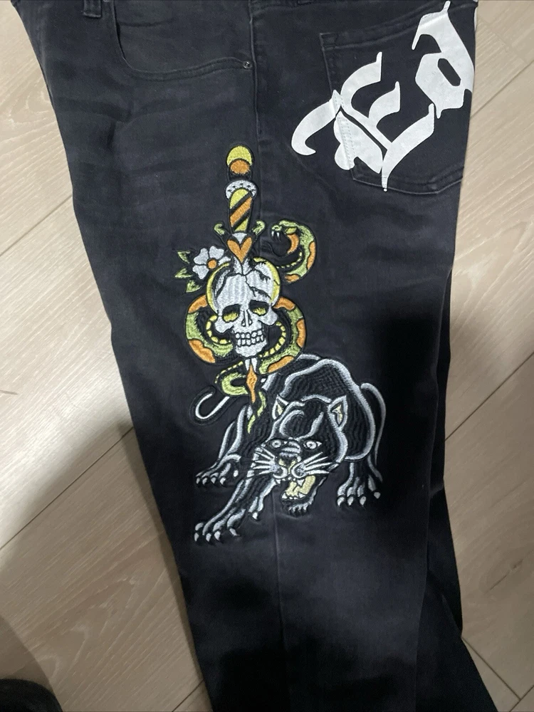 Ed Hardy Jeans Denim 5 Pocket Embroidered Skull Snake Panther Black Stretch Slim