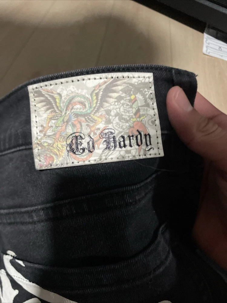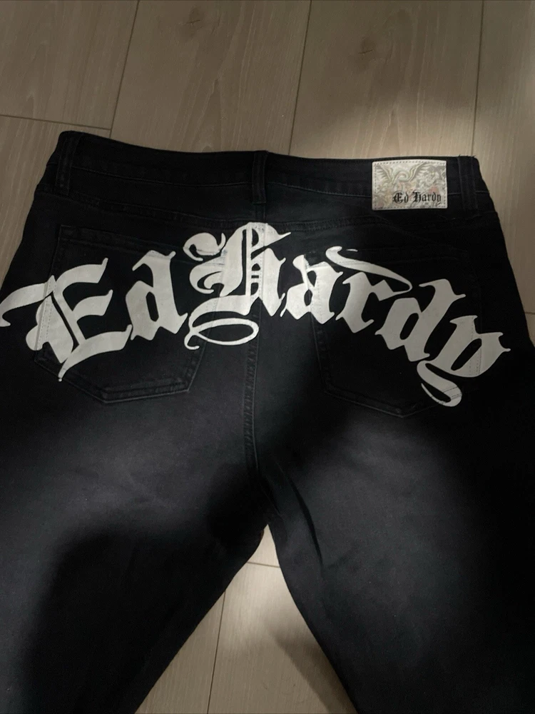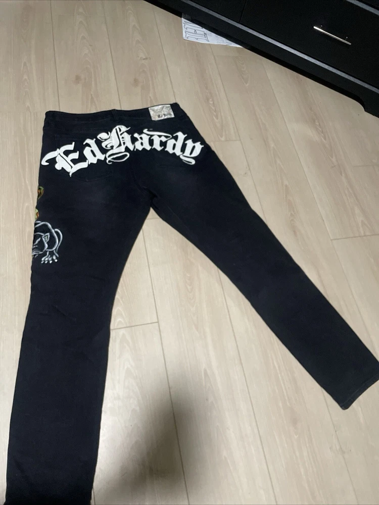 Brand: Ed Hardy Type: Jeans Handmade: No Personalize: No Rise: Mid (10-12 in) Color: Black Accents: Embroidered Fit: Slim Waist Size: Diplayed size + 1 inch Inseam: 32 in Size Type: Regular Size: 36 Features: Pockets, Slimming, Stretch Pocket Type: 5-Pocket Design Theme: Skull, Snakes Garment Care: Machine Washable Department: Men Fabric Wash: Dark Closure: Button, Zip Fabric Type: Denim Vintage: No Style: Tapered Pattern: Solid Season: Fall, Spring, Winter Material: Cotton, Polyester, Spandex, Other Fibers