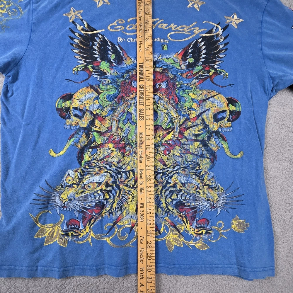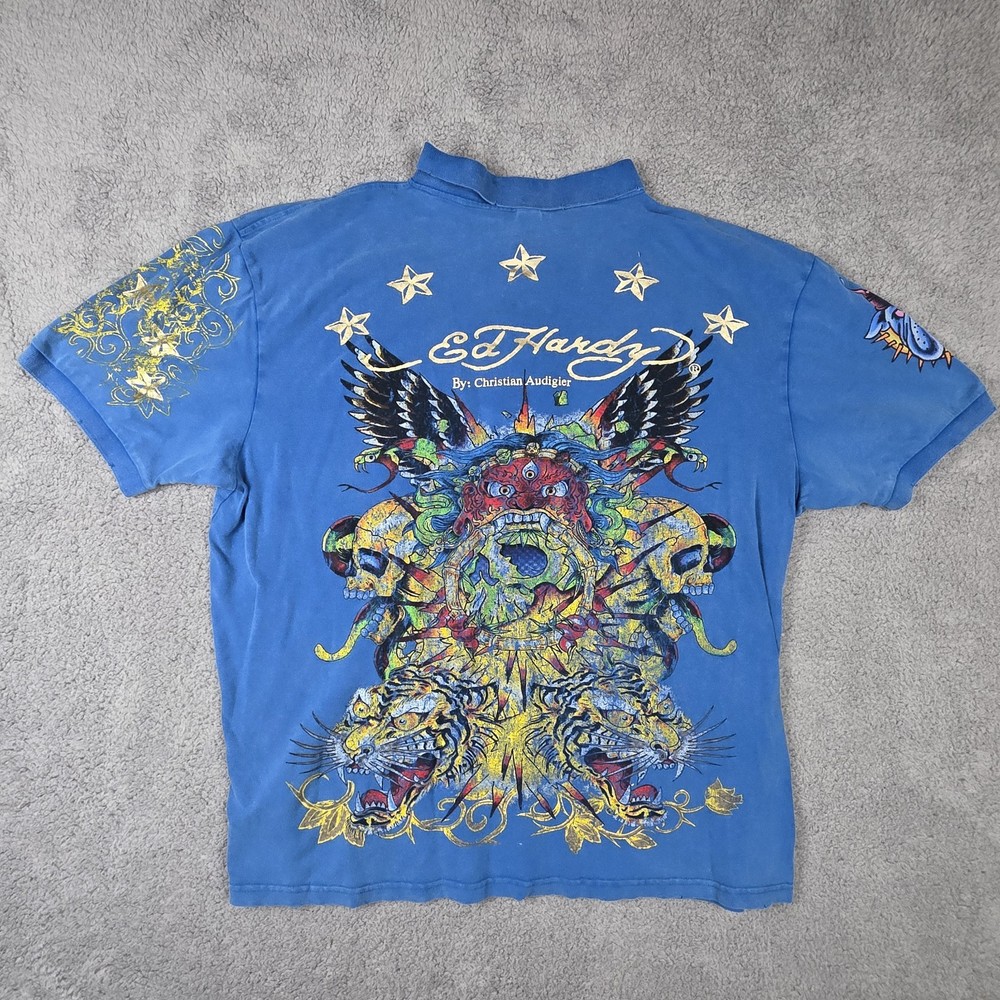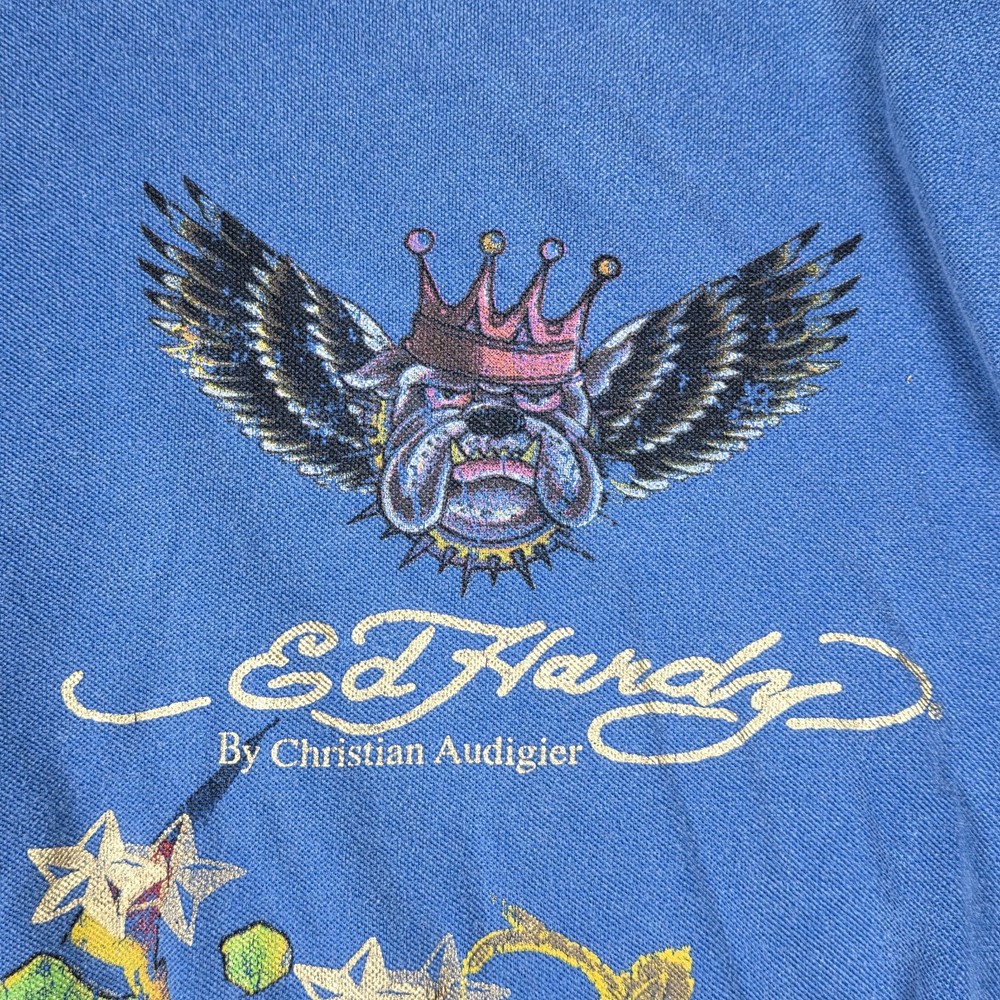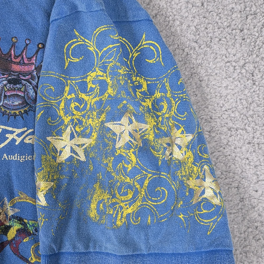 Ed Hardy Polo Shirt Mens 3XL, Pit to Pit 26", Shoulder to Hem 30" Blue Christian Audigier Tattoo Style All Over Print Good Condition, Slight Fade