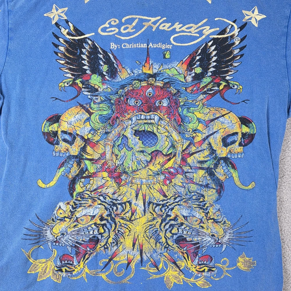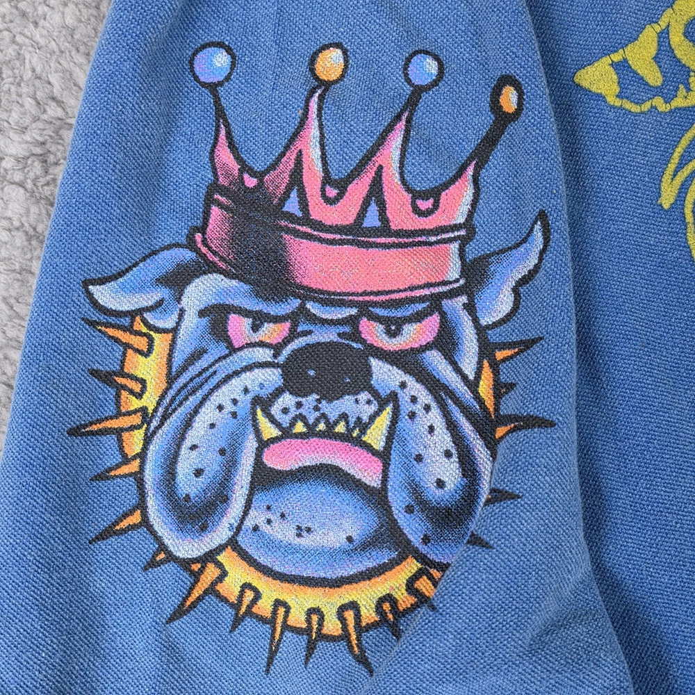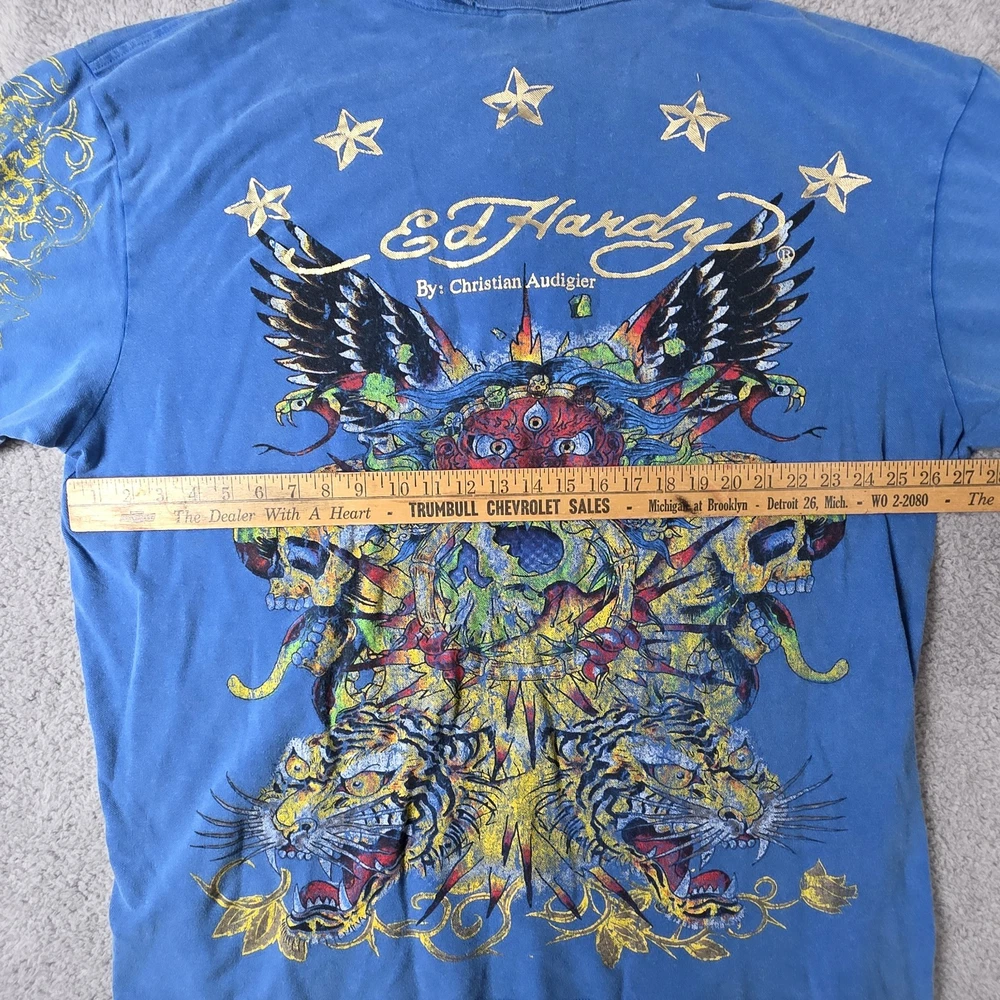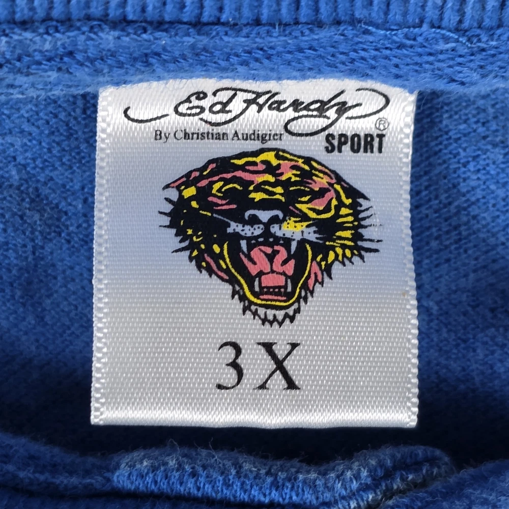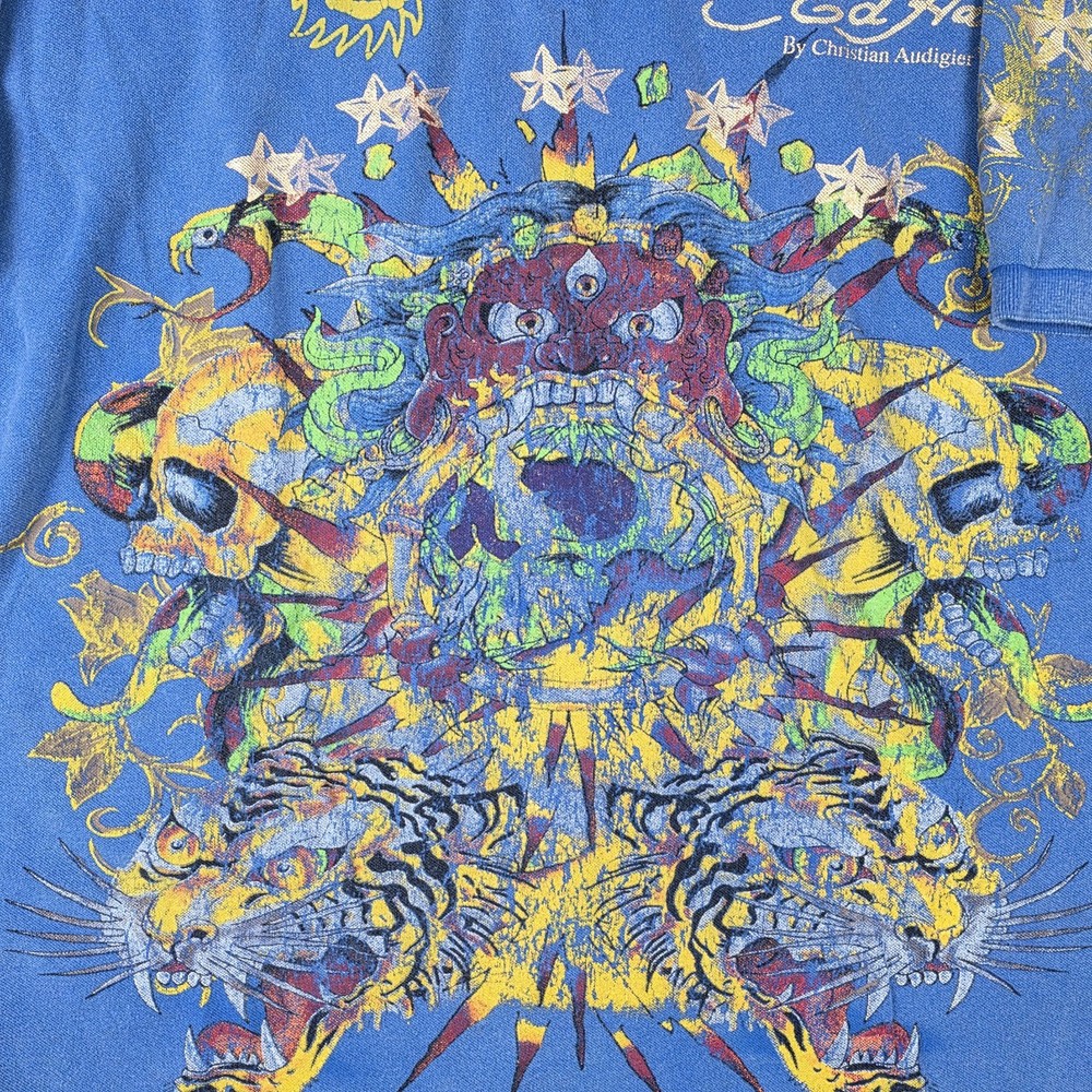 Ed Hardy Polo Shirt Mens 3XL, Pit to Pit 26", Shoulder to Hem 30" Blue Christian Audigier Tattoo Style All Over Print Good Condition, Slight Fade