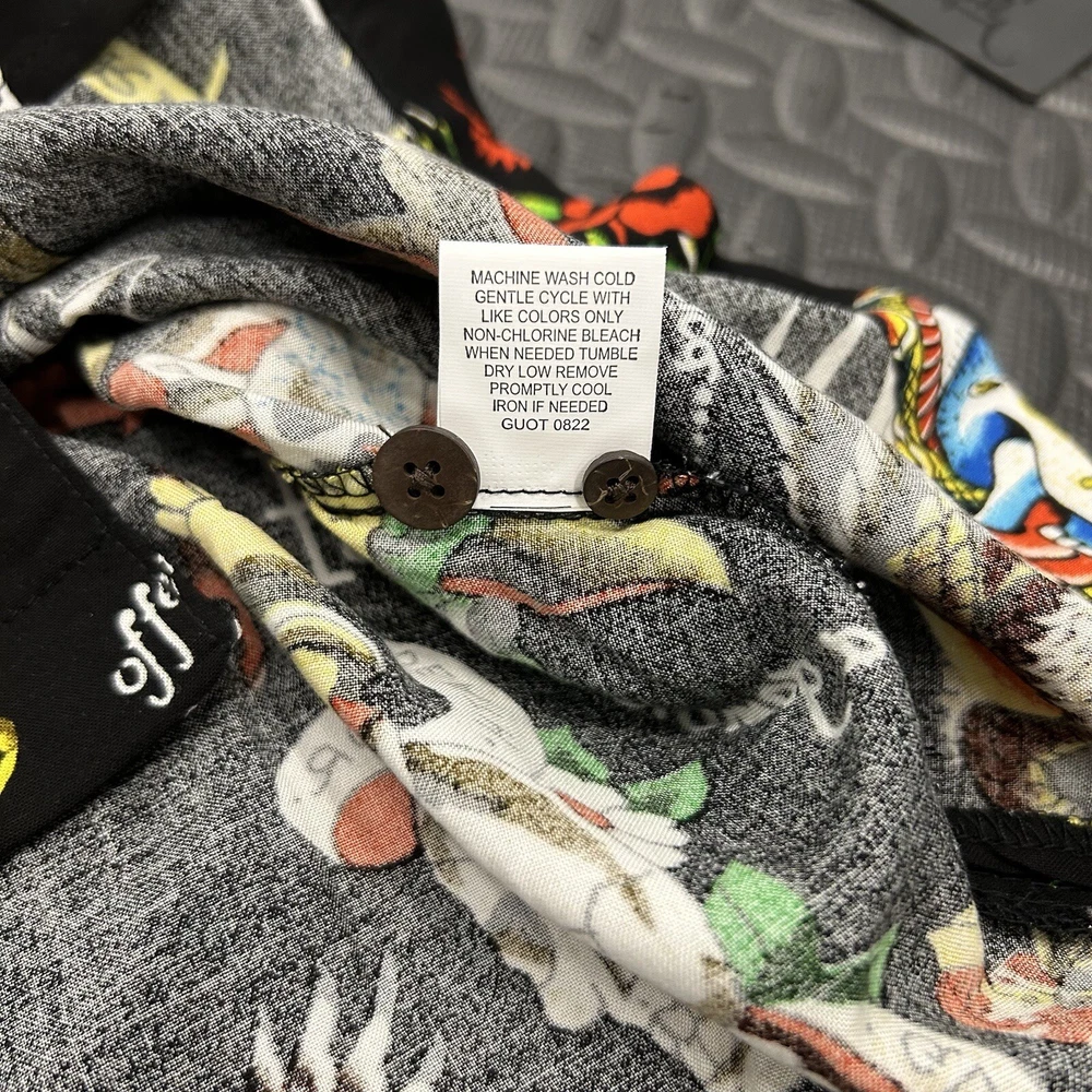 Stand out from the crowd with this Ed Hardy button-up shirt. Featuring a striking graphic print of skulls, birds and tattoos, this shirt is perfect for any occasion - from casual hangouts to workwear. The collared neckline and short sleeves with button closure make it ideal for summer, while the viscose material ensures it's lightweight and easy to care for. Add some personality to your wardrobe with this designer shirt. 100% Authentic. 100% Viscose. Made in China. In-Hand Ready to Ship. Brand New. Please see pics above for a closer look at product n measurements. All measurements are a close approximate. Legit Seller. Measurements: (Each is a real close approximate) Pit to Pit: 21.5” Shoulders: 17” Sleeve Length: 7.5” Hem: 21” Length: 28.25”