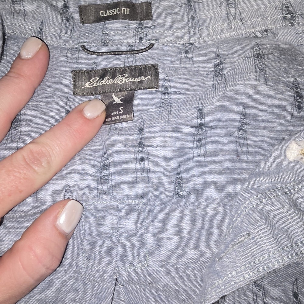 Eddie Bauer men's small outdoor-style shirt, suitable for activities such as kayaking, canoeing, and fishing. The shirt is in excellent condition, features a button-down design, and is a size small in a blue-grey color. Pre-owned, great condition Fast shipping. Reach out with questions & offers.