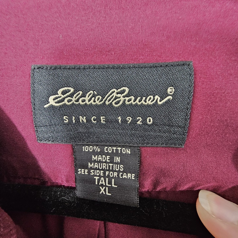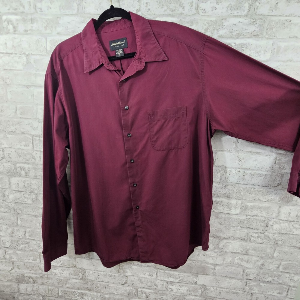 Eddie Bauer Maroon Long Sleeve Button Down Dress Shirt Size XL Tall Excellent pre-owned condition. No rips, tears or stains. See photos for best representation. Measures: Length 33" Width 26" Sleeve 27"