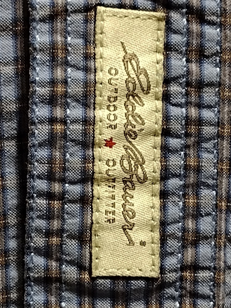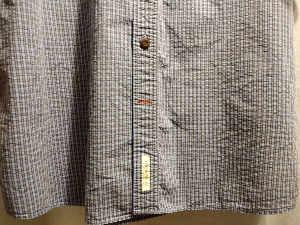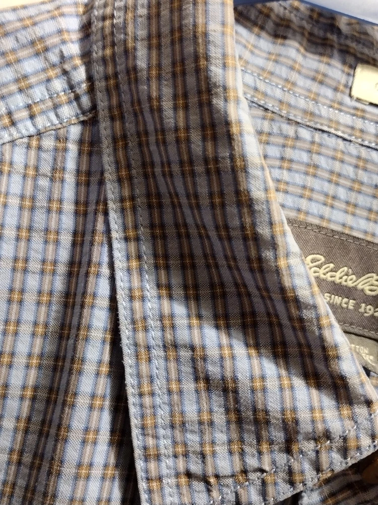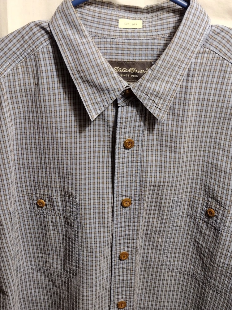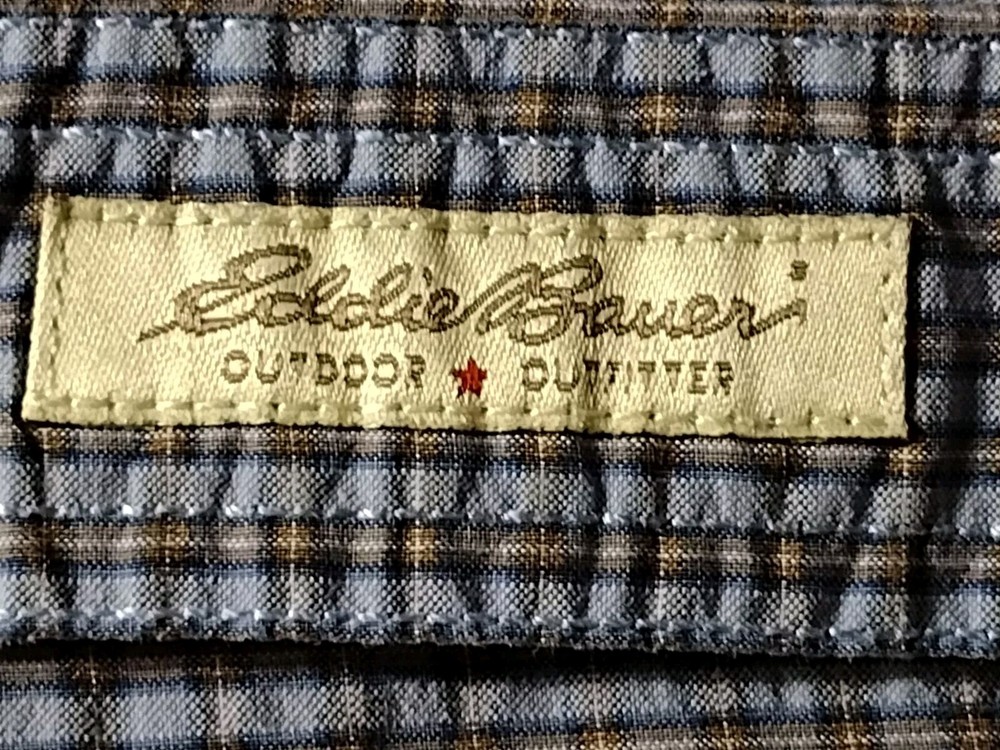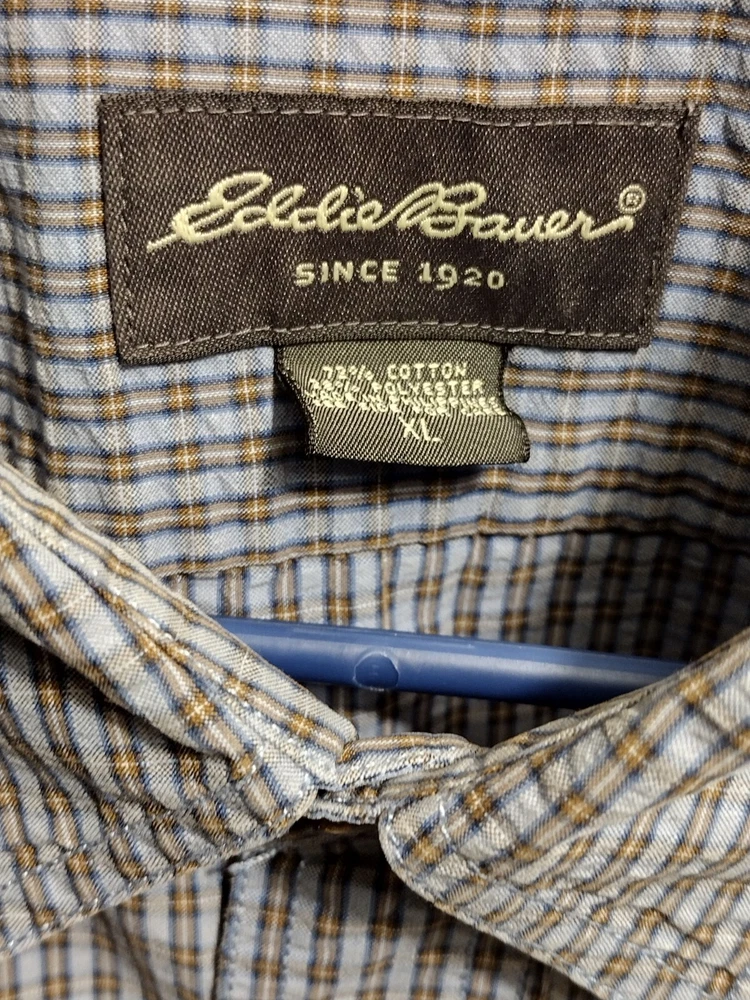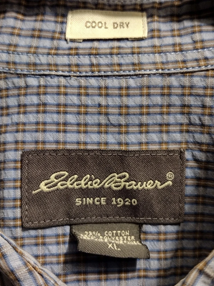 This Eddie Bauer shirt is a must-have for any fashion-forward man. Featuring a blue color and a check pattern, this shirt is perfect for any occasion, whether it's a casual day out or a business meeting. Made from a blend of polyester, nylon, and cotton, it is lightweight, packable, and stretchy, making it easy to care for and quick-drying. With a button-down collar and short sleeves, this shirt is perfect for any season, whether it's winter, summer, fall, or spring. It also features a mini check pocket and embroidered accents, adding a touch of style to an already stylish shirt. Whether you're a fan of punk, colorful, or preppy fashion, this Eddie Bauer shirt is sure to please.