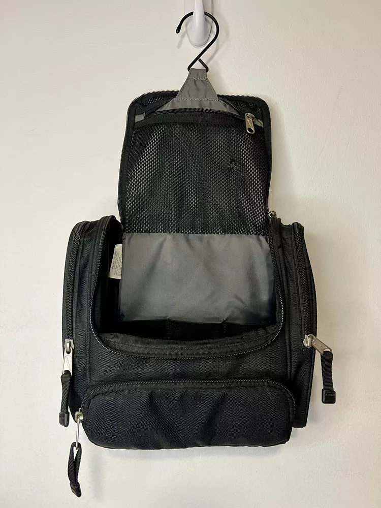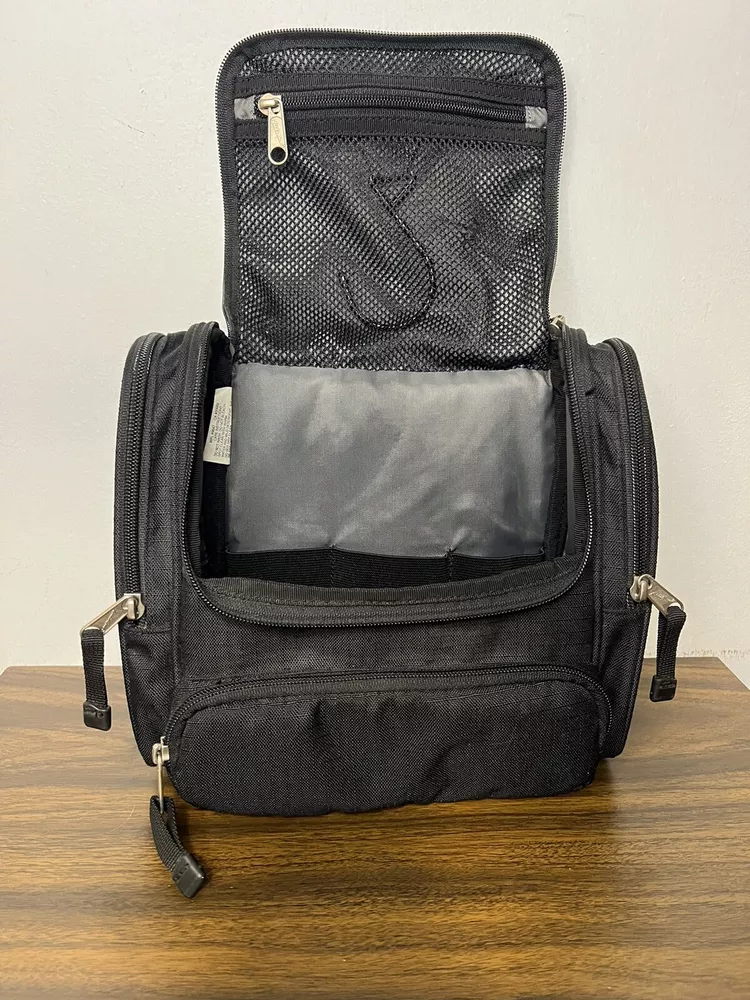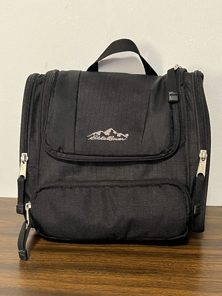 Eddie Bauer Toiletries Travel Bag. Black with inside Hanging Hook. Aside from the main compartment, it has a zippered pocket on the front and one on each side, and a hook and loop closure on the back. The main compartment has a mesh zippered enclosure on the flap that also holds the hook (please zoom in to see very small hole in mesh), 3 banded holders, and one mesh pocket on each side. Please take the time to carefully review all photos and ask any questions prior to purchase. Pictures are actual photos of the item you will receive. I do my best to describe colors but please be aware that color descriptions are my opinion, also cameras and lighting can make items appear slightly brighter or darker than reality. Pre-owned items are cleaned appropriately. Clothing is laundered. Other items are spot cleaned or disinfected whenever possible and to the best of my ability. Shipping: We ship items within 3 business days, but typically in less than 24 hours. Returns: Most of our listings are pre-owned items. They may show signs of wear or use. Items are inspected carefully and we don’t sell things we wouldn’t personally be happy with. We try to be accurate in noting obvious flaws. However, If something is received not as you expected, please contact us. Thank you