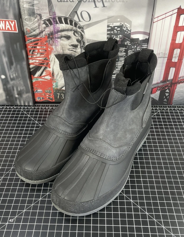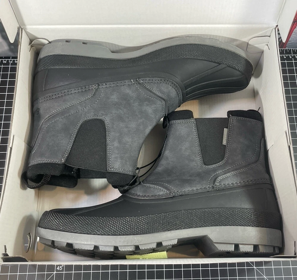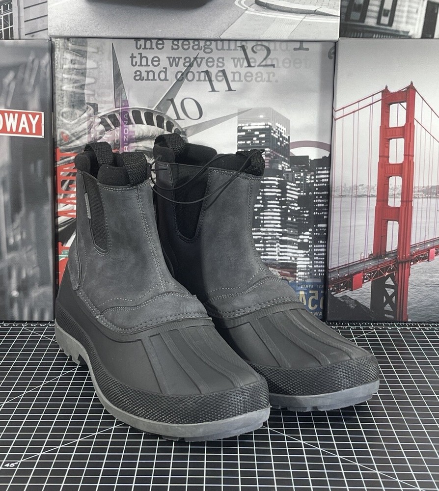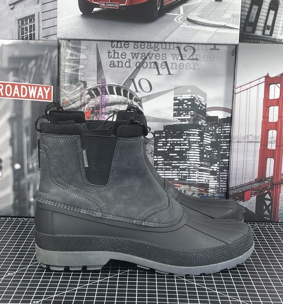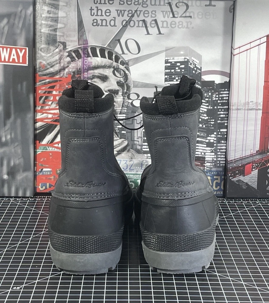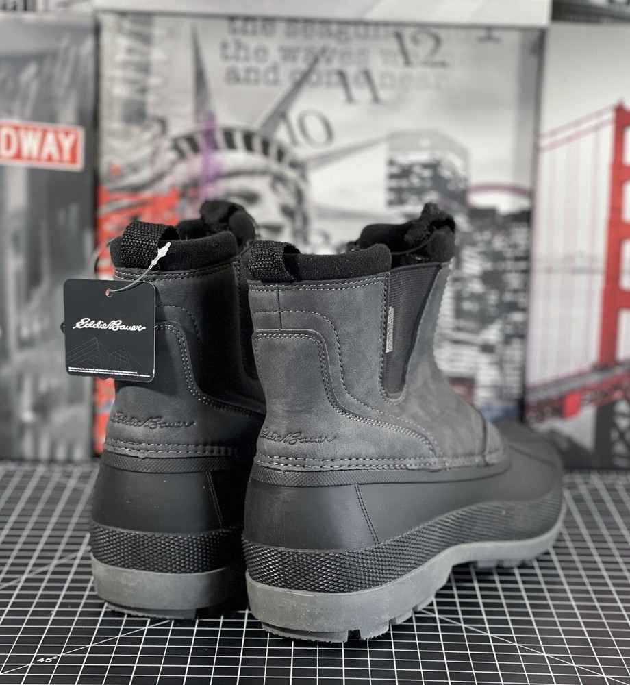 Eddie Bauer Size 11 Mens Dark Grey Paisley Waterproof #287978 Winter Boots NEW • NEW WITH BOX • NEVER WORN • MENS SIZE 11 US Elevate your winter style with these Eddie Bauer paisley snow boots. These boots feature a striking paisley pattern in black and grey, accented by the Eddie Bauer logo. The waterproof suede, polyurethane, and synthetic upper, combined with a rubber outsole, make these boots perfect for any winter or fall activity, whether it's work or play. Pull-on closure and foam insole provide both comfort and convenience, while the handmade design ensures that each pair is unique. Available in size 10 (UK) and 11 (US), these boots are a must-have for any fashion-forward man. Add them to your activewear or workwear collection today!