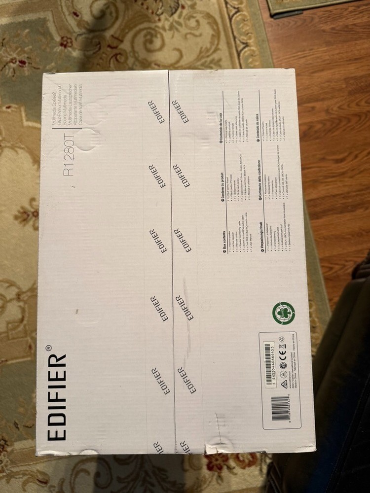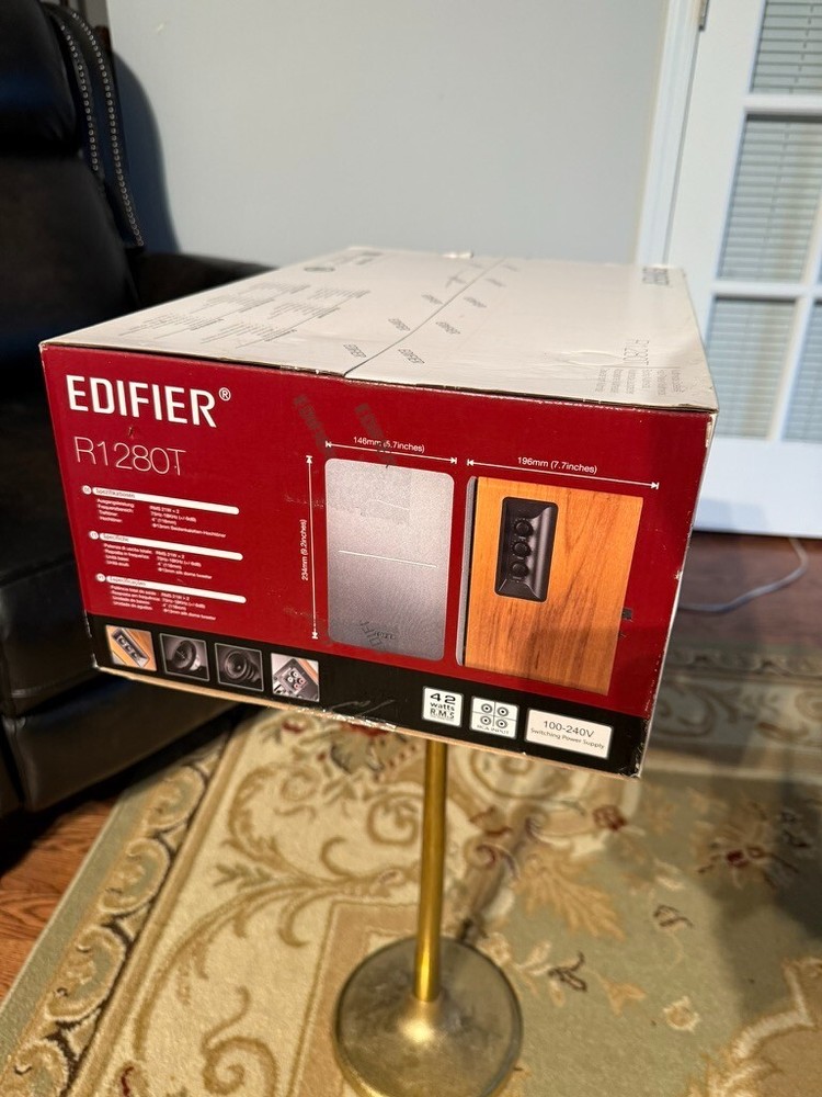 The Edifier R1280T Powered Bookshelf Speakers are a 2-way 2.0 system with a total RMS power of 42W. They are in a brown color, featuring stereo L/R RCA audio inputs for wired connectivity. These speakers are from the brand Edifier and are ideal for home audio setups. Bought for $120. Will sell immediately for $85.