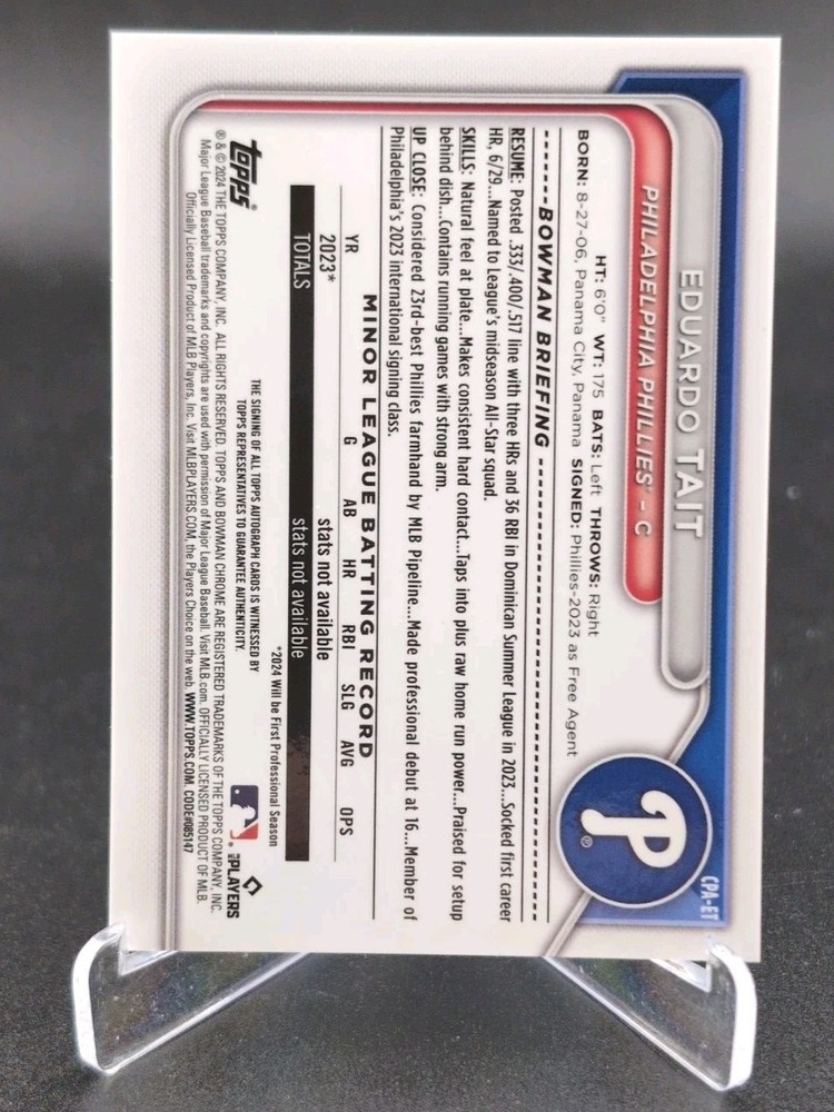 The product is a 2024 Bowman Chrome trading card featuring Prospect Autographs 1st Bowman On-Card Auto of Major League Baseball player Eduardo Tait. Autographed by Tait himself and authenticated by Topps, this rookie insert card is a sought-after collectible for fans of the Philadelphia Phillies. With a hard-signed autograph and numbered CPA-ET, this card is a valuable addition to any baseball card collection.