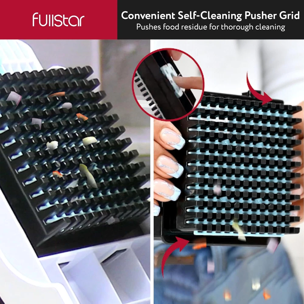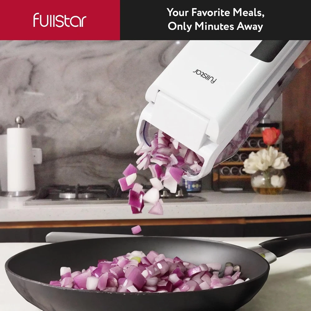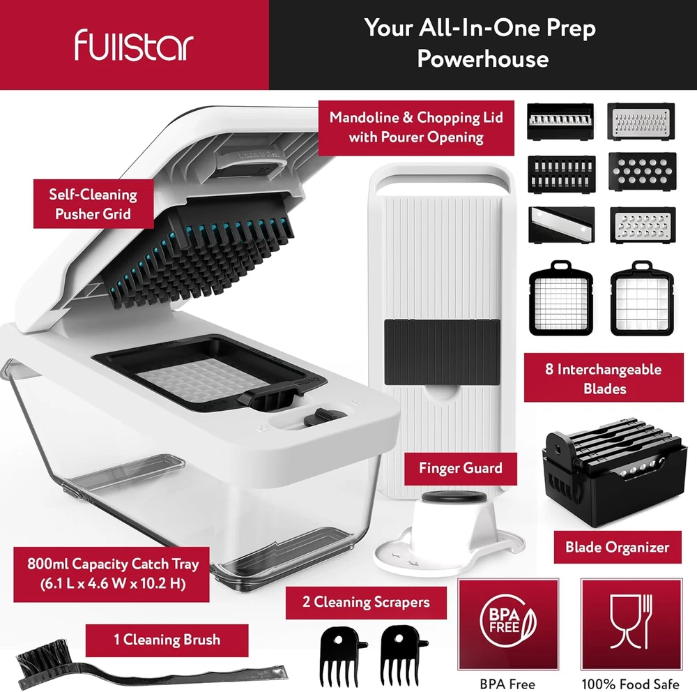 Convenient Pouring Veggie Slicer - Say goodbye to spills! Our dicer chopper's convenient pouring feature lets you easily add chopped veggies straight into your dish without lifting the lid or disassembling. This is the perfect food chopper with container for prepping salad bowls, stir-fries, and more. 8 Interchangeable Precision Blades - Comes with 2 chopping blades (fine and large dicer) and 6 slicing blades: julienne, coarse grater, fine grater, zester, slicer, and an exclusive wavy blade not found in other vegetable chopper with container. These versatile blades deliver precision to your kitchen for creating gourmet salads, perfectly diced vegetables, and decorative garnishes. Innovative Self-Cleaning Pusher Grid - No mess, no stress! Our onion chopper's innovative self-cleaning grid pushes food residue forward for easy removal from the blades. Prep with ease and clean up in seconds with Fullstar's innovative vegetable slicer. Large Catch Tray with Dual-Lid - The Fullstar vegetables slicer comes with a large 800ml capacity tray for easy ingredient collection. Easily switch between slicing and dicing using dual lids: one slim mandoline slicer and one robust chopper, each designed for specific blades. With this potato slicer, you get the perfect tool for every prep. Effortless Cleanup and Safe Storage - Our BPA-free cucumber slicer vegetable cutter comes with 2 cleaning scrapers, a cleaning brush, and a finger guard for safety. Plus, it's top-rack dishwasher safe! The included blade organizer ensures everything stays tidy and sharp, ready for your next culinary adventure. Fullstar 8 blade chopper and mandoline with pouring feature
