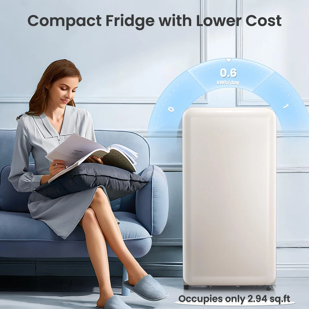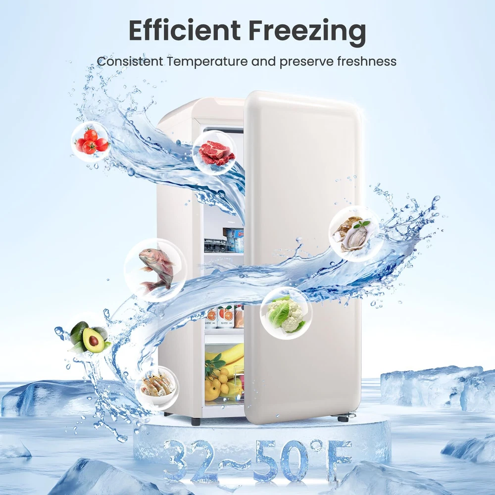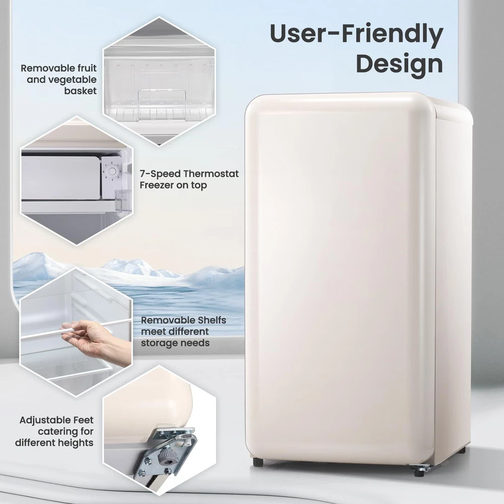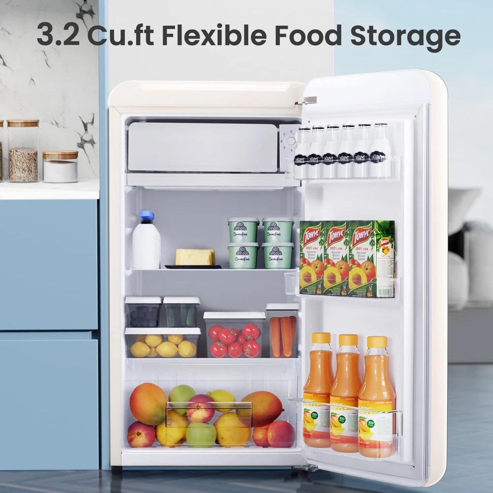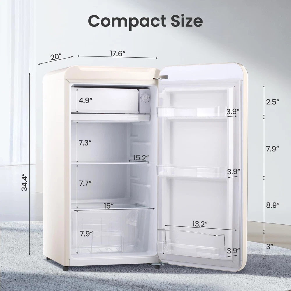 Description: Electactic 3.2 cubic foot tiny refrigerator is ideal for your home, business, or any other location! Our small fridge allows you to keep your favorite beverages cold while taking up little room and consuming low energy. This refrigerator can quickly cool from 32°F to 50°F thanks to its high-quality compressor and superior sealing technology. You may also regulate the temperature with the built-in temperature control knob, which has 7 settings. Food of various sizes and heights can be stored on the movable glass shelves. In addition, the top of the door has a recessed door handle that reduces bumping and enhances its appearance. Furthermore, this refrigerator operates quietly, so it won't disrupt your everyday routine. Feature: Large capacity refrigerator offers ample space for food and beverage Non-toxic and high quality ABS material ensures safety and durability Removable glass shelves provide flexible internal storage space High-quality compressor ensures fast and efficient cooling Magnetic gasket helps to close the door tightly and conveniently Compact fridge takes up little space and consumes low energy 4 adjustable feet effectively improve overall stability Quiet operation with a low noise level of 42dB Specification: Color: Black/White/Green Material: ABS Capacity: 3.2 cu.ft. Product Dimension: 17.6" x 20.0" x 34.4" (L x W x H) Control Method: Mechanical Voltage: 115V/60Hz Refrigerant: R600a/20g±0.5g Cooling Range: 32℉~50℉/ 0℃~10℃ Noise Level: ≤42dB Net Weight: 48.4 lbs Package includes:1 x Refrigerator, 1 x Instruction 【Compact Size with Ample Storage Space】Electactic 3.2 cu.ft (91L) mini retro fridge has separate storage space, including an ice compartment, a drip tray, adjustable shelf, bottle racks, a defrost button and a Freshness drawer. Freezer on top, which is convenient for extra storage or making ice cubes. 17.64" (L) x 20.00" (W) x 34.41" (H) Small stature to accommodate all your daily needs! 【7 Adjustable Temperature Settings】Mini fridge comes with 7 temperature settings: "1-7" from 32°F to 50°F (0°C to 10°C), the larger the temperature control number the colder it is. The "3" setting should be suitable for home or office use. Small refrigerators usually choose settings 32°F to keep food fresh and a mini fridge with freezer is very energy efficient. 【Energy Saving& Low Noise】The mini fridge is equipped with an R600a compressor with high efficiency and low consumption, cooling quickly, and the consumption is as low as 0.6 kWh per day. In addition, the small refrigerator operates at 40 decibels, and you will hardly notice it is there. Mini fridge with freezer is an ideal appliance for bedroom, office, dorm, apartment or RV. 【Retro Design Embellish Your Home】Mini refrigerator has a rounded shape, smooth lines, full of color, a variety of colors retro elegance, while the corners of the refrigerator are rounded R corner design with gentle arc, sophisticated texture. 【Easy to Install】The compact refrigerator has 4 adjustable horizontal legs, so you can easily install and use it. Thickened door seal has good sealing to protect the freshness of ingredients. It is recommended to clean the mini fridge once a month.